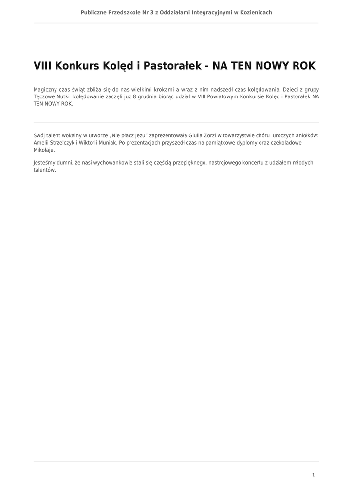 Publiczne Przedszkole Nr 3 z Oddziałami Integracyjnymi w Kozienicach VIII Konkurs Kolęd i Pastorałek - NA TEN NOWY ROK Magiczny czas świąt zbliża się do nas wielkimi krokami a wraz z nim nadszedł czas kolędowania. Dzieci z grupy Tęczowe Nutki kolędowanie zaczęli już 8 grudnia biorąc udział w VIII Powiatowym Konkursie Kolęd i Pastorałek NA TEN NOWY ROK. Swój talent wokalny w utworze „Nie płacz Jezu” zaprezentowała Giulia Zorzi w towarzystwie chóru uroczych aniołków: Amelii Strzelczyk i Wiktorii Muniak. Po prezentacjach przyszedł czas na pamiątkowe dyplomy oraz czekoladowe Mikołaje. Jesteśmy dumni, że nasi wychowankowie stali się częścią przepięknego, nastrojowego koncertu z udziałem młodych talentów. 1