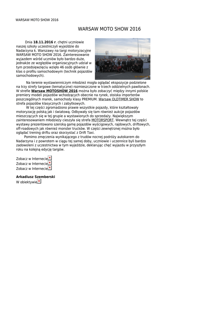 WARSAW MOTO SHOW 2016 WARSAW MOTO SHOW 2016 Dnia 18.11.2016 r. chętni uczniowie naszej szkoły uczestniczyli wyjeździe do Nadarzyna k. Warszawy na targi motoryzacyjne WARSAW MOTO SHOW 2016. Zainteresowanie wyjazdem wśród uczniów było bardzo duże, jednakże ze względów organizacyjnych udział w tym przedsięwzięciu wzięło 46 osób głównie z klas o profilu samochodowym (technik pojazdów samochodowych). Na terenie wystawienniczym młodzież mogła oglądać ekspozycje podzielone na trzy strefy targowe (tematyczne) rozmieszczone w trzech oddzielnych pawilonach. W strefie Warsaw MOTOSHOW 2016 można było zobaczyć między innymi polskie premiery modeli pojazdów wchodzących obecnie na rynek, stoiska importerów poszczególnych marek, samochody klasy PREMIUM. Warsaw OLDTIMER SHOW to strefa pojazdów klasycznych i zabytkowych. W tej części zgromadzono prawie wszystkie pojazdy, które kształtowały motoryzację polską jak i światową. Odbywały się tam również aukcje pojazdów mieszczących się w tej grupie a wystawionych do sprzedaży. Największym zainteresowaniem młodzieży cieszyła się strefa MOTORSPORT. Wewnątrz tej części wystawy prezentowano szeroką gamę pojazdów wyścigowych, rajdowych, driftowych, off-roadowych jak również monster trucków. W części zewnętrznej można było oglądać trening driftu oraz skorzystać z Drift Taxi. Pomimo zmęczenia wynikającego z trudów nocnej podróży autokarem do Nadarzyna i z powrotem w ciągu tej samej doby, uczniowie i uczennice byli bardzo zadowoleni z uczestnictwa w tym wyjeździe, deklarując chęć wyjazdu w przyszłym roku na kolejną edycję targów. Zobacz w Internecie Zobacz w Internecie Zobacz w Internecie Arkadiusz Szemberski W obiektywie