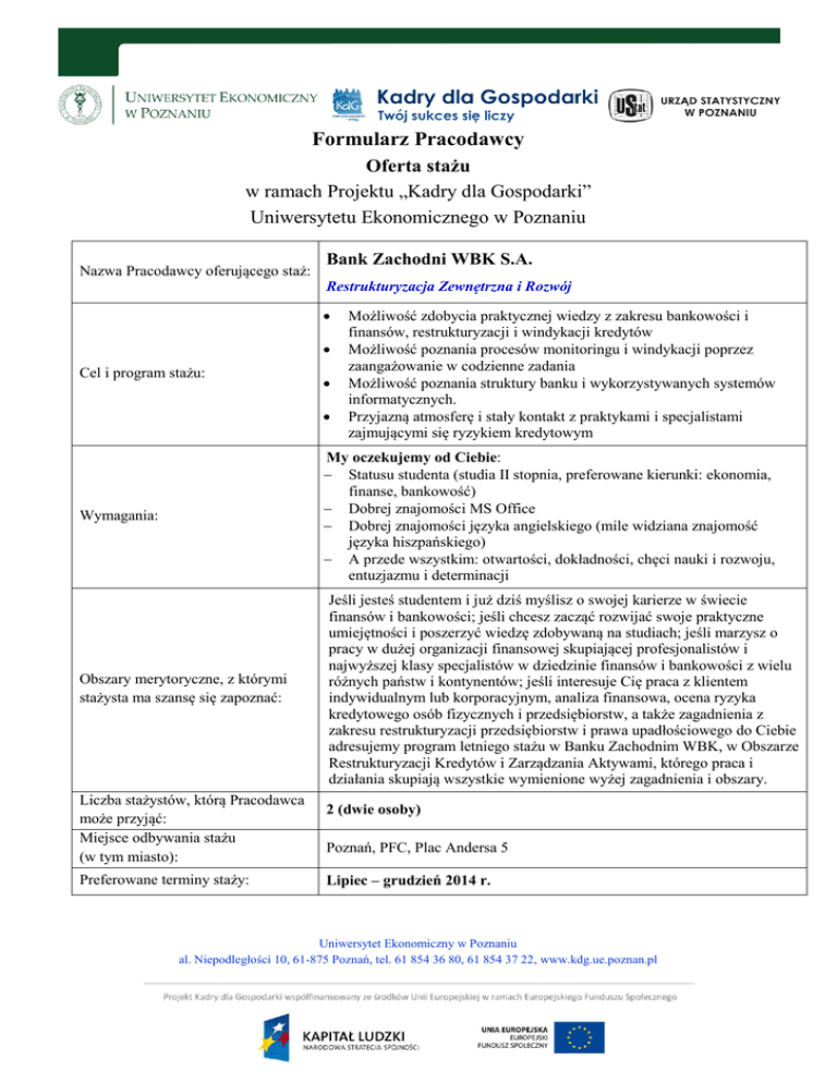 Formularz Pracodawcy Oferta stażu w ramach Projektu „Kadry dla Gospodarki” Uniwersytetu Ekonomicznego w Poznaniu Nazwa Pracodawcy oferującego staż: Bank Zachodni WBK S.A. Restrukturyzacja Zewnętrzna i Rozwój Cel i program stażu: Możliwość zdobycia praktycznej wiedzy z zakresu bankowości i finansów, restrukturyzacji i windykacji kredytów Możliwość poznania procesów monitoringu i windykacji poprzez zaangażowanie w codzienne zadania Możliwość poznania struktury banku i wykorzystywanych systemów informatycznych. Przyjazną atmosferę i stały kontakt z praktykami i specjalistami zajmującymi się ryzykiem kredytowym My oczekujemy od Ciebie: Statusu studenta (studia II stopnia, preferowane kierunki: ekonomia, finanse, bankowość) Dobrej znajomości MS Office Dobrej znajomości języka angielskiego (mile widziana znajomość języka hiszpańskiego) A przede wszystkim: otwartości, dokładności, chęci nauki i rozwoju, entuzjazmu i determinacji Wymagania: Obszary merytoryczne, z którymi stażysta ma szansę się zapoznać: Liczba stażystów, którą Pracodawca może przyjąć: Miejsce odbywania stażu (w tym miasto): Preferowane terminy staży: Jeśli jesteś studentem i już dziś myślisz o swojej karierze w świecie finansów i bankowości; jeśli chcesz zacząć rozwijać swoje praktyczne umiejętności i poszerzyć wiedzę zdobywaną na studiach; jeśli marzysz o pracy w dużej organizacji finansowej skupiającej profesjonalistów i najwyższej klasy specjalistów w dziedzinie finansów i bankowości z wielu różnych państw i kontynentów; jeśli interesuje Cię praca z klientem indywidualnym lub korporacyjnym, analiza finansowa, ocena ryzyka kredytowego osób fizycznych i przedsiębiorstw, a także zagadnienia z zakresu restrukturyzacji przedsiębiorstw i prawa upadłościowego do Ciebie adresujemy program letniego stażu w Banku Zachodnim WBK, w Obszarze Restrukturyzacji Kredytów i Zarządzania Aktywami, którego praca i działania skupiają wszystkie wymienione wyżej zagadnienia i obszary. 2 (dwie osoby) Poznań, PFC, Plac Andersa 5 Lipiec – grudzień 2014 r. Uniwersytet Ekonomiczny w Poznaniu al. Niepodległości 10, 61-875 Poznań, tel. 61 854 36 80, 61 854 37 22, www.kdg.ue.poznan.pl