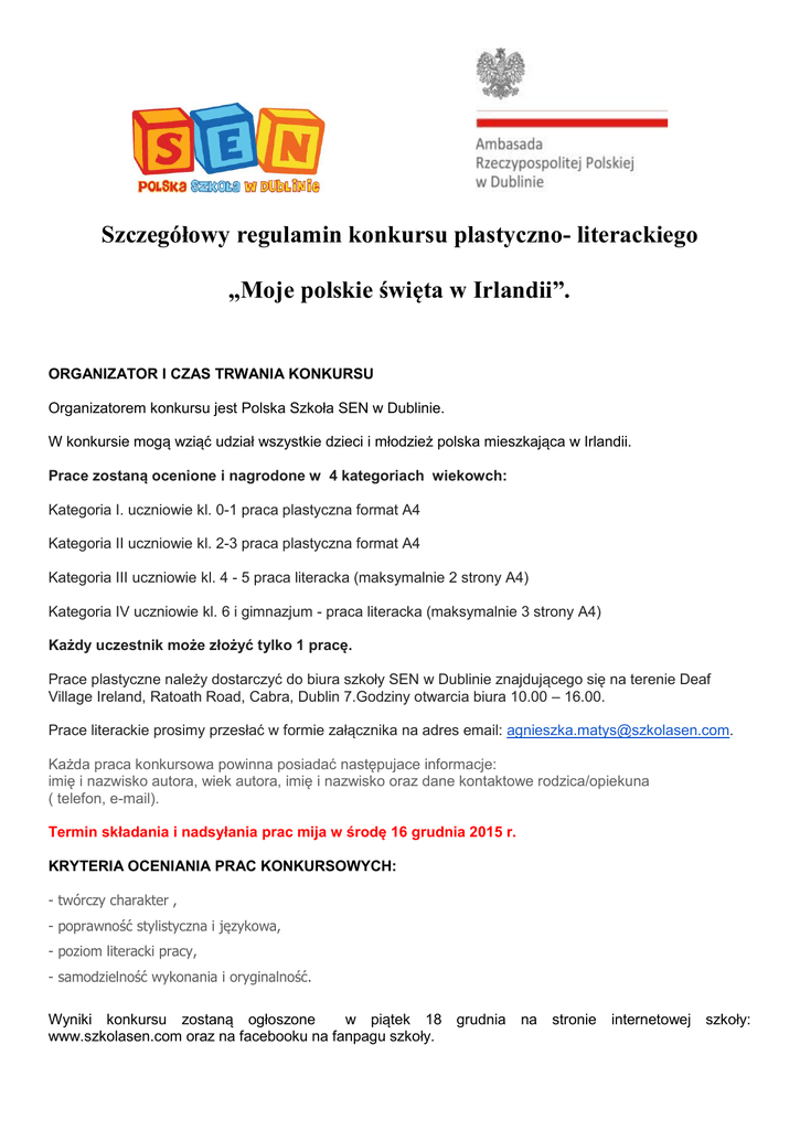 Szczegółowy regulamin konkursu plastyczno- literackiego „Moje polskie święta w Irlandii”. ORGANIZATOR I CZAS TRWANIA KONKURSU Organizatorem konkursu jest Polska Szkoła SEN w Dublinie. W konkursie mogą wziąć udział wszystkie dzieci i młodzież polska mieszkająca w Irlandii. Prace zostaną ocenione i nagrodone w 4 kategoriach wiekowch: Kategoria I. uczniowie kl. 0-1 praca plastyczna format A4 Kategoria II uczniowie kl. 2-3 praca plastyczna format A4 Kategoria III uczniowie kl. 4 - 5 praca literacka (maksymalnie 2 strony A4) Kategoria IV uczniowie kl. 6 i gimnazjum - praca literacka (maksymalnie 3 strony A4) Każdy uczestnik może złożyć tylko 1 pracę. Prace plastyczne należy dostarczyć do biura szkoły SEN w Dublinie znajdującego się na terenie Deaf Village Ireland, Ratoath Road, Cabra, Dublin 7.Godziny otwarcia biura 10.00 – 16.00. Prace literackie prosimy przesłać w formie załącznika na adres email: [email protected]. Każda praca konkursowa powinna posiadać następujace informacje: imię i nazwisko autora, wiek autora, imię i nazwisko oraz dane kontaktowe rodzica/opiekuna ( telefon, e-mail). Termin składania i nadsyłania prac mija w środę 16 grudnia 2015 r. KRYTERIA OCENIANIA PRAC KONKURSOWYCH: - twórczy charakter , - poprawność stylistyczna i językowa, - poziom literacki pracy, - samodzielność wykonania i oryginalność. Wyniki konkursu zostaną ogłoszone w piątek 18 grudnia www.szkolasen.com oraz na facebooku na fanpagu szkoły. na stronie internetowej szkoły: Rozdanie nagród odbędzie się w sobotę 19 grudnia 2015 r. w szkole SEN w Dublinie i będzie połączone z uroczystą Wigilią szkolną. Laureaci będą powiadomieni drogą telefoniczną lub e-mailową. Uczestnicy wyrażają zgodę na opublikowanie danych osobowych oraz uzyskanych wyników na stronie internetowej i na fanpagu szkoły SEN. We wszystkich sprawach nieuregulowanych regulaminem decyduje jury konkursu.