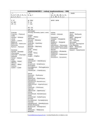 -i b, d, f, ch, ł, m, n, p, s, t, w, z NARODOWOŚCI - rodzaj męskoosobowy - ONI -y -e - owie k, g, r sz, cz, dz, dż, ż, rz, ś, ć, dź, ź, ń, l, j t: ci d: dzi ch: si g: dzy k: cy r: rzy anin: anie ec: cy ca: cy Francja Francuz – Francuzi Indie Hindus - Hindusi Litwa Litwin – Litwini Białoruś Białorusin – Białorusini Rumunia Rumun – Rumuni Szwecja Szwed - Szwedzi Chorwacja Chorwat – Chorwaci Szkocja Szkot – Szkoci Azja Azjata - Azjaci Włochy Włoch – Włosi Czechy Czech – Czesi Norwegia Norweg–Norwedzy (patrz: owie) Polska Polak – Polacy Słowacja Słowak – Słowacy Austria Austriak - Austriacy Bośnia Bośniak – Bośniacy Grecja Grek - Grecy Turcja Turek - Turcy Anglia Anglik – Anglicy Łotwa Łotysz - Łotysze Hiszpania Hiszpan - Hiszpanie Rosja Rosjanin – Rosjanie Meksyk Meksykanin - Meksykanie Stany Zjednoczone (USA) Amerykanin– Amerykanie Afryka Afrykanin - Afrykanie Mołdawia Mołdawian – Mołdawianie Korsyka Korsykanin - Korsykanie Islandia Islandczyk – Islandczycy Izrael Izraelczyk - Izraelczycy Portugalia Portugalczyk – Portugalczycy Irlandia Irlandczyk – Irlandczycy Dania Duńczyk – Duńczycy Estonia Estończyk – Estończycy Macedonia Macedończyk- Macedończycy Argentyna Argentyńczyk - Argentyńczycy Chiny Chińczyk – Chińczycy Japonia Japończyk - Japończycy Korea Koreańczyk -Koreańczycy Kuba Kubańczyk - Kubańczycy Europa Europejczyk - Europejczycy Kanada Kanadyjczyk - Kanadyjczycy Wielka Brytania Brytyjczyk – Brytyjczycy Walia Walijczyk – Walijczycy Brazylia ©[email protected] / jezykpolskijakoobcy.wordpress.com Serbia Serb – Serbowie Belgia Belg – Belgowie Finlandia Fin – Finowie Norwegia Norweg – Norwegowie Kraj Basków Bask – Baskowie Kazachstan Kazach - Kazachowie Brazylijczyk – Brazylijczycy Australia Australijczyk - Australijczycy Holandia Holender – Holendrzy Szwajcaria Szwajcar – Szwajcarzy Bułgaria Bułgar – Bułgarzy Węgry Węgier – Węgrzy Niemcy Niemiec – Niemcy Ukraina Ukrainiec – Ukraińcy Słowenia Słoweniec - Słoweńcy ©[email protected] / jezykpolskijakoobcy.wordpress.com