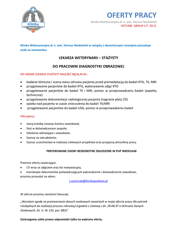 OFERTY PRACY Klinika Weterynaryjna dr n. wet. Dariusz Niedzielski VETCARE GROUP S P. ZO.O. Klinika Weterynaryjna dr n. wet. Dariusz Niedzielski w związku z dynamicznym rozwojem poszukuje osób na stanowisko: LEKARZA WETERYNARII – STAŻYSTY DO PRACOWNI DIAGNOSTYKI OBRAZOWEJ DO ZADAO LEKARZA STAŻYSTY NALEŻED BĘDĄ M.IN.: badanie kliniczne i ocena stanu zdrowia pacjenta przed premedykacją do badao RTG, TK, MRI przygotowanie pacjentów do badao RTG, wykonywanie zdjęd RTG przygotowanie pacjentów do badao TK i MRI, pomoc w przeprowadzaniu badao (aspekty techniczne) przygotowanie dokumentacji radiologicznej pacjenta (nagranie płyty CD) opieka nad pacjenta w czasie znieczulenia do badao TK/MRi przygotowanie pacjentów do badao USG, pomoc w przeprowadzeniu badao Oferujemy: Jasną ścieżkę rozwoju kariery zawodowej Staż w doświadczonym zespole; Szkolenia wdrażające i zawodowe; Szansę na zatrudnienie; Szanse uczestnictwa w realizacji ciekawych projektów oraz przyjazną atmosferę pracy. PREFEROWANE OSOBY BEZROBOTNE ZGŁOSZONE W PUP WROCŁAW Pisemne oferty zawierające: CV wraz ze zdjęciem oraz list motywacyjny, kserokopie dokumentów poświadczających wykształcenie i doświadczenie zawodowe, prosimy przesyład na adres: [email protected] W ofercie prosimy zamieścid klauzulę: „Wyrażam zgodę na przetwarzanie danych osobowych zawartych w mojej ofercie pracy dla potrzeb niezbędnych do realizacji procesu rekrutacji (zgodnie z Ustawą z dn. 29.08.97 o Ochronie Danych Osobowych, Dz. U. Nr 133, poz. 883)”. Zastrzegamy sobie prawo odpowiedzi tylko na wybrane oferty.