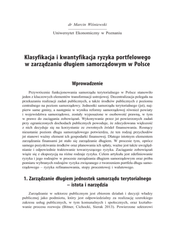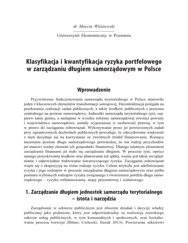 dr Marcin Wiśniewski Uniwersytet Ekonomiczny w Poznaniu Klasyfikacja i kwantyfikacja ryzyka portfelowego w zarządzaniu długiem samorządowym w Polsce Wprowadzenie Przywrócenie funkcjonowania samorządu terytorialnego w Polsce stanowiło jeden z kluczowych elementów transformacji ustrojowej. Decentralizacja polegała na przekazaniu realizacji zadań publicznych, a także środków publicznych z poziomu centralnego na poziom samorządowy. Jednostki samorządu terytorialnego (jst), najpierw same gminy, a następnie w wyniku reformy samorządowej również powiaty i województwa samorządowe, zostały wyposażone w osobowość prawną, w tym w prawo do zaciągania zobowiązań. Wykonywanie przez jst powierzonych zadań przy ograniczonych dochodach publicznych powoduje, że zdecydowana większość z nich decyduje się na korzystanie ze zwrotnych źródeł finansowania. Rosnący nieustanie poziom długu samorządowego potwierdza, że ten rodzaj przychodów jst stanowi ważny element ich gospodarki finansowej. Dlatego istotnym elementem zarządzania finansami jst stało się zarządzanie długiem. W procesie tym, oprócz samego pozyskiwania środków oraz planowania ich spłaty, ważne jest także uwzględnianie i odpowiednie traktowanie towarzyszącego ryzyka. Zaciąganie zobowiązań wiąże się z ekspozycją na różne rodzaje ryzyka. Celem artykułu jest zdefiniowanie ryzyka i jego rodzajów w procesie zarządzania długiem samorządowym oraz próba pomiaru wybranych rodzajów ryzyka związanego z tworzeniem portfela długu samorządowego – ryzyka refinansowania, stopy procentowej i walutowego. 1. Zarządzanie długiem jednostek samorządu terytorialnego – istota i narzędzia Zarządzanie w sektorze publicznym jest zbiorem działań i decyzji władzy publicznej jako podmiotu, który jest odpowiedzialny za realizację szerokiego zakresu usług publicznych, w tym komunalnych i społecznych, oraz kształtowanie procesu rozwoju (Bitner, Cichocki, Sierak 2013). Powierzone sektorowi 156 dr Marcin Wiśniewski publicznemu – na szczeblu centralnym i samorządowym – zadania wymagają zapewnienia odpowiednich środków finansowych na ich wykonywanie. W przypadku jst prawnie zagwarantowano im udział w dochodach publicznych odpowiednio do przypisanych im zadań; w szczególności dochody jst mają składać się z dochodów własnych oraz subwencji ogólnych i dotacji celowych z budżetu państwa1. Dlatego też immanentnym elementem zarządzania jst jest zarządzanie finansami, które można określić jako „proces polegający na podejmowaniu przez jej organy stanowiące i wykonawcze wielu różnych wzajemnie powiązanych działań i decyzji służących maksymalizacji ekonomicznych i społecznych efektów, zgodnie z przyjętymi celami bieżącymi i strategicznymi”. W szczególności proces ten polega na racjonalnym kształtowaniu dochodów oraz kierunków ich alokacji w zależności od bieżącej i prognozowanej sytuacji finansowej jst (Zarządzanie gospodarką i finansami gminy 2003). Należy wskazać dodatkowo, że proces ten powinien być prowadzony w ramach przyjętej strategii, tzn. że bieżące prowadzenie spraw finansowych jst winno być podporządkowane wieloletnim planom, określającym średnio- i długookresowe cele, które wytyczyła sobie jst. Stąd zarządzanie finansami, jako element zarządzania działalnością samorządową, powinno być zintegrowane ze wszystkimi instrumentami zarządzania strategicznego. Faktem oczywistym jest to, że dochody publiczne mają ograniczony charakter, co w powiązaniu z ogromnymi potrzebami wspólnot lokalnych i regionalnych powoduje, że niejednokrotnie jst zmuszone są poszukiwać dodatkowych środków publicznych – innych niż dochody. Środki te, określane jako przychody, rekompensują negatywną różnicę pomiędzy dochodami a wydatkami, czyli deficyt. Przeważająca większość przychodów jest skutkiem wykorzystania przez jst zwrotnych źródeł finansowania, czyli stanowią je głównie środki pieniężne pozyskane w drodze zaciągnięcia kredytu lub pożyczki, a także emisji papierów wartościowych. Skorzystanie ze zwrotnych form finansowania daje z jednej strony możliwość znalezienia środków kompensujących występujące w danym roku niedobory środków pieniężnych. Z drugiej strony, niestety, obciąża na kolejne lata gospodarkę finansową jst koniecznością spłaty długu wraz z należnymi jego kosztami. Dlatego też bardzo często jako oddzielny element zarządzania finansami samorządowymi wyróżnia się proces zarządzania długiem. Zarządzanie długiem jst jest procesem polegającym na określeniu zdolności jst do zaciągania długu i jego spłaty oraz bezpiecznego poziomu zadłużenia, a także wyborze najbardziej efektywnych form długu. W pierwszej kolejności należy odpowiedzieć na pytanie, czy wskazane jest wykorzystywanie zwrotnych źródeł finansowania. Po uzyskaniu pozytywnej odpowiedzi „należy ustalić, ile pożyczyć, kiedy pożyczyć i jaka powinna być struktura długu (plan spłat, oprocentowanie, karencja)” (Cichocki 2013). Konieczny jest odpowiedni wybór formy Szczegółowe zasady określania i gromadzenia (przekazywania z budżetu państwa) tych rodzajów dochodów określa Ustawa z dnia 13 listopada 2003 r. o dochodach jednostek samorządu terytorialnego (tekst jedn. Dz.U. 2016 poz. 198). 1 Klasyfikacja i kwantyfikacja ryzyka portfelowego w zarządzaniu długiem... 157 i źródeł pozyskiwania funduszy. Podejmując decyzję dotyczącą rodzaju długu i konstrukcji zobowiązania, należy kierować się przede wszystkim kwestią kosztów obsługi długu. Ponadto, niezbędne jest dopasowanie terminów, w których będą dokonywane płatności zobowiązań, do zdolności finansowych jst, zapewniając tym samym przyszłą płynność budżetu. Równie istotne okazuje się także bieżące monitorowanie obsługi wcześniej zaciągniętych zobowiązań (Cichocki 2013). Zarządza