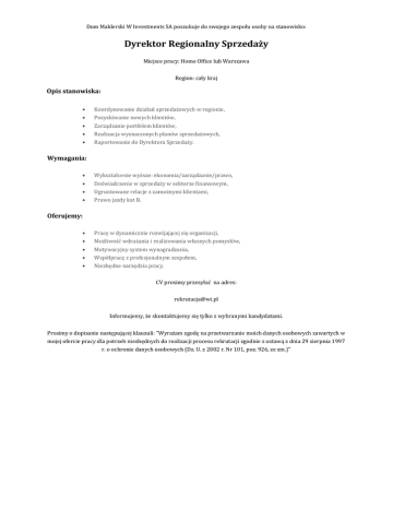 Dom Maklerski W Investments SA poszukuje do swojego zespołu osoby na stanowisko: Dyrektor Regionalny Sprzedaży Miejsce pracy: Home Office lub Warszawa Region: cały kraj Opis stanowiska: Koordynowanie działań sprzedażowych w regionie, Pozyskiwanie nowych klientów, Zarządzanie portfelem klientów, Realizacja wyznaczonych planów sprzedażowych, Raportowanie do Dyrektora Sprzedaży. Wymagania: Wykształcenie wyższe: ekonomia/zarządzanie/prawo, Doświadczenie w sprzedaży w sektorze finansowym, Ugruntowane relacje z zamożnymi klientami, Prawo jazdy kat B. Oferujemy: Pracę w dynamicznie rozwijającej się organizacji, Możliwość wdrażania i realizowania własnych pomysłów, Motywacyjny system wynagradzania, Współpracę z profesjonalnym zespołem, Niezbędne narzędzia pracy. CV prosimy przesyłać na adres: [email protected] Informujemy, że skontaktujemy się tylko z wybranymi kandydatami. Prosimy o dopisanie następującej klauzuli: "Wyrażam zgodę na przetwarzanie moich danych osobowych zawartych w mojej ofercie pracy dla potrzeb niezbędnych do realizacji procesu rekrutacji zgodnie z ustawą z dnia 29 sierpnia 1997 r. o ochronie danych osobowych (Dz. U. z 2002 r. Nr 101, poz. 926, ze zm.)"