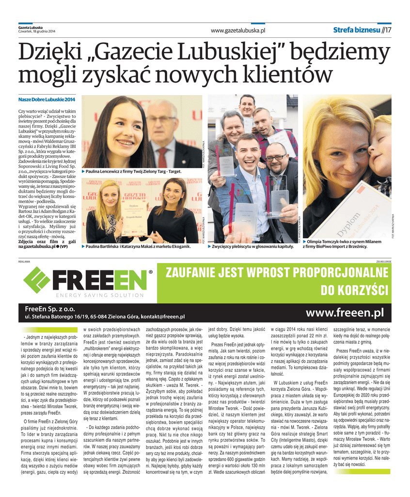 Gazeta Lubuska Czwartek, 18 grudnia 2014 Strefa biznesu //17 www.gazetalubuska.pl Dzięki „Gazecie Lubuskiej” będziemy mogli zyskać nowych klientów b Paulina Bartlińska i Katarzyna Makaś z marketu Ekoganik. REKLAMA - Jednym z największych problemów w branży zarządzania i sprzedaży energii jest wciąż niski poziom zaufania klientów do korzyści wynikających z profesjonalnego podejścia do tej kwestii jak i do samych firm świadczących usługi konsultingowe w tym obszarze. Dziwi mnie to, bowiem to są przecież realne oszczędności, a więc zysk dla przedsiębiorstwa - twierdzi Mirosław Tworek, prezes zarządu FreeEn. O firmie FreeEn z Zielonej Góry pisaliśmy już niejednokrotnie. To lider w branży zarządzania procesami kupna i konsumpcji energią oraz innymi mediami. Firma stworzyła specjalną aplikację, dzięki której klienci wiedzą wszystko o zużyciu mediów (energii, gazu, ciepła czy wody) b Zwycięzcy plebiscytu w głosowaniu kapituły. FOT. MARIUSZ KAPAŁA FOT. MARSZIUSZ KAPAŁA b Paulina Lencewicz z firmy Twój Zielony Targ - Target. FOT. MARSZIUSZ KAPAŁA Czy warto wziąć udział w takim plebiscycie? - Zwycięstwo to świetnyprezentpodchoinkędla naszej firmy. Dzięki „Gazecie Lubuskiej”wprzyszłymrokuzyskamy wielką kampanię reklamową - mówi Waldemar Gruszczyński z Fabryki Reklamy IBI Sp. z o.o., która wygrała w kategorii produkty przemysłowe. ZadowolenianiekryjeteżJędrzej Soporowski z Living Food Sp. zo.o.,zwycięzcawkategoriiprodukt spożywczy. - Zawsze takie wyróżnieniapomagają.Spodziewamysię,żeterazznaszymiproduktami będziemy mogli dotrzeć do większej liczby konsumentów - podkreśla. Wygranej nie spodziewali się BartoszJaziAdamBodganzKadet-OK, zwycięzcy w kategorii usługi. - To wielkie zaskoczenie i satysfakcja. Myślimy już o przyszłości i chcemy rozszerzyć naszą ofertę - mówią. Zdjęcia oraz film z gali na gazetalubuska.pl a (VP) FOT. MARSZIUSZ KAPAŁA NaszeDobreLubuskie2014 b Olimpia Tomczyk-Iwko z synem Milanem z firmy BioPiwo Import z Brzeźnicy. Z014011993E ZAUFANIE JEST WPROST PROPORCJONALNE DO KORZYŚCI w swoich przedsiębiorstwach oraz zakładach przemysłowych. FreeEn jest również swoistym „multibrokerem” energii elektrycznej i oferuje energię największych koncesjonowanych sprzedawców, ale tylko tym klientom, którzy spełniają warunki sprzedawców energii i udostępniają tzw. profil energetyczny – tak jest najtaniej. W przedsiębiorstwie pracują ludzie, którzy od podszewki poznali branżę energetyczną i swoją wiedzą oraz doświadczeniem dzielą się teraz z klientami. - Do każdego zadania podchodzimy profesjonalnie i z pełnym szacunkiem dla naszym partnerów. W naszej pracy zauważamy jednak ciekawą rzecz. Część potencjalnych klientów żywi pewne obawy wobec firm zajmujących się sprzedażą energii. Złożoność zachodzących procesów, jak również gąszcz przepisów sprawiają, że dla wielu osób ta branża jest bardzo skomplikowana, a więc nieprzejrzysta. Paradoksalnie jednak, zamiast zdać się na specjalistów, na przykład takich jak my, firmy starają się działać na własną rękę. Często z opłakanym skutkiem - uważa M. Tworek. Życzyłbym sobie, aby pokładać jednak trochę więcej zaufania w profesjonalistów z branży zarządzania energią. To się później przekłada na korzyści dla przedsiębiorstwa, bowiem specjaliści chcą dobrze wykonać swoją pracę. Nikt tu nie chce nikogo oszukać. Podobnie jest w innych branżach, jeśli ktoś robi dobrze sery czy też inne produkty, chciałby aby jego klienci byli zadowoleni. Najlepiej byłoby, gdyby każdy koncentrował się na tym, w czym jest dobry. Dzięki temu jakość usług będzie wysoka. Prezes FreeEn jest jednak optymistą. Jak sam twierdzi, poziom zaufania z roku na rok rośnie i coraz więcej przedsiębiorców widzi korzyści oraz szanse w fakcie, iż rynek energii został uwolniony. - Największym atutem, jaki posiadamy są referencje tych, którzy korzystają z oferowanych przez nas produktów - twierdzi Mirosław Tworek. - Dość powiedzieć, iż naszym klientem jest największy operator telekomunikacyjny w Polsce, największy bank czy też główny gracz na rynku przetwórstwa soków. To są poważni i wymagający partnerzy. Za naszym pośrednictwem sprzedano 600 gigawatów godzin energii o wartości około 130 mln zł. Wedle szacunkowych obliczeń w ciągu 2014 roku nasi klienci zaoszczędzili ponad 22 mln zł. I nie mówię tu tylko o zakupach energii, w grę wchodzą również korzyści wynikające z korzystania z naszej aplikacji do zarządzania mediami. To kompleksowa działalność. W Lubuskiem z usług FreeEn korzysta Zielona Góra. - Współpraca z miastem układa się wyśmienicie. Duża w tym zasługa pana prezydenta Janusza Kubickiego, który zauważył, że warto stawiać na nowoczesne rozwiązania - mówi M. Tworek. - Zielona Góra realizuje strategię Smart City (Inteligentne Miasto), dzięki czemu udało się jej zakupić energię na bardzo korzystnych warunkach. Mamy nadzieję, że współpraca z lokalnym samorządem będzie dalej pomyślnie rozwijana, szczególnie teraz, w momencie kiedy ma dojść do realnego połączenia miasta z gminą. Prezes FreeEn uważa, iż w niedalekiej przyszłości wszystkie podmioty gospodarcze będą musiały współpracować z firmami profesjonalnie zajmującymi się zarządzaniem energii. - Nie da się tego uniknąć. Wedle regulacji Unii Europejskiej do 2020 roku przedsiębiorstwa będą musiały przedstawiać swój profil energetyczny. Aby taki profil wykonać, potrzebni są odpowiedni specjaliści oraz narzędzia. Wątpię, aby firmy potrafiły sobie same z tym poradzić - tłumaczy Mirosław Tworek. - Warto już dzisiaj zainteresować się tym tematem, szczególnie, iż to przynosi wymierne korzyści. Nie należy bać się nowości.