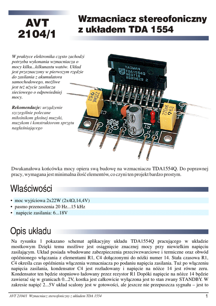 AVT 2104/1 Wzmacniacz stereofoniczny z uk³adem TDA 1554 W praktyce elektronika czêsto zachodzi potrzeba wykonania wzmacniacza o mocy kilku...kilkunastu watów. Uk³ad jest przeznaczony w pierwszym rzêdzie do zasilania z akumulatora samochodowego, mo¿liwe jest te¿ u¿ycie zasilacza sieciowego o odpowiedniej mocy. Rekomendacje: urz¹dzenie szczególnie polecane mi³oœnikom g³oœnej muzyki, muzykom i konstruktorom sprzêtu nag³aœniaj¹cego Dwukana³owa koñcówka mocy opiera sw¹ budowê na wzmacniaczu TDA1554Q. Do poprawnej pracy, wymagana jest minimalna iloœæ elementów, co czyni ten projekt bardzo prostym. W³aœciwoœci • moc wyjœciowa 2x22W (2x4W,14,4V) • pasmo przenoszenia 20 Hz...15 kHz • napiêcie zasilania: 6...18V Opis uk³adu Na rysunku 1 pokazano schemat aplikacyjny uk³adu TDA1554Q pracuj¹cego w uk³adzie mostkowym Dziêki temu mo¿liwe jest osi¹gniêcie znacznej mocy przy niewielkim napiêciu zasilaj¹cym. Uk³ad posiada wbudowane zabezpieczenia przeciwzwarciowe i termiczne oraz obwód opóŸnionego w³¹czania z elementami R1, C4 do³¹czonymi do nó¿ki numer 14. Sta³a czasowa R1, C4 okreœla czas opóŸnienia w³¹czenia wzmacniacza po podaniu napiêcia zasilania. Tu¿ po w³¹czeniu napiêcia zasilania, kondensator C4 jest roz³adowany i napiêcie na nó¿ce 14 jest równe zeru. Kondensator ten bêdzie stopniowo ³adowany przez rezystor R1 Dopóki napiêcie na nó¿ce 14 bêdzie zawieraæ siê w granicach 0...2V, kostka jest ca³kowicie wy³¹czona jest to stan zwany STANDBY. W zakresie napiêæ 2...5V uk³ad scalony jest w gotowoœci, ale jeszcze nie przepuszcza sygna³u – jest to AVT 2104/1 Wzmacniacz stereofoniczny z uk³adem TDA 1554 1 stan zwany MUTE. Dopiero przy wy¿szych napiêciach kostka zachowuje siê jak normalny wzmacniacz. Takie wyciszenie przy w³¹czaniu jest bardzo po¿yteczne, poniewa¿ nie dopuszcza do g³oœnika jakichkolwiek stuków, trzasków i innych „œmieci”, które maj¹ swoje Ÿród³o w tak zwanych stanach przejœciowych przedwzmacniacza. Przy zasilaniu napiêciem 14,4V i obci¹¿eniu 2x4W mo¿na uzyskaæ moc wyjœciow¹ 2x22W przy zniekszta³ceniach 10%. Pobór pr¹du wynosi przy tym ponad 5A. W zastosowaniach innych ni¿ samochodowe stosuje siê powszechnie obci¹¿enie 8W . Przy takim obci¹¿eniu moc wyjœciowa bêdzie o oko³o 40% mniejsza, ale mniejsze bêd¹ te¿ straty mocy (grzanie) i wystarczy zastosowaæ niewielki radiator z kawa³ka blachy. W przypadku zasilania napiêciem wy¿szym ni¿ napiêcie akumulatora samochodowego nale¿y pamiêtaæ o wewnêtrznym obwodzie zabezpieczaj¹cym, który wy³¹cza wzmacniacz gdy napiêcie zasilaj¹ce przekroczy 18V. Stosuj¹c zasilacz niestabilizowany nale¿y oczekiwaæ, ¿e przy obci¹¿eniu 2x8W moc wyjœciowa bêdzie rzêdu 2x10...15W zale¿nie od parametrów u¿ytego zasilacza. R1 P 47kW A C D 0 B E F Rys. 1 Schemat elektryczny 2 AVT 2104/1 Wzmacniacz stereofoniczny z uk³adem TDA 1554 Monta¿ i uruchomienie Wygl¹d p³ytki drukowanej do wzmacniacza pokazano na rysunku 2. Monta¿ uk³adu (nawet bez schematu ideowego) nie sprawi trudnoœci, rozpoczynamy go od wlutowania trzech zwór a koñczymy na wlutowaniu koñcówki mocy. Zasilanie (6...18V) nale¿y pod³¹czyæ do punktów O1 - minus, P - plus. Punkt O pos³u¿y dla pod³¹czenia masy wspó³pracuj¹cego przedwzmacniacza - bêdzie to masa wejœciowa czyli sygna³owa. Wejœciami dwóch kana³ów wzmacniacza s¹ punkty oznaczone A i B. Dwa g³oœniki nale¿y pod³¹czyæ do punktów C,D oraz E,F. G³oœniki bêd¹ pracowaæ w fazie, jeœli ich gor¹ce punkty, czyli wyprowadzenia oznaczone czerwon¹ kropk¹ bêd¹ do³¹czone do punktów C i E. Dla uzyskania pe³nej mocy wyjœciowej wzmacniacz musi byæ wyposa¿ony w radiator. Dla wiêkszego komfortu pod³¹czania, wzmacniacz mo¿na wyposa¿yæ w z³¹cza œrubowe rysunek 3. Rys. 2 Rozmieszczenie elementów na p³ytce drukowanej Wykaz elementów W kolejnoœci lutowania: 1 2 3 4 5 R1:. . . . . . . . . . . 47kW C1, C2:. . . . . . . . 220nF C3: . . . . . . . . . . . 100nF ceramiczny C4: . . . . . . . . . . . 100µF/16V U1:. . . . . . . . . . . TDA1554Q Zestaw powsta³ na podstawie projektu o tym samym tytule opublikowanego w Elektronice dla Wszystkich 2/98 www.elportal.pl Oferta zestawów do samodzielnego monta¿u dostêpna jest na stronie internetowej www.sklep.avt.pl Producent: AVT-Korporacja sp. z o.o. tel.: (22) 257-84-50 ul. Leszczynowa 11 fax: (22) 257-84-55 03-197 Warszawa AVT 2104/1 Wzmacniacz stereofoniczny z uk³adem TDA 1554 Dzia³ pomocy technicznej: tel.:(22) 257-84-58 [email protected] 3 Rys. 3 Widok wzmacniacza z zamontowanymi z³¹czami œrubowymi 4 AVT 2104/1 Wzmacniacz stereofoniczny z uk³adem TDA 1554