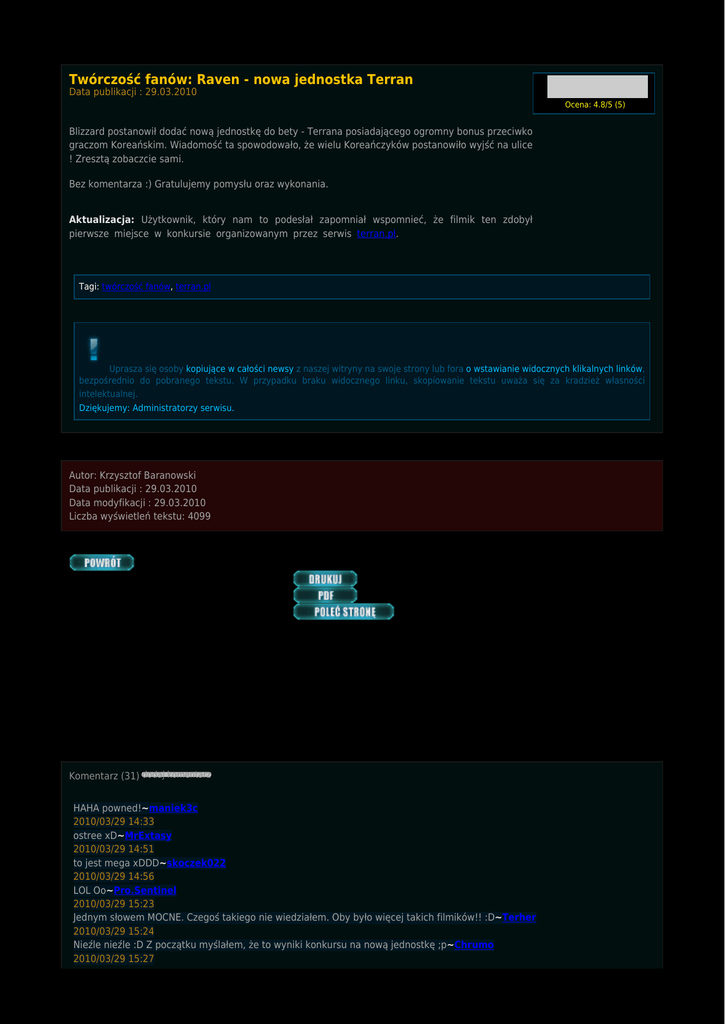 Twórczość fanów: Raven - nowa jednostka Terran Data publikacji : 29.03.2010 Ocena: 4.8/5 (5) Blizzard postanowił dodać nową jednostkę do bety - Terrana posiadającego ogromny bonus przeciwko graczom Koreańskim. Wiadomość ta spowodowało, że wielu Koreańczyków postanowiło wyjść na ulice ! Zresztą zobaczcie sami. Bez komentarza :) Gratulujemy pomysłu oraz wykonania. Aktualizacja: Użytkownik, który nam to podesłał zapomniał wspomnieć, że filmik ten zdobył pierwsze miejsce w konkursie organizowanym przez serwis terran.pl. Tagi: twórczość fanów, terran.pl Uprasza się osoby kopiujące w całości newsy z naszej witryny na swoje strony lub fora o wstawianie widocznych klikalnych linków, bezpośrednio do pobranego tekstu. W przypadku braku widocznego linku, skopiowanie tekstu uważa się za kradzież własności intelektualnej. Dziękujemy: Administratorzy serwisu. Autor: Krzysztof Baranowski Data publikacji : 29.03.2010 Data modyfikacji : 29.03.2010 Liczba wyświetleń tekstu: 4099 Komentarz (31) dodaj komentarz HAHA powned!~maniek3c 2010/03/29 14:33 ostree xD~MrExtasy 2010/03/29 14:51 to jest mega xDDD~skoczek022 2010/03/29 14:56 LOL Oo~Pro.Sentinel 2010/03/29 15:23 Jednym słowem MOCNE. Czegoś takiego nie wiedziałem. Oby było więcej takich filmików!! :D~Terher 2010/03/29 15:24 Nieźle nieźle :D Z początku myślałem, że to wyniki konkursu na nową jednostkę ;p~Chrumo 2010/03/29 15:27 W pewnym sensie racja, bo to fragment pracy konkursowej na terran.pl Naprawdę niezły filmik :)~vms 2010/03/29 15:36 Apeluję o przetłumaczenie tego na angielski język i wysłanie tego do...wszyscy wiemy gdzie;)~duzeciacho 2010/03/29 15:38 Eeee tam Mc kovi lepsze XD MICRO SYNKJU MIRCO!!~Adamixsosx 2010/03/29 15:38 zrobił ryż z twoich roachy :D omg ...~kosi 2010/03/29 15:45 hahahahaha~Tiger486 2010/03/29 16:13 ładnie policja microwała w 55 sekundzie hehe~Garik 2010/03/29 16:18 1200 apm to 20 akcji na sekunde chyba mu sie myszka rozwaliła~Adik99 2010/03/29 16:31 @~chrumo Z tego co widziałem ten filmik właśnie zajął pierwsze miejsce w konkursie na jednostkę, w sumie to nie dziwne bo jest mega :D. ~Thor 2010/03/29 16:46 polska Voodka !! :D~Xeron 2010/03/29 17:00 "jak wyprodukowalem pierwsze roache to sie podjaralem i napisale gg - no re " buhahahaha~Asachina 2010/03/29 17:15 Fajne było to podwójne tłumaczenie z angielskiego na koreański i na polski. Btw, kiedy zmienicie tą obleśną reklamę z lewej. Nie da się tego blokować żadnym adblokiem, bo to tło x(~Atom 2010/03/29 17:35 Jeśli ktoś wymiata po angielsku i zechciał by przetłumaczyć ten filmik to GG 3315769. Oczywiście autor tłumaczenia będzie wymieniony w filmie ;)~Mayk3l 2010/03/29 17:39 Hahahah :D Miazged :D~Alan313 2010/03/29 18:39 Fantastyczne :D Mam nadzieje, że znajdzie się ktoś zdolny to przetłumaczyć :P~NeedForSpeed 2010/03/29 19:19 suuuuper, naprawde dobry kawał humory, z tym "gg - no re" było super.~Skofijak 2010/03/29 19:36 Niech ktoś podeśle mi tekst cały po polsku na : [email protected] to jak znajdę chwilkę to to dokładnie przetłumaczę ;] No problemo.~DeathWing _Azuriel_ 2010/03/29 19:43 Te chłopaki - może skontaktujcie się wpierw z autorem filmiku nim będziecie to tłumaczyć? :P~KruczoCzarny Battlenet Network 2010/03/29 19:52 @KruczoCzaarny ~Mayk3l napisał parę komentarzy wyżej, że się zgadza :P~Thor 2010/03/29 20:37 ^^~Atom 2010/03/29 20:43 No wlasnie, tylko ze Majk3l juz jedna nagrode za to zgarnal... :)~The_13 2010/03/29 22:02 a to sorry, źle zrozumiałem ;D Mea culpa. Powodzenia w rozprzestrzenianiu Polskiej IMBY na świat!~KruczoCzarny 2010/03/30 15:43 hahahahah xD miazga~Zuczek1995 2010/03/30 16:20 to kto gotuje mutaliska :D???~grzybekmac 2010/03/30 22:24 O ironio ... http://www.starcraft2.net.pl/portal/sc2/5/564/Raven.html Nie wiedziałem że ma bonusy na koreańców ...~FreezePL 2010/04/01 18:32 Świetny film !!~Ghost 2010/04/02 22:07 dodaj komentarz 08.10.2015 Kampania "Szepty o zagładzie" dostępna za darmo (0 komentarzy) 27.09.2015 Kolejni bohaterowie w trybie Sprzymierzonych Dowódców (0 komentarzy) 22.09.2015 Cyfrowe gadżety za udział w BlizzCon 2015 (0 komentarzy) 15.07.2015 Legacy of the Void dostępne w przedsprzedaży! (0 komentarzy) 17.06.2015 Informacje z E3 - prolog kampanii Legacy of the Void (0 komentarzy) 30.05.2015 WCS Europe - sobota (30 maja) 18.00 grupa G - MaNa! (0 komentarzy) 07.05.2015 DreamHack Open France 2015 - już 8 maja - MaNa! (0 komentarzy) 03.05.2015 Na wesoło: postacie E-sportu 50 (0 komentarzy) 03.05.2015 IEM Katowice 2015 - jeszcze raz! (0 komentarzy) 03.05.2015 KeSPA Cup 2015 Season 1 - live! (0 komentarzy) 26.04.2015 Proleague - Top5 gier miesiąca (0 komentarzy) 26.04.2015 CJ Entus wygrywa 2 runde Proleague! (0 komentarzy) 18.04.2015 Wersja beta Legacy of the Void – aktualizacja 2.5.1 (0 komentarzy) 18.04.2015 WCS finals 2015 - galeria (0 komentarzy) 18.04.2015 Omówienie zmian w balansie Legacy of the Void (0 komentarzy) 11.04.2015 WCS Europe kwalifikacje z Polakami - dziś (sobota) 18.00 (0 komentarzy) 11.04.2015 Aktualizacja balansu Heart of the Swarm – 9 kwietnia (0 komentarzy) 11.04.2015 GSL Season1 2015 - galeria (0 komentarzy) 11.04.2015 Zbanowane konta w StarCraft II (0 komentarzy) 04.04.2015 Red Bull Battle Grounds powraca jesienią 2015 (0 komentarzy) (zobacz wszystkie)