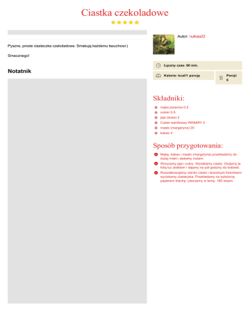 Ciastka czekoladowe Autor: nulkaa22 Pyszne, proste ciasteczka czekoladowe. Smakują każdemu łasuchowi:) Smacznego! Łączny czas: 60 min. Notatnik Kalorie: kcal/1 porcję Porcji: 6 Składniki: mąka pszenna 0,5 cukier 0,5 jaja (duże) 2 Cukier wanilinowy WINIARY 2 masło (margaryna) 20 kakao 4 Sposób przygotowania: Mąkę, kakao i masło (margaryna) przekładamy do dużej miski i siekamy nożem. Wrzucamy jaja i cukry. Wyrabiamy ciasto. Owijamy je folią luz złotkiem i dajemy na pół godziny do lodówki. Rozwałkowujemy cienko ciasto i dowolnym foremkami wyciskamy ciasteczka. Przekładamy na wyłożoną papierem blachę i pieczemy w temp. 180 stopni.