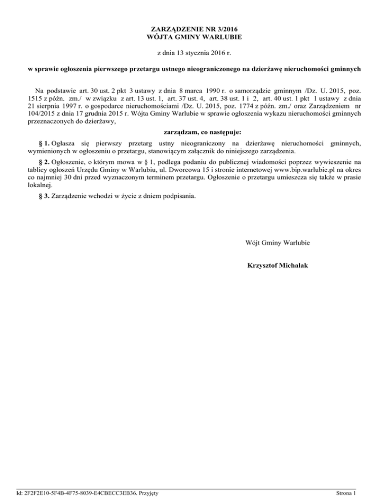 ZARZĄDZENIE NR 3/2016 WÓJTA GMINY WARLUBIE z dnia 13 stycznia 2016 r. w sprawie ogłoszenia pierwszego przetargu ustnego nieograniczonego na dzierżawę nieruchomości gminnych Na podstawie art. 30 ust. 2 pkt 3 ustawy z dnia 8 marca 1990 r. o samorządzie gminnym /Dz. U. 2015, poz. 1515 z późn. zm./ w związku z art. 13 ust. 1, art. 37 ust. 4, art. 38 ust. 1 i 2, art. 40 ust. 1 pkt 1 ustawy z dnia 21 sierpnia 1997 r. o gospodarce nieruchomościami /Dz. U. 2015, poz. 1774 z późn. zm./ oraz Zarządzeniem nr 104/2015 z dnia 17 grudnia 2015 r. Wójta Gminy Warlubie w sprawie ogłoszenia wykazu nieruchomości gminnych przeznaczonych do dzierżawy, zarządzam, co następuje: § 1. Ogłasza się pierwszy przetarg ustny nieograniczony na dzierżawę nieruchomości gminnych, wymienionych w ogłoszeniu o przetargu, stanowiącym załącznik do niniejszego zarządzenia. § 2. Ogłoszenie, o którym mowa w § 1, podlega podaniu do publicznej wiadomości poprzez wywieszenie na tablicy ogłoszeń Urzędu Gminy w Warlubiu, ul. Dworcowa 15 i stronie internetowej www.bip.warlubie.pl na okres co najmniej 30 dni przed wyznaczonym terminem przetargu. Ogłoszenie o przetargu umieszcza się także w prasie lokalnej. § 3. Zarządzenie wchodzi w życie z dniem podpisania. Wójt Gminy Warlubie Krzysztof Michalak Id: 2F2F2E10-5F4B-4F75-8039-E4CBECC3EB36. Przyjęty Strona 1 Załącznik do Zarządzenia Nr 3/2016 Wójta Gminy Warlubie z dnia 13 stycznia 2016 r. w sprawie ogłoszenia pierwszego przetargu ustnego nieograniczonego na dzierżawę nieruchomości gminnych OGŁOSZENIE Wójta Gminy Warlubie o pierwszym nieograniczonym przetargu ustnym LP. Opis, położenie i oznaczenie nieruchomości Cena wywoławcza czynszu i zasady aktualizacji Termin wnoszenia opłat Przeznaczenie i termin zagospodarowania nieruchomości Minimalne postąpienie Kwota wadium i termin wniesienia 1. Działka nr 86, obręb Warlubie Cena wywoławcza czynszy dzierżawnego RIIIb - 3,00 q żyta/ha Termin wnoszenia opłat za dzierżawę do 15 marca każdego roku dzierżawnego Dzierżawa na okres 5 lat części działki o pow. 0,25 ha (klasa RIIIb) Minimalne postąpienie: 0,03 q żyta Wadium wynosi 16,15 zł (3,00*53,75*10%) KW 19699, pow. całkowita 0,77 ha klasa gruntu RIIIb. Obszar przeznaczony pod działalność rolniczą, grunt rolny. Brak aktualnego Miejscowego Planu Zagospodarowania Przestrzennego. W Studium Uwarunkowań i Kierunków Stawka czynszy będzie ulegała waloryzacji od1 stycznia każdego roku kalendarzowego w okresie obowiązywania umowy, o wskaźnik inflacji podany przez Prezesa GUS za miniony rok kalendarzowy Termin zagospodarowania: od 01.03.2016 r. do 28.02.2021 r. Zagospodarowania Przestrzennego GminyWarlubie - obszar rolniczy. Nieruchomość wolna od obciążeń. I. Przetarg ustny nieograniczony na dzierżawę nieruchomości gminnych w w/w obrębie odbędzie się dnia 19 lutego 2016 r. o godz. 10.00, sala nr 21, siedziba Urzędu gminy w Warlubiu, ul. Dworcowa 15, 86 - 160 Warlubie Id: 2F2F2E10-5F4B-4F75-8039-E4CBECC3EB36. Przyjęty Strona 1 II. Warunkiem uczestnictwa w przetargu jest wniesienie wadium z oznaczeniem nieruchomości. Wadium należy wpłacić w gotówce w kasie Urzędu Gminy w Warlubiu (czynna do godziny 14.00) lub na konto UG - Bank Spółdzielczy w Nowem - nr rachunku 44 8173 0005 2002 0006 0017 0002 do dnia 16 lutego 2016 r. Dowód wniesienia wadium przez uczestnika przetargu podlega przedłożeniu komisji przetargowej przed otwarciem przetargu. III. Przetarg wygrywa uczestnik, który zaproponuje najwyższą cenę lub w przypadku jednego uczestnika, który zaoferuje co najmniej jedno postąpienie powyżej ceny wywoławczej. Wysokość postąpienia nie może wynosić mniej niż 1% wartości ceny wywoławczej nieruchomości. Dla wygrywającego przetarg wpłacone wadium zaliczone zostanie na poczet opłat z tytułu dzierżawy, a pozostali uczestnicy mają prawo do jego zwrotu niezwłocznie (do 3 dni od dnia odbytego przetargu) w kasie urzędu bądź na podane w oświadczeniu konto bankowe. IV. Wadium nie podlega zwrotowi w przypadku, gdy: - osoba, która wygra przetarg uchyli się od zawarcia umowy dzierżawy w ciągu 14 dni V. Skargę na czynności związane z przeprowadzeniem przetargu uczestnik przetargu składa w terminie 7 dni od dnia ogłoszenia wyniku przetargu do Wójta Gminy. VI. Informacje na temat przetargu można uzyskać pod nr telefonu 52-380-05-16 lub w p. nr 19. VII. W przypadku zaistnienia uzasadnionych powodów Wójt Gminy Warlubie zastrzega sobie prawo odwołania przetargu. VIII. Powyższe ogłoszenie wywiesza się na tablicy ogłoszeń w Urzędzie Gminy w Warlubiu na okres 30 dni, stronie internetowej www.bip.warlubie.pl oraz w prasie lokalnej. Przetarg został ogłoszony na podstawie ustawy z dnia 21 sierpnia 1997 r. o gospodarce nieruchomościami /Dz. U. 2015, poz. 1774 z późn. zm./ Id: 2F2F2E10-5F4B-4F75-8039-E4CBECC3EB36. Przyjęty Strona 2