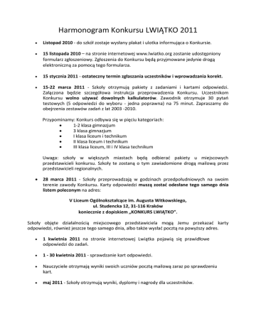 Harmonogram Konkursu LWIĄTKO 2011 Listopad 2010 - do szkół zostaje wysłany plakat i ulotka informująca o Konkursie. 15 listopada 2010 – na stronie internetowej www.lwiatko.org zostanie udostępniony formularz zgłoszeniowy. Zgłoszenia do Konkursu będą przyjmowane jedynie drogą elektroniczną za pomocą tego formularza. 15 stycznia 2011 - ostateczny termin zgłaszania uczestników i wprowadzania korekt. 15-22 marca 2011 - Szkoły otrzymują pakiety z zadaniami i kartami odpowiedzi. Załączona będzie szczegółowa instrukcja przeprowadzenia Konkursu. Uczestnikom Konkursu wolno używać dowolnych kalkulatorów. Zawodnik otrzymuje 30 pytao testowych (5 odpowiedzi do wyboru - jedna poprawna) na 75 minut. Zapraszamy do obejrzenia zestawów zadao z lat 2003 -2010. Przypominamy: Konkurs odbywa się w pięciu kategoriach: 1-2 klasa gimnazjum 3 klasa gimnazjum I klasa liceum i technikum II klasa liceum i technikum III klasa liceum, III i IV klasa technikum Uwaga: szkoły w większych miastach będą odbierad pakiety u miejscowych przedstawicieli konkursu. Szkoły te zostaną o tym zawiadomione drogą mailową przez przedstawicieli regionalnych. 28 marca 2011 - Szkoły przeprowadzają w godzinach przedpołudniowych na swoim terenie zawody Konkursu. Karty odpowiedzi muszą zostać odesłane tego samego dnia listem poleconym na adres: V Liceum Ogólnokształcące im. Augusta Witkowskiego, ul. Studencka 12, 31-116 Kraków koniecznie z dopiskiem „KONKURS LWIĄTKO”. Szkoły objęte działalnością miejscowego przedstawiciela mogą Jemu przekazad karty odpowiedzi, również jeszcze tego samego dnia, albo także wysład pocztą na powyższy adres. 1 kwietnia 2011 na stronie internetowej Lwiątka pojawią się prawidłowe odpowiedzi do zadao. 1 - 30 kwietnia 2011 - sprawdzanie kart odpowiedzi. Nauczyciele otrzymają wyniki swoich uczniów pocztą mailową zaraz po sprawdzeniu kart. maj 2011 - Szkoły otrzymują wyniki, dyplomy i nagrody dla uczestników.
