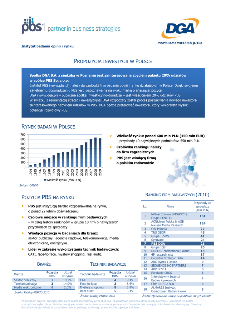 Instytut badania opinii i rynku PROPOZYCJA INWESTYCJI W POLSCE Spółka DGA S.A. z siedzibą w Poznaniu jest zainteresowana zbyciem pakietu 20% udziałów w spółce PBS Sp. z o.o. Instytut PBS (www.pbs.pl) należy do czołówki firm badania opinii i rynku działających w Polsce. Dzięki swojemu 22-letniemu doświadczeniu PBS jest rozpoznawalną na rynku marką o znaczącej pozycji. DGA (www.dga.pl) – publiczna spółka inwestycyjno-doradcza – jest właścicielem 20% udziałów PBS. W związku z reorientacją strategii inwestycyjnej DGA rozpoczęty został proces poszukiwania nowego inwestora zainteresowanego nabyciem udziałów w PBS. DGA będzie preferować inwestora, który wykorzysta wysoki potencjał rozwojowy PBS. RYNEK BADAŃ W POLSCE Wielkość rynku: ponad 600 mln PLN (150 mln EUR) – przychody 10 największych podmiotów: 550 mln PLN Czołówka rankingu należy do firm zagranicznych PBS jest wiodącą firmą o polskim rodowodzie ŹRÓDŁO: OFBOR RANKING FIRM BADAWCZYCH (2010) POZYCJA PBS NA RYNKU PBS jest instytucją bardzo rozpoznawalną na rynku, o ponad 22 letnim doświadczeniu Lp. 1 Czołowe miejsce w rankingu firm badawczych – w całej historii rankingów w grupie 10 firm o najwyższych przychodach ze sprzedaży 2 Wiodąca pozycja w badaniach dla branż: sektor publiczny i agencje rządowe, telekomunikacja, media elektroniczne, energetyka. Lider w zakresie wykorzystania technik badawczych: CATI, face-to-face, mystery shopping, real audit. BRANŻE Branże Sektor publiczny Telekomunikacja Media elektroniczne Pozycja PBS 2 3 6 Źródło: Katalog PTBRIO 2010 TECHNIKI BADAWCZE Udział w rynku 19,7% 14,0% 2,0% Techniki badawcze CATI Face-to-face Mystery shopping Real audit Pozycja PBS 4 3 8 5 Źródło: Katalog PTBRIO 2010 Udział w rynku 9,4% 8,6% 3,9% 3,4% 3 4 5 6 7 8 9 10 11 12 13 14 15 16 17 18 Firma MillwardBrown SMG/KRC & Grupa PENTOR ACNielsen Polska & AGB Nielsen Media Research GfK Polonia TNS OBOP Grupa IPSOS Synovate PBS DGA Grupa IQS MEMRB International Poland 4P research mix Cegedim Strategic Data ARC Rynek i Opinia SEQUENCE HC PARTNERS ABR SESTA Fundacja CBOS Interaktywny Instytut Badań Rynkowych CBM INDICATOR ALMARES Instytut Doradztwa i Badań Rynku Przychody ze sprzedaży [mln PLN] 161 124 77 45 41 24 21 20 18 17 14 9 7 5 5 4 3 3 Źródło: Opracowanie własne na podstawie danych OFBOR Zastrzeżenie prawne: Niniejszy dokument został sporządzony przez DGA S.A. na podstawie publicznie dostępnych informacji. Dokument ten został sporządzony wyłącznie w celu informacyjnym, a informacje zawarte w nim są podane w skróconej formie i mają jedynie charakter orientacyjny. Niniejszy dokument nie jest ofertą w rozumieniu prawa cywilnego ani innego prawa obowiązującego w Polsce. Instytut badania opinii i rynku BADANIA Najwyższa jakość badań • Udział w audytach kontroli jakości PKJPA (ostatni audyt 2010) - PBS posiada certyfikaty we wszystkich dziedzinach Nagrody • • „IMPACTOR 2002” w kategorii Najlepszy Instytut Badawczy - nagroda przyznawana przez przemysł reklamowy „Gazele Biznesu” przyznawane przez Puls Biznesu - ranking najdynamiczniej rozwijających się małych i średnich firm Źródło: Strona internetowa PBS. KLUCZOWI KLIENCI PBS PRZYCHODY ZE SPRZEDAŻY PBS [MLN PLN] Źródło: PBS Sp. z o.o. Krzysztof Koczurowski 40% STRUKTURA AKCJONARIATU DGA jest właścicielem 20% udziałów w PBS Ryszard Pieńkowski 40% Pozostałymi udziałowcami są założyciele spółki Pakiet udziałów DGA obejmuje „złotą akcję” DGA S.A. 20% KONTAKT: Andrzej Głowacki Prezes Zarządu DGA S.A. Tel. + 48 61 643 51 00 [email protected] www.dga.pl DGA S.A. Marek Jarzęcki Młodszy Konsultant PBS Sp. z o.o. ul. Junaków 2, 81-812 Sopot POLSKA Tel. + 48 61 643 51 42 www.pbs.pl [email protected] Zastrzeżenie prawne: Niniejszy dokument został sporządzony przez DGA S.A. na podstawie publicznie dostępnych informacji. Dokument ten został sporządzony wyłącznie w celu informacyjnym, a informacje zawarte w nim są podane w skróconej formie i mają jedynie charakter orientacyjny. Niniejszy dokument nie jest ofertą w rozumieniu prawa cywilnego ani innego prawa obowiązującego w Polsce.
