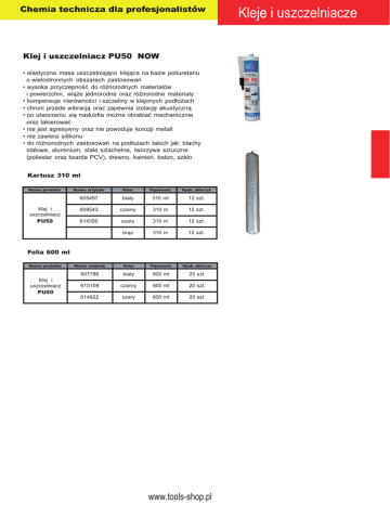 Kleje i uszczelniacze Klej i uszczelniacz PU50 NOW • elastyczna masa uszczelniająco klejąca na bazie poliuretanu o wielostronnych obszarach zastosowań • wysoka przyczepność do różnorodnych materiałów i powierzchni, wiąże jednorodne oraz różnorodne materiały • kompensuje nierówności i szczeliny w klejonych podłożach • chroni przede wibracją oraz zapewnia izolację akustyczną • po utworzeniu się naskórka można obrabiać mechanicznie oraz lakierować • nie jest agresywny oraz nie powoduje korozji metali • nie zawiera silikonu • do różnorodnych zastosowań na podłożach takich jak: blachy stalowe, aluminium, stale szlachetne, tworzywa sztuczne (poliester oraz twarde PCV), drewno, kamień, beton, szkło Kartusz 310 ml Nazwa produktu Klej i uszczelniacz PU50 Numer artykułu Kolor Pojemność Opak. zbiorcze 605497 biały 310 ml 12 szt. 608543 czarny 310 m 12 szt. 614350 szary 310 m 12 szt. brąz 310 m 12 szt. Numer artykułu Kolor Pojemność Opak. zbiorcze 607786 biały 600 ml 20 szt. 615109 czarny 600 ml 20 szt. 614922 szary 600 ml 20 szt. Folia 600 ml Nazwa produktu Klej i uszczelniacz PU50 www.tools-shop.pl Kleje i uszczelniacze 2K szybki klej naprawczy NOW • do szybkiego klejenia i naprawy metali, stali, żelaza, drewna i tworzyw sztucznych • szczególnie zalecany do naprawy tworzyw sztucznych termoplastycznych i duroplastycznych • produkt o gęstej konsystencji - nie kapiący • odporny na warunki atmosferyczne oraz starzenie • odporność na ścinanie / pry rozciąganiu połączenia klejonego / ok. 16 N/mm2 • szerokość wypełnianej szczeliny 4 mm • czas osiągnięcia pełnej wytrzymałości 24 h • odporny na temperaturę do +140°C Nazwa produktu Numer artykułu Pojemność Opak. zbiorcze 2K szybki klej naprawczy 4000353947 50 ml 12 szt. Klej błyskawiczny do małych powierzchni T-415.0 NOW • jest jednoskładnikowym, szybko utwardzającym się klejem metylocyjanoakrylowym o wysokiej lepkości. Jest on przeznaczony do klejenia metali, gumy i tworzyw sztucznych. • Zastosowanie ; klejenie w przypadkach wymagających maksymalnej adhezji na metalach. • czas łączenia 20 - 30 s • odporny na temperaturę do -60°C do +80°C Nazwa produktu Numer artykułu Pojemność Opak. zbiorcze Klej błyskawiczny do małych powierzchni 4000353456 20 g 12 szt. 4000353922 50 g 12 szt. Klej błyskawiczny ogólnego przeznaczenia T-401.0 NOW • jest jednoskładnikowym, szybko utwardzającym się klejem cyjanoakrylowym o niskiej lepkości.Uniwersalny, bardzo mocny, polecany szczególnie do tworzyw sztucznych, elastomerów, metali, ceramiki. Polecany szczególnie do łączenia materiałów kwaśnych np. drewna, tektury itp. • Zastosowanie: klejenie gumowych odbojów drzwiowych do ścian betonowych; przyklejanie znaków ostrzegawczych z tworzyw sztucznych do drewnianych drzwi; zakładek gumowych do aluminiowych szczebli drabiny; elementów plastikowych do drewna (np. przy •produkcji mebli). ••Nazwa produktu Numer artykułu Pojemność Opak. zbiorcze • • odporny na temperatuę do ok. +450°C 20 g 12 szt. Klej błyskawiczny ogólnego przeznaczenia 4000353925 4000353926 50 g 12 szt. www.tools-shop.pl Kleje i uszczelniacze Klej błyskawiczny do tworzyw sztucznych i gumy T-406.0 NOW • jest szybko utwardzającym się jednoskładnikowym, klejem cyjanoakrylowym o niskiej lepkości. Jest on przeznaczony głównie do tworzyw sztucznych i gumy. • szybkie klejenie wielu materiałów metalowych, tworzyw sztucznych i elastomerów. Szczególnie przydatny do klejenia części z tworzyw lub gumy (EPDM), gdzie niezbędne jest szybkie ustalanie detali. Klejenie gumy silikonowej do obudowy z tworzywa sztucznego w mechanizmach zamków drzwiowych w samochodach; obudowy z tworzywa do butli gaśnicy; wklejanie węża gumowego w oplot oraz wklejanie gumowych uszczelek. • temperatura stosowania produktu do +80º C. Nazwa produktu Numer artykułu Pojemność Opak. zbiorcze Klej błyskawiczny do tworzyw sztucznych i gumy 4000353980 20 g 12 szt. 4000353981 50 g 12 szt. Klej błyskawiczny T-405.0 plus NOW • jest specjalistycznym klejem cyjanoakrylowym do dużych obciążeń. • 6 krotnie większa wytrzymałość udarowa i 10 krotnie większa wytrzymałość na oddzierania złącza klejowego niż tradycyjne kleje cyjanoakrylowe • bardzo duża odporność na działanie wody • czs klejenia 20 - 90 s • temperatura stosowania produktu od - 60ºC do +150ºC. Nazwa produktu Numer artykułu Pojemność Opak. zbiorcze Klej błyskawiczny 4000353935 20 g 12 szt. Elastyczny klej błyskawiczny T-4850.0 NOW • jest elastycznym, jednoskładnikowym klejem cyjanoakrylowym ogólnego przeznaczenia o średniej lepkości. Tworzy spoiny elastyczne. Produkt ten jest mniej wrażliwy na stan (kwasowość) powierzchni niż standardowe kleje cyjanoakrylowe. • zalecany do klejenia szeregu metali, tworzyw sztucznych lub elastomerów. Szczególnie nadaje się do klejenia materiałów elastycznych, porowatych lub chłonnych, jak papier czy skóra. Stosowany na przykład do klejenia gumy zachowuje pełną sprężystość złącza. Produkt ten można używać do klejenia tkanin i materiałów plecionych. • temperatura stosowania produktu do 80 C. Nazwa produktu Elastyczny klej błyskawiczny Numer artykułu Pojemność Opak. zbiorcze 4000353928 20 g 12 szt. 4000353930 50 g 12 szt. www.tools-shop.pl Kleje i uszczelniacze Klej cyjanoakrylowy błyskawiczny NOW • Klej T-495.0 jest jednoskładnikowym, szybko utwardzającym się klejem cyjanoakrylowym o niskiej lepkości. Jest on przeznaczony do ogólnego stosowania. • Zastosowanie Klejenie gum, tworzyw sztucznych i metali. • W normalnych warunkach wilgoć powierzchniowa inicjuje proces utwardzania. Jakkolwiek wytrzymałość funkcjonalna następuje w stosunkowo krótkim czasie, to proces utwardzania trwa nadal przez co najmniej 24 godziny, zanim produkt uzyska pełną odporność chemiczną. • Szybkość utwardzania w zależno