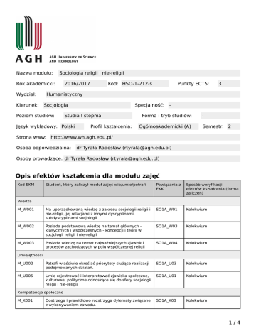 Nazwa modułu: Socjologia religii i nie-religii Rok akademicki: Wydział: Kierunek: 2016/2017 Kod: HSO-1-212-s Punkty ECTS: 3 Humanistyczny Socjologia Poziom studiów: Specjalność: Studia I stopnia Język wykładowy: Polski Profil kształcenia: - Forma i tryb studiów: Ogólnoakademicki (A) Semestr: 2 Strona www: http://www.wh.agh.edu.pl/ Osoba odpowiedzialna: dr Tyrała Radosław ([email protected]) Osoby prowadzące: dr Tyrała Radosław ([email protected]) Opis efektów kształcenia dla modułu zajęć Kod EKM Student, który zaliczył moduł zajęć wie/umie/potrafi Powiązania z EKK Sposób weryfikacji efektów kształcenia (forma zaliczeń) M_W001 Ma uporządkowaną wiedzę z zakresu socjologii religii i nie-religii, jej relacjami z innymi dyscyplinami, subdyscyplinami socjologii SO1A_W01 Kolokwium M_W002 Posiada podstawową wiedzę na temat głównych klasycznych i współczesnych - koncepcji i teorii w socjologii religii i nie-religii SO1A_W03 Kolokwium M_W003 Posiada wiedzę na temat najważniejszych zjawisk i procesów zachodzących w polu współczesnej religii SO1A_W04 Kolokwium M_U002 Potrafi właściwie określać priorytety służące realizacji podejmowanych działań. SO1A_U03 Kolokwium M_U005 Umie rejestrować i interpretować zjawiska społeczne, kulturowe, polityczne odnoszące się do sfery socjologii religii i nie-religii SO1A_U01 Kolokwium SO1A_K03 Kolokwium Wiedza Umiejętności Kompetencje społeczne M_K001 Dostrzega i prawidłowo rozstrzyga dylematy związane z wykonywaniem zawodu. 1/4 Karta modułu - Socjologia religii i nie-religii Matryca efektów kształcenia w odniesieniu do form zajęć Konwersatori um Zajęcia seminaryjne Zajęcia praktyczne Zajęcia terenowe Zajęcia warsztatowe Ma uporządkowaną wiedzę z zakresu socjologii religii i niereligii, jej relacjami z innymi dyscyplinami, subdyscyplinami socjologii + - - - - - - - - - - M_W002 Posiada podstawową wiedzę na temat głównych klasycznych i współczesnych koncepcji i teorii w socjologii religii i nie-religii + - - - - - - - - - - M_W003 Posiada wiedzę na temat najważniejszych zjawisk i procesów zachodzących w polu współczesnej religii + - - - - - - - - - - M_U002 Potrafi właściwie określać priorytety służące realizacji podejmowanych działań. + - - - - - - - - - - M_U005 Umie rejestrować i interpretować zjawiska społeczne, kulturowe, polityczne odnoszące się do sfery socjologii religii i niereligii + - - - - - - - - - - + - - - - - - - - - - E-learning Ćwiczenia projektowe M_W001 Inne Ćwiczenia laboratoryjne Forma zajęć Ćwiczenia audytoryjne Student, który zaliczył moduł zajęć wie/umie/potrafi Wykład Kod EKM Wiedza Umiejętności Kompetencje społeczne M_K001 Dostrzega i prawidłowo rozstrzyga dylematy związane z wykonywaniem zawodu. Treść modułu zajęć (program wykładów i pozostałych zajęć) Wykład Celem wykładów jest zapoznanie studentów z podstawową aparaturą pojęciową, zapleczem teoretycznym oraz badaniami empirycznymi z zakresu socjologii religii i nie-religii. Standardowo wykłady takie ograniczają się do przedstawienia stanu religijności oraz przemian, jakim ona podlega we współczesnym świecie. Tutaj zostaną one uzupełnione o analizę irreligii i irreligjności, traktowanej jako swoisty rewers religii i religijności. Program zajęć: 1.Powitanie, omówienie reguł gry. Historia i instytucjonalizacja socjologii religii. 2.Klasycy socjologii religii: E. Durkheim, M. Weber, S. Czarnowski i in. 3.Religia i religijność w ujęciu socjologicznym: typu definicji i sposoby konceptualizacji. 2/4 Karta modułu - Socjologia religii i nie-religii 4.Podstawowe pojęcia socjologii religii: magia/religia, kościół/sekta, typologia autorytetów religijnych, typologia istot religijnych. 5.Przemiany religii I: sekularyzacja i desekularyzacja. 6.Przemiany religii II: prywatyzacja i deprywatyzacja; strefa nie/religijnej niedookreśloności. 7.Nowe zjawiska religijne: nowe ruchy religijne, nowa duchowość, religie satyryczne. 8.Fundamentalizm religijny i antyreligijny; przemoc religijna. 9.Religia w ujęciu antropologicznym: rytuał, mit, czary, zjawiska mirakularne. 10.Religia a polityka: stosunki kościół-państwo w perspektywie socjologicznej. 11.W świetle wyników badań I: religijność i moralność społeczeństwa polskiego. 12.Irreligia, niewiara, ateizm – kwestie terminologiczne. 13.Sekularyzm jako ruch społeczny: Nowy Ateizm i nie tylko. 14.W świetle wyników badań II: zbiorowość polskich niewierzących. Sposób obliczania oceny końcowej Kurs zakończony zostanie kolokwium o charakterze pisemnym. Wpływ na ocenę końcową będzie też miała aktywność podczas zajęć (podniesienie oceny o max 0,5pkt) oraz wygłoszenie nieobowiązkowego referatu na zadany przez prowadzącego temat (podniesienie oceny o max 0,5pkt). Wymagania wstępne i dodatkowe Nie podano wymagań wstępnych lub dodatkowych. Zalecana literatura i pomoce naukowe 1) obowiązkowa: Berger Peter L. 1997. Święty baldachim. Elementy socjologicznej teorii religii, Kraków: ZW NOMOS. Kehrer Günther. 1997. Wprowadzenie do socjologii religii, Kraków: ZW NOMOS. 2) zalecana: Adamski Franciszek (red.). 1984. Socjologia religii. Wybór tekstów, Kraków: WAM. Baniak Józef. 2007. Desakralizacja kultu religijnego i świąt religijnych w Polsce. Studium socjologiczne, Kraków: ZW NOMOS. Barker Eileen. 2002. Nowe ruchy religijne, Kraków: ZW NOMOS. Beckford James. 2006. Teoria społeczna a religia, Kraków: ZW NOMOS. Beyer Peter. 2005. Religia i globalizacja, Kraków: ZW NOMOS. Borowik Irena. 1997. Procesy instytucjonalizacji i prywatyzacji religii w powojennej Polsce, Kraków: UJ. Borowik Irena. 2000. Odbudowywanie pamięci. Przemiany religijne w Środkowo-Wschodniej Europie po upadku komunizmu, Kraków: ZW NOMOS. Borowik Irena i Tadeusz Doktór. 2001. Pluralizm religijny i moralny w Polsce, Kraków: ZW NOMOS. Bowie Fiona. 2008. Antropologia religii. Wprowadzenie, Krak