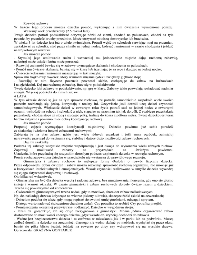 Rozwój ruchowy W trakcie tego procesu możesz dziecku pomóc, wykonując z nim ćwiczenia wymienione poniżej. Wczesny wiek przedszkolny (2.5 roku/4 lata) Twoje dziecko potrafi podskakiwać odrywając nóżki od ziemi, chodzić na paluszkach, chodzi na tyle pewnie, by przenieść kruchy przedmiot. Może utrzymać młodszą siostrzyczkę lub braciszka. W wieku 3 lat dziecko jest już o wiele zwinniejsze. Potrafi wejść po schodach stawiając nogi na przemian, zeskakiwać ze schodka, stać przez chwilę na jednej nodze, kołysać ramionami w czasie chodzenia i jeździć na trójkołowym rowerku. Jak możesz pomóc - Stymuluj jego umiłowanie ruchu i wzmacniaj mu jednocześnie mięśnie dając ruchomą zabawkę, na której może usiąść i która może poruszać; - Rozwijaj zwinność bawiąc się w zabawy wymagające skakania i chodzenia na paluszkach. - Pomóż mu ćwiczyć skakanie, bawiąc się w klasy lub trzymając je za ręce i skacząc na jednej nodze; - Ćwiczcie kołysanie ramionami maszerując w takt muzyki; Spraw mu trójkołowy rowerek, który wzmocni mięśnie łydek i zwiększy giętkość stóp; - Rozwijaj w nim fizyczne poczucie pewności siebie, zachęcając do zabaw na huśtawkach i na zjeżdżalni. Daj mu ruchomą zabawkę. Baw się w podskakiwanie Twoje dziecko lubi zabawy w podskakiwanie, np. grę w klasy. Zabawy takie pozwalają rozładować nadmiar energii. Włączaj podskoki do innych zabaw. 4 LATA W tym okresie dzieci są już na tyle sprawne ruchowo, że potrafią samodzielnie zaspokoić wiele swoich potrzeb: rozbierają się, jedzą, korzystają z toalety itd. Oczywiście jeśli dorośli uczą dzieci czynności samoobsługowych. Większość dzieci w czwartym roku życia potrafi stać na jednej nodze z otwartymi oczami, wchodzić na schody i schodzić z nich, stąpając na przemian tak jak dorośli. Z rozbiegu przeskakują przeszkodę, chodzą stopa za stopą i rzucając piłką, trafiają do kosza z półtora metra. Twoje dziecko jest teraz bardzo aktywne i powinno mieć dobrą koordynację ruchową. Jak możesz pomóc Proponuj zajęcia wymagające koordynacji mięśniowej. Dziecko powinno już sobie poradzić ze skakanką i wieloma innymi zabawami ruchowymi; Zabierają je na plac zabaw, gdzie jest wiele różnych urządzeń i jeśli masz ogródek, zainstaluj na trawniku przyrząd do wspinania się, stabilny i dający dużo możliwości zabaw ruchowych. Daj mu skakankę Podczas tej zabawy wszystkie mięśnie współpracują i jest okazja do wykonania wielu różnych ruchów. Zapewnij możliwość zabawy na przyrządach na świeżym powietrzu. Ustalenia, które przydadzą się wszystkim dorosłym podczas wspierania dziecka w rozwoju ruchowym. Porcja ruchu zapewniona dziecku w przedszkolu nie wystarcza do prawidłowego rozwoju. Gimnastyka i zabawy ruchowe to najlepsze formy dbałości o rozwój fizyczny dziecka. Przez odpowiedni dobór ćwiczeń i zabaw można rozwinąć sprawność ruchową organizmu, nie mówiąc już o korzyściach intelektualnych i emocjonalnych. Wszak czynności realizowane w umyśle dziecka wywodzą się z jego aktywności dotykowej i ruchowej. Oto kilka rad wskazówek. - Gimnastyka ma być dla dziecka wesołą i radosną zabawą, bez musztrowania i karcenia, gdy ono się głośno śmieje i wznosi okrzyki. W czasie gimnastyki i zabaw ruchowych dorosły ćwiczy razem z dzieckiem. Trzeba się powstrzymać od komentarza. - Ćwiczeniami gimnastycznymi trzeba nadać, gdy to możliwe, charakter zabaw naśladowczych. Np. dz. naśladują drzewa kołyszące na wietrze (skłony tułowia), skaczące żabki (skoki na czworakach) - Dzieciom podoba się także, gdy mogą popisać się swoimi umiejętnościami, odwagą i sprytem. Dlatego warto nadawać ćwiczeniom charakter zadań: Czy potrafisz to zrobić? Czy potrafisz przejść. - Pomieszczenia wcześniej przewietrzyć i odkurzyć. Dziecko w wygodnym stroju. - Jeżeli dz. gorączkuje, źle się czuje zrezygnować z gimnastyki. Można jednak organizować zabaw dostosowane do możliwości chorego dziecka, gdyż wesołe dz. szybciej dochodzi do zdrowia - Ważne jest bezpieczeństwo dziecka i to zarówno w mieszkaniu jak i w parku lub na podwórku. Muszą zadbać dorośli, a dziecko ma zrozumieć, dlaczego nie wolno skakać po meblach, wychylać się przez okno, bawić się piłką blisko jezdni, jeździć na rowerze po ulicy czy wdrapywać się na wysokie drzewa. Opracowała: GRAŻYNA GONTAREK