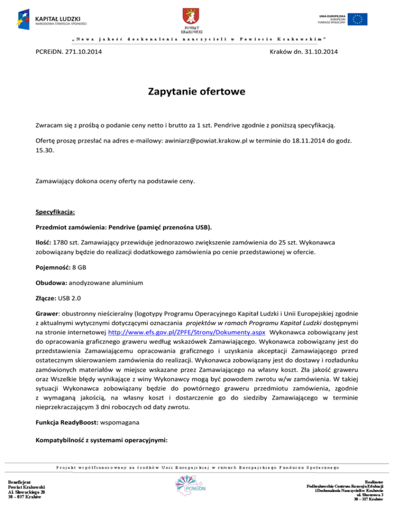PCREiDN. 271.10.2014 Kraków dn. 31.10.2014 Zapytanie ofertowe Zwracam się z prośbą o podanie ceny netto i brutto za 1 szt. Pendrive zgodnie z poniższą specyfikacją. Ofertę proszę przesłać na adres e-mailowy: [email protected] w terminie do 18.11.2014 do godz. 15.30. Zamawiający dokona oceny oferty na podstawie ceny. Specyfikacja: Przedmiot zamówienia: Pendrive (pamięć przenośna USB). Ilość: 1780 szt. Zamawiający przewiduje jednorazowo zwiększenie zamówienia do 25 szt. Wykonawca zobowiązany będzie do realizacji dodatkowego zamówienia po cenie przedstawionej w ofercie. Pojemność: 8 GB Obudowa: anodyzowane aluminium Złącze: USB 2.0 Grawer: obustronny nieścieralny (logotypy Programu Operacyjnego Kapitał Ludzki i Unii Europejskiej zgodnie z aktualnymi wytycznymi dotyczącymi oznaczania projektów w ramach Programu Kapitał Ludzki dostępnymi na stronie internetowej http://www.efs.gov.pl/ZPFE/Strony/Dokumenty.aspx Wykonawca zobowiązany jest do opracowania graficznego graweru według wskazówek Zamawiającego. Wykonawca zobowiązany jest do przedstawienia Zamawiającemu opracowania graficznego i uzyskania akceptacji Zamawiającego przed ostatecznym skierowaniem zamówienia do realizacji. Wykonawca zobowiązany jest do dostawy i rozładunku zamówionych materiałów w miejsce wskazane przez Zamawiającego na własny koszt. Zła jakość graweru oraz Wszelkie błędy wynikające z winy Wykonawcy mogą być powodem zwrotu w/w zamówienia. W takiej sytuacji Wykonawca zobowiązany będzie do powtórnego graweru przedmiotu zamówienia, zgodnie z wymaganą jakością, na własny koszt i dostarczenie go do siedziby Zamawiającego w terminie nieprzekraczającym 3 dni roboczych od daty zwrotu. Funkcja ReadyBoost: wspomagana Kompatybilność z systemami operacyjnymi: Windows 7 Windows Vista Windows XP Windows 2000 (SP4) Windows 8 Mac OS 10.5.x + Linux v.2.6.x + Ochrona złącza: TAK (np. wsuwane, zamykane) Źródło zasilania: Zasilanie z portu USB Prędkość zapisu: nie mniejsza niż 5 MB/s Prędkość odczytu: nie mniejsza niż 20 MB/s Temperatura przechowywania: -20 do +60°C Termin realizacji zamówienia: do 10 dni roboczych od dnia zaakceptowania projektu graficznego przez Zamawiającego. Zamawiający przewiduje zwiększenie zamówienia do 25 szt. (jednorazowo, do miesiąca od dnia podpisania umowy) Wykonawca zobowiązany będzie do realizacji dodatkowego zamówienia po cenie przedstawionej w ofercie. Wykonawca zobowiązany jest do złożenia wraz z ofertą oświadczenia stanowiącego załącznik nr 1 do niniejszego zapytania. Przedmioty zakupione zostaną w ramach projektu pt. „Nowa jakość doskonalenia Nauczycieli w Powiecie Krakowskim” współfinansowanego przez Unię Europejską ze środków Europejskiego Funduszu Społecznego Załącznik nr 1 ......................... Pieczątka wykonawcy OŚWIADCZENIE WYKONAWCY Składając ofertę w niniejszym postępowaniu oświadczam, że podmiot, który reprezentuję należy¹ nie należy¹ ² do grupy kapitałowej w rozumieniu ustawy z dnia 16 lutego 2007 r. o ochronie konkurencji i konsumentów (Dz. U. Nr 50, poz. 331, ze zm.5). ¹ niewłaściwe skreślić ² Wykonawcy, którzy skreślili tę opcję składają listę podmiotów należących do tej samej grupy kapitałowej. ………………………. , dn.…………………… ................................... podpis uprawnionego przedstawiciela wykonawcy