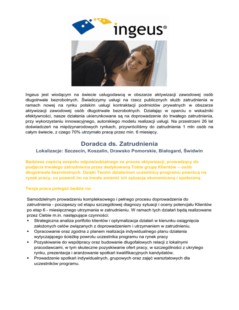 Ingeus jest wiodącym na świecie usługodawcą w obszarze aktywizacji zawodowej osób długotrwale bezrobotnych. Świadczymy usługi na rzecz publicznych służb zatrudnienia w ramach nowej na rynku polskim usługi kontraktacji podmiotów prywatnych w obszarze aktywizacji zawodowej osób długotrwale bezrobotnych. Działając w oparciu o wskaźniki efektywności, nasze działania ukierunkowane są na doprowadzenie do trwałego zatrudnienia, przy wykorzystaniu innowacyjnego, autorskiego modelu realizacji usługi. Na przestrzeni 26 lat doświadczeń na międzynarodowych rynkach, przywróciliśmy do zatrudnienia 1 mln osób na całym świecie, z czego 70% utrzymało pracę przez min. 6 miesięcy. Doradca ds. Zatrudnienia Lokalizacje: Szczecin, Koszalin, Drawsko Pomorskie, Białogard, Świdwin Będziesz częścią zespołu odpowiedzialnego za proces aktywizacji, prowadzący do podjęcia trwałego zatrudnienia przez dedykowaną Tobie grupę Klientów – osób długotrwale bezrobotnych. Dzięki Twoim działaniom uczestnicy programu powrócą na rynek pracy, co pozwoli im na trwałe zmienić ich sytuację ekonomiczną i społeczną. Twoja praca polegać będzie na: Samodzielnym prowadzeniu kompleksowego i pełnego procesu doprowadzenia do zatrudnienia - począwszy od etapu szczegółowej diagnozy sytuacji i oceny potencjału Klientów po etap 6 - miesięcznego utrzymania w zatrudnieniu. W ramach tych działań będą realizowane przez Ciebie m.in. następujące czynności: Strategiczna analiza portfolio klientów i optymalizacja działań w kierunku osiągnięcia założonych celów związanych z doprowadzeniem i utrzymaniem w zatrudnieniu. Opracowanie oraz zgodna z planem realizacja indywidualnego planu działania wytyczającego ścieżkę powrotu uczestnika programu na rynek pracy Pozyskiwanie do współpracy oraz budowanie długofalowych relacji z lokalnymi pracodawcami, w tym skuteczne pozyskiwanie ofert pracy, w szczególności z ukrytego rynku, prezentacja i aranżowanie spotkań kwalifikacyjnych kandydatów. Prowadzenie spotkań indywidualnych, grupowych oraz zajęć warsztatowych dla uczestników programu. Kandydat którego szukamy to osoba, która: Posiada conajmniej roczne doświadczenie w obszarze doradztwa zawodowego lub/i pośrednictwa pracy osób bezrobotnych lub/i pozostających bez zatrudnienia oraz wykształcenie wyższe – warunek konieczny. Jest silnie zdeterminowana, konsekwentna i niezłomna w dążeniu do osiągania długoterminowych celów. Czuje się komfortowo pracując w oparciu o wskaźniki efektywności w środowisku ukierunkowanym na realizację celów oraz posiada poparte sukcesami doświadczenie w tym obszarze. Posiada umiejętności budowania efektywnych relacji, jest proaktywna, perswazyjna, posiada naturalną potrzebę inicjatywy. Ma doświadczenie w planowaniu procesów lub koordynowaniu projektów związanych z rozwojem ludzi, posiada predyspozycje przywódcze. Potrafi analizować, wnioskować oraz stanowczo i odważnie reagować na wyzwania i wdrażać kreatywne, wychodzące poza schemat rozwiązania. Jest optymistyczna, przedsiębiorcza, operatywna, potrafi klarownie argumentować swoje stanowisko. Doskonale organizuje swój czas pracy, trafnie określa priorytety, jest elastyczna. Twoimi dodatkowymi atutami są: Znajomość i umiejętność stosowania metod coachingowych. Prawo jazdy i stały dostęp do samochodu. Pracując w Ingeus będziesz miał możliwość: Być częścią zespołu, który czerpie ogromną satysfakcję z pracy, która w realny i mierzalny sposób zmienia życie ludzi na lepsze. Zdobywania nowych kompetencji w światowej organizacji, gw której praca jest wartością. Wyzwolenia swojej kreatywności i wdrażania indywidualnych, autorskich rozwiązań. Rozwijania nowego innowacyjnego rynku usług, w obszarze partnerstwa publicznoprywatnego, wynikającego z zeszłorocznej nowelizacji ustawy o promocji zatrudnienia.. Korzystania z narzędzi wspomagających realizację celów (komputer, telefon). Wzięcia udziału w kompleksowym wdrożeniu przed rozpoczęciem pracy. Chcesz zmieniać z nami życie ludzi na lepsze? Wyślij dziś swoje CV i list motywacyjny na adres: [email protected]