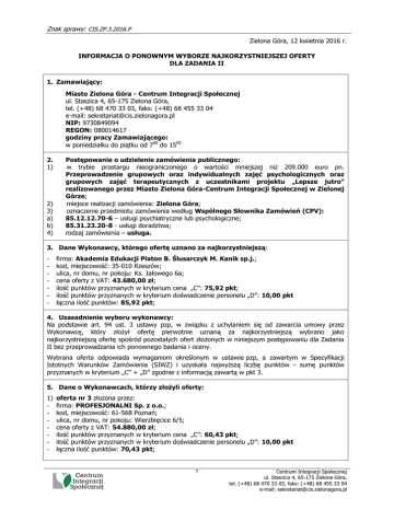 Znak sprawy: CIS.ZP.3.2016.P Zielona Góra, 12 kwietnia 2016 r. INFORMACJA O PONOWNYM WYBORZE NAJKORZYSTNIEJSZEJ OFERTY DLA ZADANIA II 1. Zamawiający: Miasto Zielona Góra - Centrum Integracji Społecznej ul. Staszica 4, 65-175 Zielona Góra, tel. (+48) 68 470 33 03, faks: (+48) 68 455 33 04 e-mail: [email protected] NIP: 9730849094 REGON: 080014617 godziny pracy Zamawiającego: w poniedziałku do piątku od 700 do 1500 2. 1) 2) 3) a) b) 4) Postępowanie o udzielenie zamówienia publicznego: w trybie przetargu nieograniczonego o wartości mniejszej niż 209.000 euro pn. Przeprowadzenie grupowych oraz indywidualnych zajęć psychologicznych oraz grupowych zajęć terapeutycznych z uczestnikami projektu „Lepsze jutro” realizowanego przez Miasto Zielona Góra-Centrum Integracji Społecznej w Zielonej Górze; miejsce realizacji zamówienia: Zielona Góra; oznaczenie przedmiotu zamówienia według Wspólnego Słownika Zamówień (CPV): 85.12.12.70-6 – usługi psychiatryczne lub psychologiczne; 85.31.23.20-8 - usługi doradztwa; rodzaj zamówienia – usługa. 3. Dane Wykonawcy, którego ofertę uznano za najkorzystniejszą: - firma: Akademia Edukacji Platon B. Ślusarczyk M. Kanik sp.j.; kod, miejscowość: 35-010 Rzeszów; ulica, nr domu, nr pokoju: Ks. Jałowego 6a; cena oferty z VAT: 43.680,00 zł; ilość punktów przyznanych w kryterium cena „C”: 75,92 pkt; ilość punktów przyznanych w kryterium doświadczenie personelu „D”: 10,00 pkt łączna ilość punktów: 85,92 pkt; 4. Uzasadnienie wyboru wykonawcy: Na podstawie art. 94 ust. 3 ustawy pzp, w związku z uchylaniem się od zawarcia umowy przez Wykonawcę, który złożył ofertę pierwotnie uznaną za najkorzystniejszą wybrano jako najkorzystniejszą ofertę spośród pozostałych ofert złożonych w niniejszym postępowaniu dla Zadania II bez przeprowadzania ich ponownego badania i oceny. Wybrana oferta odpowiada wymaganiom określonym w ustawie pzp, a zawartym w Specyfikacji Istotnych Warunków Zamówienia (SIWZ) i uzyskała najwyższą liczbę punktów - sumę punktów przyznanych w kryterium „C” + „D” zgodnie z informacją zawartą w pkt 3. 5. Dane o Wykonawcach, którzy złożyli oferty: 1) - oferta nr 3 złożona przez: firma: PROFESJONALNI Sp. z o.o.; kod, miejscowość: 61-568 Poznań; ulica, nr domu, nr pokoju: Wierzbięcice 6/5; cena oferty z VAT: 54.880,00 zł; ilość punktów przyznanych w kryterium cena „C”: 60,43 pkt; ilość punktów przyznanych w kryterium doświadczenie personelu „D”: 10,00 pkt łączna ilość punktów: 70,43 pkt; 1 Centrum Integracji Społecznej ul. Staszica 4, 65-175 Zielona Góra, tel. (+48) 68 470 33 03, faks: (+48) 68 455 33 04 e-mail: [email protected] Znak sprawy: CIS.ZP.3.2016.P 2) - oferta nr 5 złożona przez: firma: Centrum Kształcenia Kadr CK EDUKACJA; kod, miejscowość: 25-507 Kielce; ulica, nr domu, nr pokoju: Sienkiewicza 34; cena oferty z VAT: 38.561,60 zł; uznana za odrzuconą na podstawie art. 24 ust. 4 ustawy pzp, z uwagi na złożenie jej przez Wykonawcę wykluczonego z udziału w postępowaniu na podstawie art. 24 ust. 2 pkt 4 ustawy pzp; 3) - oferta nr 6 złożona przez: firma: FONTE Elżbieta Cudo; kod, miejscowość: 65-034 Zielona Góra; ulica, nr domu, nr pokoju: Bohaterów Westerplatte 11; cena oferty z VAT: 78.400,00 zł; ilość punktów przyznanych w kryterium cena „C”: 42,30 pkt; ilość punktów przyznanych w kryterium doświadczenie personelu „D”: 10,00 pkt łączna ilość punktów: 52,30 pkt; 4) - oferta nr 7 złożona przez: firma: Centrum Biznesu i Promocji Kadr Sp. z o.o.; kod, miejscowość: 27-400 Ostrowiec Świętokrzyski; ulica, nr domu, nr pokoju: os. Słoneczne 14; cena oferty z VAT: 101.897,60 zł; ilość punktów przyznanych w kryterium cena „C”: 32,55 pkt; ilość punktów przyznanych w kryterium doświadczenie personelu „D”: 10,00 pkt łączna ilość punktów: 42,55 pkt; 5) - oferta nr 10 złożona przez: firma: PRO-EDU Sp. j., D.Karmazyn, R Krokocki; kod, miejscowość: 96-100 Skierniewice; ulica, nr domu, nr pokoju: Mszczoniowska 33/35; cena oferty z VAT: 36.848,00 zł; ilość punktów przyznanych w kryterium cena „C”: 90,00 pkt; ilość punktów przyznanych w kryterium doświadczenie personelu „D”: 10,00 pkt łączna ilość punktów: 100,00 pkt; 6) - oferta nr 11 złożona przez: firma: Nestor Group Sp. z o.o.; kod, miejscowość: 58-100 Świdnica; ulica, nr domu, nr pokoju: Rynek 39-40; cena oferty z VAT: 76.160,00 zł; uznana za odrzuconą na podstawie art. 24 ust. 4 ustawy pzp, z uwagi na złożenie jej przez Wykonawcę wykluczonego z udziału w postępowaniu na podstawie art. 24 ust. 2 pkt 4 ustawy pzp; 7) - oferta nr 13 złożona przez: firma: Akademia Edukacji Platon B. Ślusarczyk M. Kanik sp.j.; kod, miejscowość: 35-010 Rzeszów; ulica, nr domu, nr pokoju: Ks. Jałowego 6a; cena oferty z VAT: 43.680,00 zł; ilość punktów przyznanych w kryterium cena „C”: 75,92 pkt; ilość punktów przyznanych w kryterium doświadczenie personelu „D”: 10,00 pkt łączna ilość punktów: 85,92 pkt; 8) - oferta nr 14 złożona przez: firma: Miedziowe Centrum Kształcenia Kadr Sp. z o.o.; kod, miejscowość: 59-301 Lubin; ulica, nr domu, nr pokoju: M. Skłodowskiej – Curie 84; cena oferty z VAT: 67.200,00 zł; ilość punktów przyznanych w kryterium cena „C”: 49,35 pkt; ilość punktów przyznanych w kryterium doświadczenie personelu „D”: 10,00 pkt 2 Centrum Integracji Społecznej ul. Staszica 4, 65-175 Zielona Góra, tel. (+48) 68 470 33 03, faks: (+48) 68 455 33 04 e-mail: [email protected] Znak sprawy: CIS.ZP.3.2016.P - łączna ilość punktów: 59,35 pkt; 9) - oferta nr 15 złożona przez: firma: Centrum Szkoleniowo – Terapeutyczne SELF, M. Mołoń, T. Kobylański s.c.; kod, miejscowość: 35-051 Rzeszów; ulica, nr domu, nr pokoju: Chodkiewicza 7/9 cena oferty z VAT: 109.706,00 zł; uznana za odrzuconą na podstawie art. 24 ust. 4 ustawy pzp, z uwagi na złożenie