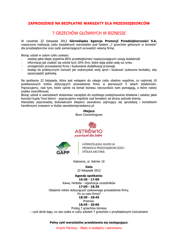 ZAPROSZENIE NA BEZPŁATNE WARSZATY DLA PRZEDSIĘBIORCÓW 7 GRZECHÓW GŁÓWNYCH W BIZNESIE W czwartek 22 listopada 2012 Górnośląska Agencja Promocji Przedsiębiorczości S.A. rozpoczyna realizację cyklu bezpłatnych warsztatów pod hasłem „7 grzechów głównych w biznesie” dla przedsiębiorców oraz osób zamierzających prowadzić własną firmę. Biorąc udział w całym cyklu zyskasz: − wiedzę jakie błędy popełnia 80% przedsiębiorstw rozpoczynających swoją działalność − informacje jak znaleźć się wśród tych 20% firm, które dają sobie radę na rynku − umiejętności prowadzenia firmy i budowania dodatkowej przewagi − dostęp do praktycznych ćwiczeń jak wykorzystać swój spryt i budować zyskowne kontakty, aby zaoszczędzić gotówkę. Na spotkaniu 22 listopada, które jest wstępem do całego cyklu obalimy wspólnie, co najmniej 10 podstawowych mitów dotyczących prowadzenia firmy w pierwszych 5 latach działalności. Popracujemy, nad tym, które opinie na temat biznesu rzeczywiście nam pomagają, a które należy szybko zweryfikować. Biorąc udział w warsztatach dostaniesz narzędzie do szybkiego podejmowania działania i ustalisz jakie korzyści kupią Twoi klienci - popracujemy wspólnie nad tematem od strony potrzeb klienta. Warsztaty poprowadzą doświadczeni eksperci zawodowo zajmujący się sprzedażą i kontaktami handlowymi zrzeszeni w klubie zawodowisprzedawcy.pl Miejsce Biuro Coworkingowe Katowice, ul. Astrów 10 Data 22 listopada 2012 Agenda spotkania: 16:30 - 17:00 Kawa, herbata - rejestracja uczestników 17:00 - 18:30 Obalanie mitów dotyczących zyskownego prowadzenia firmy. Po co nam firma? 18:30 - 18:45 Przerwa 18:45 - 20:00 Prolog 7 grzechów biznesu – czyli skrót tego, co nas czeka w cyklu szkoleń 7 grzechów z przykładowymi ćwiczeniami Pełny cykl warsztatów przedstawia się następująco: Grzech Pierwszy - Błędy w podejściu i planowaniu "Strategiczny i operacyjny plan działania Twojego biznesu" Grzech Drugi - Brak technik wywiadowczych "Jak zbierać, analizować i wykorzystywać informacje wewnątrz naszej organizacji i w organizacji konkurencji." Grzech Trzeci - Wciskanie cech produktów "Jak komunikować się z klientem językiem korzyści tak, żeby sam chciał kupić." Grzech Czwarty - Firma to Ja "Im mniej pracujesz tym lepiej. Procedury, kontrola - tworzenie i rozwój" Grzech Piąty - Grzechy prawno-podatkowe "Nie walcz z systemem - używaj systemu" Grzech Szósty - Brak incepcji "Zaszczep ideę w umysłach swoich klientów, kontrahentów i partnerów biznesowych" Grzech Siódmy - Palenie mostów "Jak budować trwałe i zyskowne relacje w biznesie" Terminy poszczególnych warsztatów będą ustalone z uczestnikami spotkania wstępnego tak, aby dopasować się do ich możliwości czasowych. Prosimy o zgłoszenia, poprzez zamieszczony rejestracyjnego, najpóźniej do 19 listopada 2012. poniżej link do elektronicznego https://gapp.pl/index.php?page=7-grzechow-glownych-w-biznesie&hl=pl Więcej informacji na stronie internetowej www.astrow10.pl Ilość miejsc ograniczona. ZAPRASZAMY! formularza