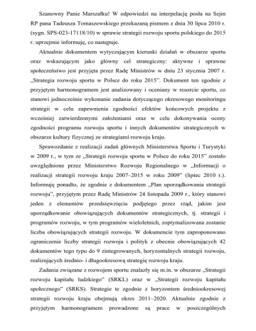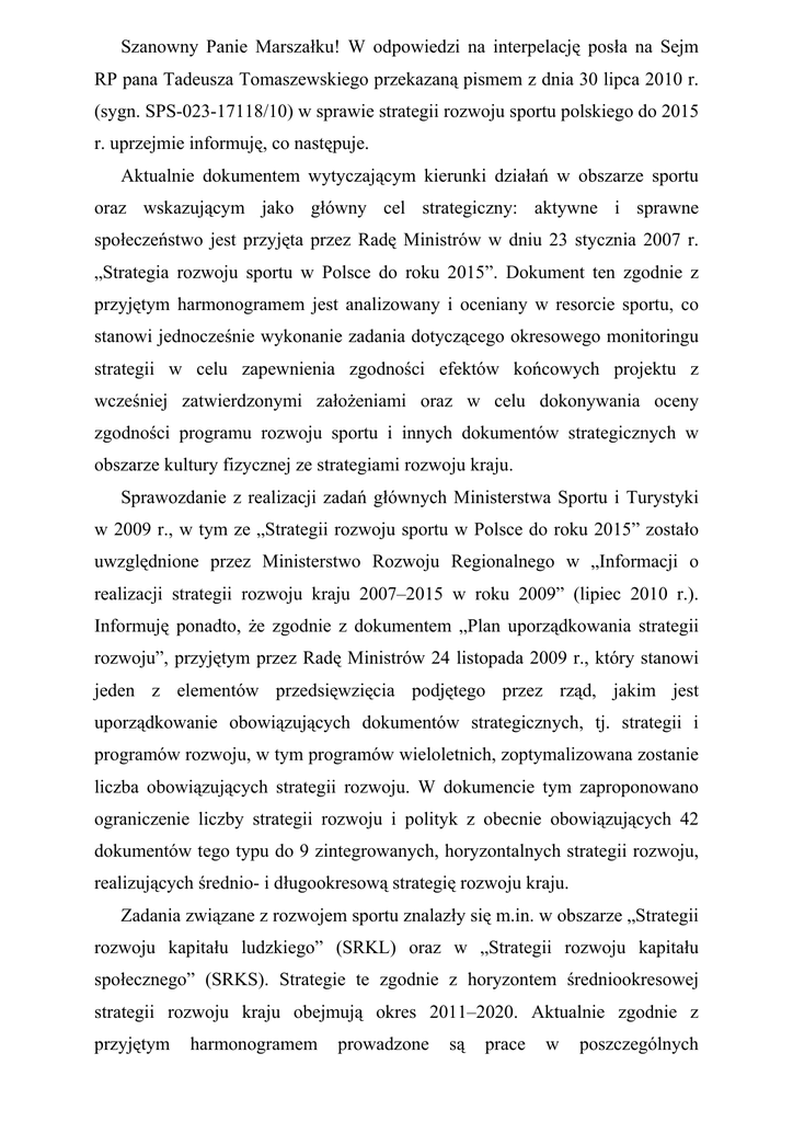 Szanowny Panie Marszałku! W odpowiedzi na interpelację posła na Sejm RP pana Tadeusza Tomaszewskiego przekazaną pismem z dnia 30 lipca 2010 r. (sygn. SPS-023-17118/10) w sprawie strategii rozwoju sportu polskiego do 2015 r. uprzejmie informuję, co następuje. Aktualnie dokumentem wytyczającym kierunki działań w obszarze sportu oraz wskazującym jako główny cel strategiczny: aktywne i sprawne społeczeństwo jest przyjęta przez Radę Ministrów w dniu 23 stycznia 2007 r. „Strategia rozwoju sportu w Polsce do roku 2015”. Dokument ten zgodnie z przyjętym harmonogramem jest analizowany i oceniany w resorcie sportu, co stanowi jednocześnie wykonanie zadania dotyczącego okresowego monitoringu strategii w celu zapewnienia zgodności efektów końcowych projektu z wcześniej zatwierdzonymi założeniami oraz w celu dokonywania oceny zgodności programu rozwoju sportu i innych dokumentów strategicznych w obszarze kultury fizycznej ze strategiami rozwoju kraju. Sprawozdanie z realizacji zadań głównych Ministerstwa Sportu i Turystyki w 2009 r., w tym ze „Strategii rozwoju sportu w Polsce do roku 2015” zostało uwzględnione przez Ministerstwo Rozwoju Regionalnego w „Informacji o realizacji strategii rozwoju kraju 2007–2015 w roku 2009” (lipiec 2010 r.). Informuję ponadto, że zgodnie z dokumentem „Plan uporządkowania strategii rozwoju”, przyjętym przez Radę Ministrów 24 listopada 2009 r., który stanowi jeden z elementów przedsięwzięcia podjętego przez rząd, jakim jest uporządkowanie obowiązujących dokumentów strategicznych, tj. strategii i programów rozwoju, w tym programów wieloletnich, zoptymalizowana zostanie liczba obowiązujących strategii rozwoju. W dokumencie tym zaproponowano ograniczenie liczby strategii rozwoju i polityk z obecnie obowiązujących 42 dokumentów tego typu do 9 zintegrowanych, horyzontalnych strategii rozwoju, realizujących średnio- i długookresową strategię rozwoju kraju. Zadania związane z rozwojem sportu znalazły się m.in. w obszarze „Strategii rozwoju kapitału ludzkiego” (SRKL) oraz w „Strategii rozwoju kapitału społecznego” (SRKS). Strategie te zgodnie z horyzontem średniookresowej strategii rozwoju kraju obejmują okres 2011–2020. Aktualnie zgodnie z przyjętym harmonogramem prowadzone są prace w poszczególnych zadaniowych, zintegrowanych grupach roboczych, w których uczestniczą m.in. przedstawiciele Ministerstwa Sportu i Turystyki. Przygotowanie 9 zintegrowanych strategii rozwoju w istotny sposób wpłynie na system dokumentów strategicznych. Zgodnie z informacjami zawartymi w dokumentach Ministerstwa Rozwoju Regionalnego część z dotychczasowych dokumentów przestanie obowiązywać, inne zaś zmienią swoją formułę. W końcowej fazie prac nad zintegrowanymi strategiami rozwoju zespoły międzyresortowe odpowiedzialne za przygotowanie tych strategii dokonają analizy przydatności dotychczas obowiązujących dokumentów, zarówno strategii/polityk, jak i programów. Część z dotychczasowych dokumentów, w zależności od ich przydatności oraz podstawy prawnej, zostanie uznanych za nieobowiązujące, część pozostanie w systemie do czasu zakończenia okresu ich obowiązywania, tematyka innych zaś zostanie ujęta w dokumentach typu program rozwoju. Jednocześnie 25 czerwca 2010 r. Sejm RP uchwalił ustawę o sporcie (Dz. U. Nr 129, poz.857), która zawiera nowe regulacje sportu dostosowane do standardów europejskich, ogranicza prawną reglamentację sportu i umacnia pozycję polskich związków sportowych. Określając w art. 1 ustawy jej zakres przedmiotowy, przyjęto, że szereg spraw nie wymaga tworzenia przepisów prawa powszechnie obowiązującego, a pożądany stan rzeczy może zostać osiągnięty regulacjami wewnętrznymi jednostek organizacyjnych działających w sferze sportu. Ustawa o sporcie nie określa reguł uprawiania sportu, a jedynie tryb postępowania, dzięki któremu zapewniona będzie ochrona ww. reguł. Podstawowe założenia, które legły u podstaw tworzenia nowej regulacji w obszarze sportu, to: 1. Państwo nie powinno w zasadzie ingerować w sport, gdy nie ma on charakteru uprawiania lub uczestniczenia we współzawodnictwie organizowanym przez polskie związki sportowe lub z ich upoważnienia przez inne podmioty. 2 2. Uprawianie sportu poza systemem współzawodnictwa sportowego organizowanego przez polskie związki sportowe jest wolne i nie podlega reglamentacji prawnej. 3. Zasady uprawiania sportu określają właściwe polskie związki sportowe, uwzględniając zasady międzynarodowych federacji sportowych. To na polskich związkach sportowych spoczywa zadanie ustanawiania norm w danym sporcie w zakresie przypisanym im projektowaną ustawą. 4. Uznaje się podstawową zasadę europejskiego modelu sportu, zgodnie z którą w państwie działa jedna narodowa federacja w danym sporcie. Polski związek sportowy posiada więc w tym zakresie wyłączne kompetencje. Wyznacza on samodzielnie sportowe i organizacyjne reguły w danym sporcie oraz zapewnia ich przestrzeganie przez prowadzenie i nadzór nad współzawodnictwem sportowym. Wyżej wymieniona ustawa o sporcie wchodzi w życie 16 października 2010 r., natomiast zgodnie z przepisami przejściowymi polskie związki sportowe oraz kluby sportowe zobowiązane są do dostosowania swojej działalności do wymagań nowej ustawy o sporcie w terminie 2 lat od dnia jej wejścia w życie. Ministerstwo Sportu i Turystyki, mając na uwadze nowe uwarunkowania: — wynikające z aktualnej polityki rządu w sprawie strategii rozwoju, — dotyczące wejścia w życie traktatu z Lizbony ustanawiającego sport formalnym obszarem kompetencji wspólnotowej, a także uwzględniając przygotowywany Europejski Program Sportowy, którego zawartość w znacznym zakresie opierać się będzie na zapisach dokumentów Komisji Europejskiej: „Biała księga na temat sportu” oraz „Wytyczne UE dotyczące aktywności fizycz