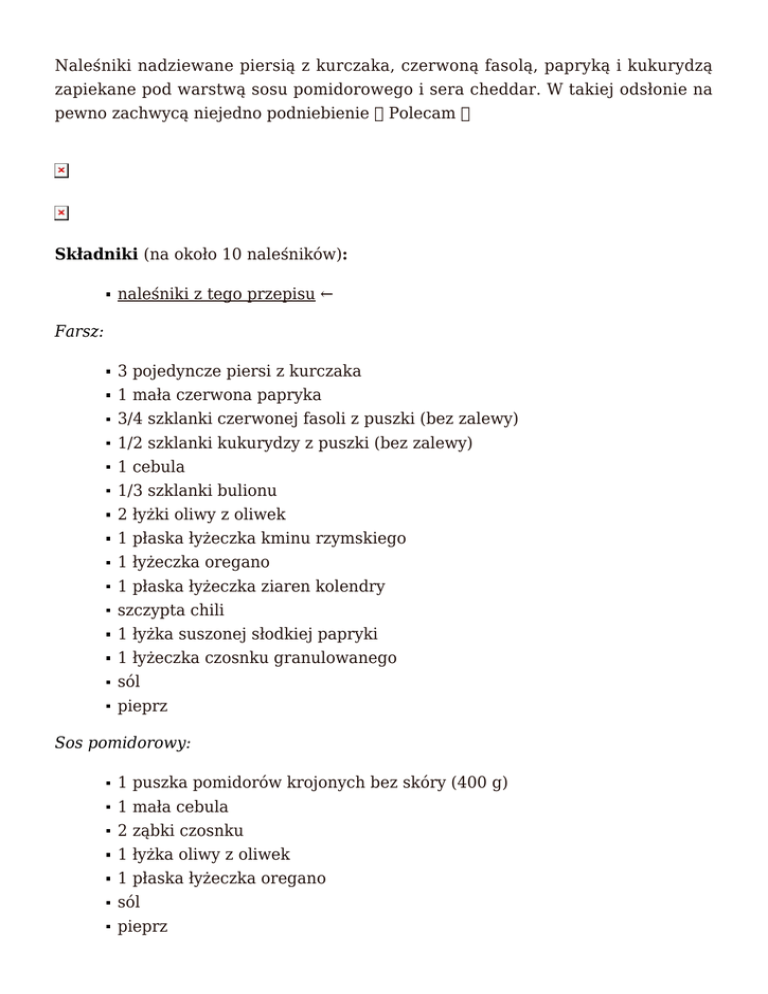 Naleśniki nadziewane piersią z kurczaka, czerwoną fasolą, papryką i kukurydzą zapiekane pod warstwą sosu pomidorowego i sera cheddar. W takiej odsłonie na pewno zachwycą niejedno podniebienie Polecam Składniki (na około 10 naleśników): naleśniki z tego przepisu ← Farsz: 3 pojedyncze piersi z kurczaka 1 mała czerwona papryka 3/4 szklanki czerwonej fasoli z puszki (bez zalewy) 1/2 szklanki kukurydzy z puszki (bez zalewy) 1 cebula 1/3 szklanki bulionu 2 łyżki oliwy z oliwek 1 płaska łyżeczka kminu rzymskiego 1 łyżeczka oregano 1 płaska łyżeczka ziaren kolendry szczypta chili 1 łyżka suszonej słodkiej papryki 1 łyżeczka czosnku granulowanego sól pieprz Sos pomidorowy: 1 puszka pomidorów krojonych bez skóry (400 g) 1 mała cebula 2 ząbki czosnku 1 łyżka oliwy z oliwek 1 płaska łyżeczka oregano sól pieprz około 100 g sera cheddar Przygotowanie: Farsz: Na patelni rozgrzewamy oliwę z oliwek. Wrzucamy drobno pokrojone piersi z kurczaka, posiekaną cebulę, utarty w moździerzu kmin rzymski razem z kolendrą, oregano, chili i odrobinę soli. Wszystko lekko rumienimy, dodajemy drobno pokrojoną paprykę, suszony czosnek i paprykę w proszku. Mieszamy i chwilę podsmażamy. Następnie wlewamy bulion i gotujemy na małym ogniu, aż woda odparuje i papryka lekko zmięknie. Dodajemy fasolę i kukurydzę, mieszamy i doprawiamy solą. Sos pomidorowy: Na patelni rozgrzewamy oliwę z oliwek, wrzucamy posiekaną cebulę i lekko rumienimy. Dodajemy przeciśnięty przez praskę czosnek i chwilkę podsmażamy. Następnie dokładamy pomidory z puszki (razem z zalewą) i oregano. Gotujemy na małym ogniu przez około 5 minut. Doprawiamy solą i pieprzem. Na każdy naleśnik nakładamy trochę farszu, zawijamy jak na krokiety i układamy w naczyniu do zapiekania. Całość zalewamy przygotowanym sosem i posypujemy startym serem. Zapiekamy w piekarniku nagrzanym do 180°C przez około 20 minut. Smacznego Pieczone kieszonki z piersi kurczaka nadziewane serkiem topionym z szynką oraz listkami bazylii. Proste do wykonania i nie wymagają dużo pracy. Pomysł zrodził się sam Chciałam przygotować szybki obiad więc użyłam składników, które miałam pod ręką. Wyszły przepyszne, soczyste i na pewno zrobię je ponownie w najbliższym czasie Składniki: 4 pojedyncze piersi z kurczaka 100 g serka topionego z szynką (użyłam serka Hochland) 8 dużych listków bazylii 2 łyżki oliwy z oliwek sól pieprz Przygotowanie: Piersi kurczaka oczyścić z błonek i kostek. Ostrym i cienkim nożem zrobić kieszonkę w połowie wysokości fileta, uważając aby nie przeciąć boków. Wypełnić serkiem topionym i włożyć po 2 listki bazylii, spiąć szpikulcami do mięsa lub wykałaczkami. Gotowe kieszonki wysmarować oliwą z oliwek i doprawić solą i pieprzem. Przełożyć na blaszkę wyłożoną papierem do pieczenia. Piec w piekarniku nagrzanym do 190°C przez około 25 minut (duże piersi piec 30 minut). Smacznego Sycąca i przepyszna zupa z zieloną fasolką szparagową, piersią kurczaka, marchewką i niezwykle zdrową kaszą orkiszową. Dodanie cząbru i czosnku podnosi jej walory smakowe i sprawia, że nie da się jej oprzeć Polecam Składniki: 2 pojedyncze piersi z kurczaka 300 g fasolki szparagowej (użyłam zielonej i żółtej) 1 marchewka 50 g kaszy orkiszowej 1 mała cebula 2 ząbki czosnku 1 i 1/2 l bulionu 120 g śmietany kremówki 30% 1 łyżka masła 2 łyżki oleju rzepakowego 1 płaska łyżeczka cząbru 1 płaska łyżka czosnku granulowanego sól pieprz Przygotowanie: Piersi z kurczaka oczyścić z błonek i kostek i pokroić w kostkę. Na patelni rozgrzać olej z masłem, wrzucić pokrojone mięso i posiekaną cebulkę. Lekko posolić i smażyć do lekkiego zrumienienia. Dodać obraną i pokrojoną w kostkę marchewkę, przeciśnięty przez praskę czosnek i przez chwilkę podsmażać. Fasolkę szparagową umyć, przyciąć końce, pokroić na kawałki i wrzucić do garnka. Wlać bulion i dodać zawartość patelni. Gotować około 4 minut, następnie dodać kaszę orkiszową (wypłukaną), cząber i czosnek granulowany. Wymieszać i gotować do miękkości fasolki i kaszy (kilkanaście minut). Wlać śmietanę kremówkę, wymieszać i doprawić solą i pieprzem. Smacznego Pyszne, aromatyczne i lekko słodkie curry z kurczakiem, czerwoną soczewicą, pomidorami, melonem i chipsami z marchewki. Gotowe curry podałam w wydrążonym melonie, którego część użyłam do przygotowania potrawy. Ciekawie się prezentuje i smakuje obłędnie… Polecam Składniki: 4 pojedyncze piersi z kurczaka 150 g czerwonej soczewicy 1 puszkę krojonych pomidorów bez skóry (400 g) 1 marchewka 1/3 serka „Apetina”-Papaja i curry (opcjonalnie) 1/4 małego melona (cały ważył 900 g) 1 cebula 3 ząbki czosnku 1 szklanka bulionu drobiowego 350 g mleka kokosowego 80 g zielonej pasty curry świeży imbir (około 4 cm) 1 płaska łyżka kurkumy 2 łyżki sosu rybnego ciemny sos sojowy olej do smażenia (około 3-4 łyżek) 2 łyżki soku z limonki 1 łyżeczka mąki ziemniaczanej (opcjonalnie) sól Chipsy z marchewki: 1 mała marchewka odrobina oleju Przygotowanie: Piersi kurczaka myjemy, osuszamy i kroimy w kostkę. Soczewicę gotujemy według przepisu na opakowaniu i odcedzamy. Na dużej patelni rozgrzewamy olej i wrzucamy pokrojone piersi z kurczaka, posiekaną cebulę, pokrojoną w kostkę marchewkę, starty na małych oczkach imbir i kurkumę. Delikatnie solimy, mieszamy i smażymy. Pod koniec smażenia wrzucamy drobniutko posiekany czosnek. Następnie wlewamy bulion, dodajemy pastę curry, sos rybny, serek, pomidory (razem z zalewą), drobno pokrojony miąższ melona i mleko kokosowe. Gotujemy na malutkim ogniu około 8 minut. Dodajemy ugotowaną soczewicę, sok z limonki i mieszamy. W razie potrzeby curry możemy zagęścić mąką ziemniaczaną, którą rozrabiamy z odrobiną wody i pomału wlewamy ciągle mieszając. Całość doprawiamy sosem sojowym. Gotowe cur