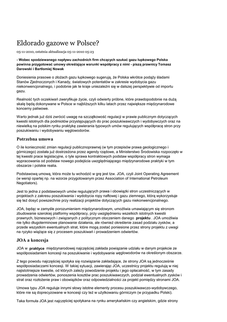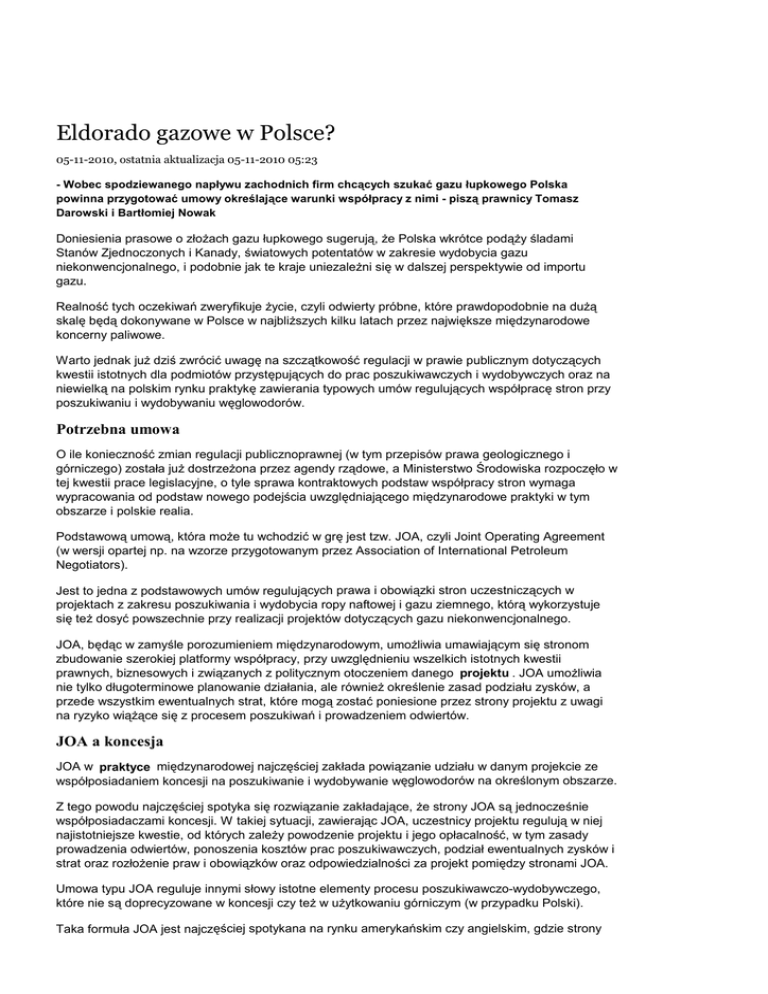Eldorado gazowe w Polsce? 05-11-2010, ostatnia aktualizacja 05-11-2010 05:23 - Wobec spodziewanego napływu zachodnich firm chcących szukać gazu łupkowego Polska powinna przygotować umowy określające warunki współpracy z nimi - piszą prawnicy Tomasz Darowski i Bartłomiej Nowak Doniesienia prasowe o złoŜach gazu łupkowego sugerują, Ŝe Polska wkrótce podąŜy śladami Stanów Zjednoczonych i Kanady, światowych potentatów w zakresie wydobycia gazu niekonwencjonalnego, i podobnie jak te kraje uniezaleŜni się w dalszej perspektywie od importu gazu. Realność tych oczekiwań zweryfikuje Ŝycie, czyli odwierty próbne, które prawdopodobnie na duŜą skalę będą dokonywane w Polsce w najbliŜszych kilku latach przez największe międzynarodowe koncerny paliwowe. Warto jednak juŜ dziś zwrócić uwagę na szczątkowość regulacji w prawie publicznym dotyczących kwestii istotnych dla podmiotów przystępujących do prac poszukiwawczych i wydobywczych oraz na niewielką na polskim rynku praktykę zawierania typowych umów regulujących współpracę stron przy poszukiwaniu i wydobywaniu węglowodorów. Potrzebna umowa O ile konieczność zmian regulacji publicznoprawnej (w tym przepisów prawa geologicznego i górniczego) została juŜ dostrzeŜona przez agendy rządowe, a Ministerstwo Środowiska rozpoczęło w tej kwestii prace legislacyjne, o tyle sprawa kontraktowych podstaw współpracy stron wymaga wypracowania od podstaw nowego podejścia uwzględniającego międzynarodowe praktyki w tym obszarze i polskie realia. Podstawową umową, która moŜe tu wchodzić w grę jest tzw. JOA, czyli Joint Operating Agreement (w wersji opartej np. na wzorze przygotowanym przez Association of International Petroleum Negotiators). Jest to jedna z podstawowych umów regulujących prawa i obowiązki stron uczestniczących w projektach z zakresu poszukiwania i wydobycia ropy naftowej i gazu ziemnego, którą wykorzystuje się teŜ dosyć powszechnie przy realizacji projektów dotyczących gazu niekonwencjonalnego. JOA, będąc w zamyśle porozumieniem międzynarodowym, umoŜliwia umawiającym się stronom zbudowanie szerokiej platformy współpracy, przy uwzględnieniu wszelkich istotnych kwestii prawnych, biznesowych i związanych z politycznym otoczeniem danego projektu . JOA umoŜliwia nie tylko długoterminowe planowanie działania, ale równieŜ określenie zasad podziału zysków, a przede wszystkim ewentualnych strat, które mogą zostać poniesione przez strony projektu z uwagi na ryzyko wiąŜące się z procesem poszukiwań i prowadzeniem odwiertów. JOA a koncesja JOA w praktyce międzynarodowej najczęściej zakłada powiązanie udziału w danym projekcie ze współposiadaniem koncesji na poszukiwanie i wydobywanie węglowodorów na określonym obszarze. Z tego powodu najczęściej spotyka się rozwiązanie zakładające, Ŝe strony JOA są jednocześnie współposiadaczami koncesji. W takiej sytuacji, zawierając JOA, uczestnicy projektu regulują w niej najistotniejsze kwestie, od których zaleŜy powodzenie projektu i jego opłacalność, w tym zasady prowadzenia odwiertów, ponoszenia kosztów prac poszukiwawczych, podział ewentualnych zysków i strat oraz rozłoŜenie praw i obowiązków oraz odpowiedzialności za projekt pomiędzy stronami JOA. Umowa typu JOA reguluje innymi słowy istotne elementy procesu poszukiwawczo-wydobywczego, które nie są doprecyzowane w koncesji czy teŜ w uŜytkowaniu górniczym (w przypadku Polski). Taka formuła JOA jest najczęściej spotykana na rynku amerykańskim czy angielskim, gdzie strony JOA są zarazem stronami w koncesji. W Europie kontynentalnej spotyka się natomiast dosyć często rozwiązania projektowe zakładające, Ŝe niektóre strony JOA nie są jednocześnie stronami w danej koncesji. Dzieje się tak najczęściej w przypadku, gdy JOA obejmuje powołanie operatora kontraktowego, którego zadaniem jest wykonywanie niezbędnych czynności operacyjnych w imieniu posiadaczy koncesji. NaleŜy jednak zaznaczyć, Ŝe powołanie w ramach JOA operatora do zarządzania danym projektem nie eliminuje odpowiedzialności posiadaczy koncesji za naleŜyte wykonywanie praw i obowiązków koncesyjnych. Od czego zacząć Na pewno kontrahenci muszą zacząć od podstawowych kwestii, czyli od definicji, jakie będą obowiązywały w JOA, czasu trwania JOA i naturalnie przedmiotu umowy. Sprawą waŜną jest równieŜ ustalenie udziałów stron w JOA. Biorąc pod uwagę, iŜ JOA jest umową w większości przypadków wielostronną – ta kwestia wydaję się zasadnicza, szczególnie w razie ewentualnych sporów między stronami bądź w sytuacji, kiedy tylko jedna ze stron JOA jest posiadaczem koncesji i chce się bardziej zabezpieczyć w relacjach z partnerami nieponoszącymi odpowiedzialności w stosunku do organu koncesyjnego. W praktyce JOA zawiera postanowienia dotyczące: zabezpieczeń – strony umowy mogą wymagać zapewnienia przez kaŜdą ze stron jakiegoś rodzaju zabezpieczenia wykonania ich zobowiązań wynikających z JOA; określenia udziałów w projekcie – większość koncesji nie kreuje bowiem indywidualnego udziału kaŜdego posiadacza koncesji, zamiast tego koncesja zostaje przyznana wszystkim jej posiadaczom, którzy ponoszą odpowiedzialność solidarną. Istotą JOA jest zatem ustanowienie indywidualnych udziałów stron – wyraŜonych jako procentowa część ogółu udziałów wszystkich stron JOA we wszystkich prawach i obowiązkach wynikających z koncesji. Oczywiście wielkość udziałów stron przy zawarciu JOA będzie wynikiem negocjacji pomiędzy nimi. Przygotujmy się na zmiany Ponadto JOA powinna regulować: zakres współdziałania stron w ramach projektu (na przykład definiując operacje wspólne i operacje wyłączone); kwestie dotyczące operatora (tj. zasady wyboru operatora, rolę operatora, procedurę usunięcia lub zmiany operatora, a w razie potrzeby operatorów hybrydowych); a takŜe zagad