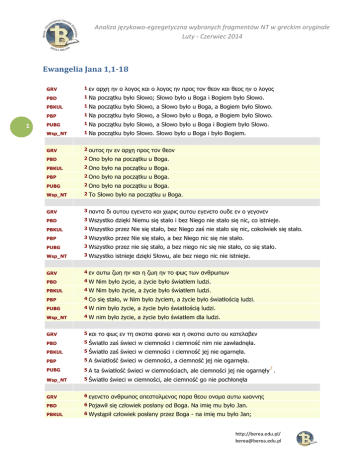 Analiza językowo-egzegetyczna wybranych fragmentów NT w greckim oryginale Luty - Czerwiec 2014 Ewangelia Jana 1,1-18 1 GRV 1 εν PBD 1 αρχη ην ο λογος και ο λογος ην προς τον θεον και θεος ην ο λογος Na początku było Słowo; Słowo było u Boga i Bogiem było Słowo. PBKUL 1 Na początku było Słowo, a Słowo było u Boga, a Bogiem było Słowo. PBP 1 Na początku było Słowo, a Słowo było u Boga, a Bogiem było Słowo. PUBG 1 Na początku było Słowo, a Słowo było u Boga i Bogiem było Słowo. Wsp_NT 1 Na początku było Słowo. Słowo było u Boga i było Bogiem. GRV 2 ουτος ην εν αρχη προς τον θεον PBD 2 Ono było na początku u Boga. PBKUL 2 Ono było na początku u Boga. PBP 2 Ono było na początku u Boga. PUBG 2 Ono było na początku u Boga. Wsp_NT 2 GRV 3 παντα PBD 3 Wszystko dzięki Niemu się stało i bez Niego nie stało się nic, co istnieje. PBKUL 3 Wszystko przez Nie się stało, bez Niego zaś nie stało się nic, cokolwiek się stało. PBP 3 Wszystko przez Nie się stało, a bez Niego nic się nie stało. PUBG 3 Wszystko przez nie się stało, a bez niego nic się nie stało, co się stało. Wsp_NT 3 Wszystko istnieje dzięki Słowu, ale bez niego nic nie istnieje. GRV 4 εν PBD 4 W Nim było życie, a życie było światłem ludzi. PBKUL 4 W Nim było życie, a życie było światłem ludzi. PBP 4 Co się stało, w Nim było życiem, a życie było światłością ludzi. PUBG 4 W nim było życie, a życie było światłością ludzi. Wsp_NT 4 W nim było życie, a życie było światłem dla ludzi. GRV 5 και το φως εν τη σκοτια φαινει και η σκοτια αυτο ου κατελαβεν PBD 5 Światło zaś świeci w ciemności i ciemność nim nie zawładnęła. PBKUL 5 Światło zaś świeci w ciemności i ciemność jej nie ogarnęła. PBP 5A światłość świeci w ciemności, a ciemność jej nie ogarnęła. PUBG 5A ta światłość świeci w ciemnościach, ale ciemności jej nie ogarnęły . Wsp_NT 5 GRV 6 εγενετο ανθρωπος απεσταλµενος παρα θεου ονοµα αυτω ιωαννης PBD 6 Pojawił się człowiek posłany od Boga. Na imię mu było Jan. PBKUL 6 To Słowo było na początku u Boga. δι αυτου εγενετο και χωρις αυτου εγενετο ουδε εν ο γεγονεν αυτω ζωη ην και η ζωη ην το φως των ανθρωπων 1 Światło świeci w ciemności, ale ciemność go nie pochłonęła Wystąpił człowiek posłany przez Boga - na imię mu było Jan; http://berea.edu.pl/ [email protected] Analiza językowo-egzegetyczna wybranych fragmentów NT w greckim oryginale Luty - Czerwiec 2014 2 PBP 6 Człowiek imieniem Jan został posłany przez Boga. PUBG 6 Był człowiek posłany od Boga, któremu na imię było Jan. Wsp_NT 6 Bóg posłał człowieka, któremu na imię było Jan. GRV 7 ουτος ηλθεν εις µαρτυριαν ινα µαρτυρηση περι του φωτος ινα παντες πιστευσωσιν δι αυτου PBD 7 Przyszedł on dla świadectwa, by zaświadczyć o świetle, by przez niego wszyscy uwierzyli. PBKUL 7 Przyszedł on na świadectwo, by zaświadczyć o świetle, aby wszyscy przez niego uwierzyli. PBP 7 Przyszedł, aby świadczyć o światłości, aby przez niego wszyscy uwierzyli. PUBG 7 Przyszedł on na świadectwo, aby świadczyć o tej światłości, by wszyscy przez niego uwierzyli. Wsp_NT 7 Przyszedł on jako świadek dawać świadectwo o świetle, aby wszyscy dzięki niemu uwierzyli. GRV 8 ουκ ην εκεινος το φως αλλ ινα µαρτυρηση περι του φωτος PBD 8 Nie on był światłem, miał jedynie zaświadczyć o świetle. PBKUL 8 Nie był on światłem, ale miał [tylko] zaświadczyć o świetle. PBP 8 On PUBG 8 Wsp_NT 8 On GRV 9 ην το φως το αληθινον ο φωτιζει παντα ανθρωπον ερχοµενον εις τον κοσµον PBD 9 Na świat nadciągało [bowiem] prawdziwe światło, które oświeca każdego człowieka. PBKUL nie był światłością, ale [przyszedł], aby świadczyć o światłości. Nie był on tą światłością, ale [przyszedł], aby świadczyć o tej światłości. sam nie był światłem, miał tylko świadczyć o świetle. Było [Ono] prawdziwym światłem, które oświeca każdego człowieka, [a] które przyszło na świat. 9 Światłość prawdziwa, która oświeca każdego człowieka, przyszła na świat. PBP 9 PUBG 9 [Ten]2 był tą prawdziwą światłością, która oświeca każdego człowieka przychodzącego na świat. Wsp_NT 9 Prawdziwe światło, które oświeca każdego człowieka, przyszło na świat. GRV 10 εν τω κοσµω ην και ο κοσµος δι αυτου εγενετο και ο κοσµος αυτον ουκ εγνω PBD 10 Na świecie był i świat dzięki Niemu powstał, ale Go świat nie rozpoznał. PBKUL 10 Było [Ono] na świecie i świat przez Nie powstał, ale świat Go nie poznał. PBP 10 Była na świecie i świat stał się przez Nią, a świat Jej nie poznał. PUBG 10 Był na świecie, a świat został przez niego stworzony, ale świat go nie poznał. Wsp_NT 10 Było ono na świecie, ale świat go nie poznał, chociaż istnieje dzięki niemu. GRV 11 εις τα ιδια ηλθεν και οι ιδιοι αυτον ου παρελαβον PBD 11 Przyszedł do swego, swoi Go jednak nie przyjęli. PBKUL 11 Przyszło do swej własności, lecz swoi Go nie przyjęli. PBP 11 Przyszła do swoich, a swoi Jej nie przyjęli. PUBG 11 Do swej własności przyszedł, ale swoi go nie przyjęli. http://berea.edu.pl/ [email protected] Analiza językowo-egzegetyczna wybranych fragmentów NT w greckim oryginale Luty - Czerwiec 2014 Wsp_NT 11 Przyszło do swoich, ale go nie przyjęli. GRV 12 οσοι δε ελαβον αυτον εδωκεν αυτοις εξουσιαν τεκνα θεου γενε
