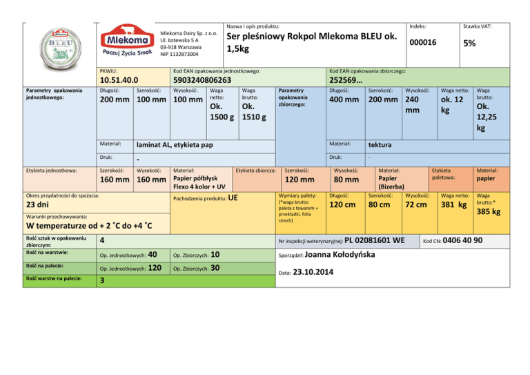 Mlekoma Dairy Sp. z o.o. Ul. Łotewska 5 A 03-918 Warszawa NIP 1132873004 Parametry opakowania jednostkowego: Etykieta jednostkowa: Ser pleśniowy Rokpol Mlekoma BLEU ok. 1,5kg 000016 5% Kod EAN opakowania zbiorczego: 10.51.40.0 5903240806263 252569… Długość: Wysokość: Szerokość: 200 mm 100 mm 100 mm Waga netto: Waga brutto: Ok. Ok. 1500 g 1510 g Parametry opakowania zbiorczego: Długość: Szerokość: 400 mm 200 mm 240 mm Materiał: laminat AL, etykieta pap Materiał: tektura Druk: - Druk: - Szerokość: Wysokość: Materiał: Etykieta zbiorcza: Papier półbłysk Flexo 4 kolor + UV Pochodzenia produktu: UE 23 dni Warunki przechowywania: W temperaturze od + 2 ˚C do +4 ˚C Ilość warstw na palecie: Stawka VAT: Kod EAN opakowania jednostkowego: Okres przydatności do spożycia: Ilość na palecie: Indeks: PKWiU: 160 mm 160 mm Ilość sztuk w opakowaniu zbiorczym: Ilość na warstwie: Nazwa i opis produktu: 4 120 mm Wysokość: Materiał: 80 mm Papier (Bizerba) 40 Op. Zbiorczych: 10 Op. Jednostkowych: 120 Op. Zbiorczych: 30 Waga netto: ok. 12 kg Etykieta paletowa: Długość: Szerokość: Wysokość: Waga netto: 120 cm 80 cm 72 cm 381 kg Sporządził: Joanna Data: Kołodyńska 23.10.2014 Kod CN: 0406 Ok. 12,25 kg papier (*waga brutto: paleta z towarem + przekładki, folia strech) 02081601 WE Waga brutto: Materiał: Wymiary palety: Nr inspekcji weterynaryjnej: PL Op. Jednostkowych: 3 Szerokość: Wysokość: Waga brutto:* 385 kg 40 90 Uwagi: