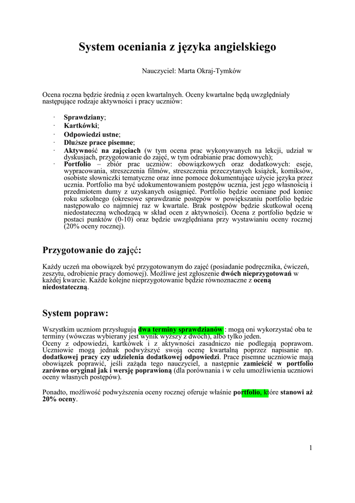 System oceniania z języka angielskiego Nauczyciel: Marta Okraj-Tymków Ocena roczna będzie średnią z ocen kwartalnych. Oceny kwartalne będą uwzględniały następujące rodzaje aktywności i pracy uczniów: · · · · · · Sprawdziany; Kartkówki; Odpowiedzi ustne; Dłuższe prace pisemne; Aktywność na zajęciach (w tym ocena prac wykonywanych na lekcji, udział w dyskusjach, przygotowanie do zajęć, w tym odrabianie prac domowych); Portfolio – zbiór prac uczniów: obowiązkowych oraz dodatkowych: eseje, wypracowania, streszczenia filmów, streszczenia przeczytanych książek, komiksów, osobiste słowniczki tematyczne oraz inne pomoce dokumentujące użycie języka przez ucznia. Portfolio ma być udokumentowaniem postępów ucznia, jest jego własnością i przedmiotem dumy z uzyskanych osiągnięć. Portfolio będzie oceniane pod koniec roku szkolnego (okresowe sprawdzanie postępów w powiększaniu portfolio będzie następowało co najmniej raz w kwartale. Brak postępów będzie skutkował oceną niedostateczną wchodzącą w skład ocen z aktywności). Ocena z portfolio będzie w postaci punktów (0-10) oraz będzie uwzględniana przy wystawianiu oceny rocznej (20% oceny rocznej). Przygotowanie do zajęć: Każdy uczeń ma obowiązek być przygotowanym do zajęć (posiadanie podręcznika, ćwiczeń, zeszytu, odrobienie pracy domowej). Możliwe jest zgłoszenie dwóch nieprzygotowań w każdej kwarcie. Każde kolejne nieprzygotowanie będzie równoznaczne z oceną niedostateczną. System popraw: Wszystkim uczniom przysługują dwa terminy sprawdzianów : mogą oni wykorzystać oba te terminy (wówczas wybierany jest wynik wyższy z dwóch), albo tylko jeden. Oceny z odpowiedzi, kartkówek i z aktywności zasadniczo nie podlegają poprawom. Uczniowie mogą jednak podwyższyć swoją ocenę kwartalną poprzez napisanie np. dodatkowej pracy czy udzielenia dodatkowej odpowiedzi. Prace pisemne uczniowie mają obowiązek poprawić, jeśli zażąda tego nauczyciel, a następnie zamieścić w portfolio zarówno oryginał jak i wersję poprawioną (dla porównania i w celu umożliwienia uczniowi oceny własnych postępów). Ponadto, możliwość podwyższenia oceny rocznej oferuje właśnie portfolio, które stanowi aż 20% oceny. 1 Procentowe przeliczenie ocen: 0-30 31-50 51-75 76-90 91-100 91-100 + dodatkowe osiągnięcia NDST DOP DST DB BDB CEL Obliczanie oceny kwartalnej: Ocena kwartalna będzie ustalana na podstawie ocen składowych w następujących stosunkach wagowych: Rodzaj pracy ucznia sprawdziany kartkówki odpowiedzi ustne Prace pisemne aktywność na zajęciach OGÓŁEM Sposób wyliczenia Średnia ocen x 8 Średnia ocen x 3 Średnia ocen x 3 Średnia ocen x 3 Średnia ocen x 3 Udział w ocenie końcowej 40 15 15 10 15 100% Przykład: Oceny ucznia: Sprawdziany: 3+,4 Kartkówki: 4,5,2,3,3 Odpowiedzi ustne: 4,3,1,4 Prace pisemne: 5,5 Aktywność: 5,4,4,5 Obliczenie oceny semestralnej: Rodzaj pracy ucznia sprawdziany Kartkówki odpowiedzi ustne Prace pisemne aktywność na zajęciach OGÓŁEM Ocena kwartalna: 3 (DST) (67,5%) Sposób wyliczenia 3,75 * 8 = 30 3,4*3=10,2 3*3=9 5*3=15 4,5*3=13,5 67,5 Udział w ocenie końcowej 40 15 15 15 15 100 Obliczanie oceny rocznej: Oceny kwartalne Kwarta 1 Kwarta 2 Kwarta 3 Kwarta 4 Portfolio OGÓŁEM Udział w ocenie końcowej 20 20 20 20 20 100% 2 Przykład: Oceny ucznia: Kwarta 1: 67,5 % (DST) Kwarta 2: 69 % (DST) Kwarta 3: 76% (DB) Kwarta 4: 77% (DB) Portfolio: 9/10 pkt. = 90 % Obliczenie oceny rocznej: Oceny semestralne Kwarta 1 Kwarta 2 Kwarta 3 Kwarta 4 Portfolio OGÓŁEM Ocena końcowa: DOBRY (75,9%) Udział w ocenie końcowej 67,5 x 0,2 = 13,5 69 x 0,2 = 13,8 76 x 0,2 = 15,2 77 x 0,2 = 15,4 90 x 0,2 = 18 75,9 Uzyskanie oceny celującej jest możliwe, jeśli uczeń uzyska ocenę bardzo dobrą oraz wykaże się: 1. znajomością języka wykraczającą poza poziom wymagany programowo 2. dodatkową pracą, np. poprzez dodatkowe prace pisemne, zwłaszcza w ramach port folio, dodatkowe ćwiczenia i inne ustalone z nauczycielem. 3 PDF to Word