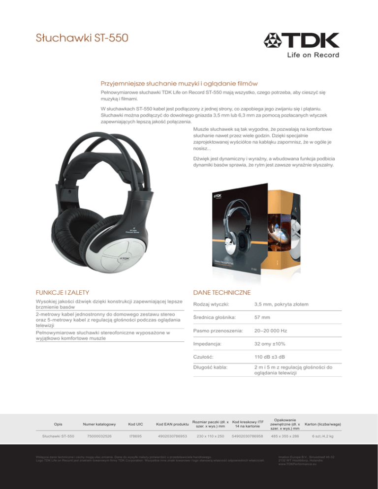 Słuchawki ST-550 Przyjemniejsze słuchanie muzyki i oglądanie filmów Pełnowymiarowe słuchawki TDK Life on Record ST-550 mają wszystko, czego potrzeba, aby cieszyć się muzyką i filmami. W słuchawkach ST-550 kabel jest podłączony z jednej strony, co zapobiega jego zwijaniu się i plątaniu. Słuchawki można podłączyć do dowolnego gniazda 3,5 mm lub 6,3 mm za pomocą pozłacanych wtyczek zapewniających lepszą jakość połączenia. Muszle słuchawek są tak wygodne, że pozwalają na komfortowe słuchanie nawet przez wiele godzin. Dzięki specjalnie zaprojektowanej wyściółce na kabłąku zapomnisz, że w ogóle je nosisz... Dźwięk jest dynamiczny i wyraźny, a wbudowana funkcja podbicia dynamiki basów sprawia, że rytm jest zawsze wyraźnie słyszalny. FUNKCJE I ZALETY DANE TECHNICZNE Wysokiej jakości dźwięk dzięki konstrukcji zapewniającej lepsze brzmienie basów Rodzaj wtyczki: 3,5 mm, pokryta złotem 2-metrowy kabel jednostronny do domowego zestawu stereo oraz 5-metrowy kabel z regulacją głośności podczas oglądania telewizji Średnica głośnika: 57 mm Pasmo przenoszenia: 20–20 000 Hz Impedancja: 32 omy ±10% Czułość: 110 dB ±3 dB Długość kabla: 2 m i 5 m z regulacją głośności do oglądania telewizji Pełnowymiarowe słuchawki stereofoniczne wyposażone w wyjątkowo komfortowe muszle Opis Numer katalogowy Kod UIC Kod EAN produktu Słuchawki ST-550 75000032526 t78695 4902030786953 Rozmiar paczki (dł. x Kod kreskowy ITF szer. x wys.) mm 14 na kartonie 230 x 110 x 250 54902030786958 Wstępne dane techniczne i cechy mogą ulec zmianie. Dane do wysyłki należy potwierdzić u przedstawiciela handlowego. Logo TDK Life on Record jest znakiem towarowym firmy TDK Corporation. Wszystkie inne znaki towarowe i logo stanowią własność odpowiednich właścicieli. Opakowanie zewnętrzne (dł. x szer. x wys.) mm Karton (liczba/waga) 485 x 355 x 286 6 szt./4,2 kg Imation Europe B.V., Siriusdreef 46-52 2132 WT Hoofddorp, Holandia www.TDKPerformance.eu