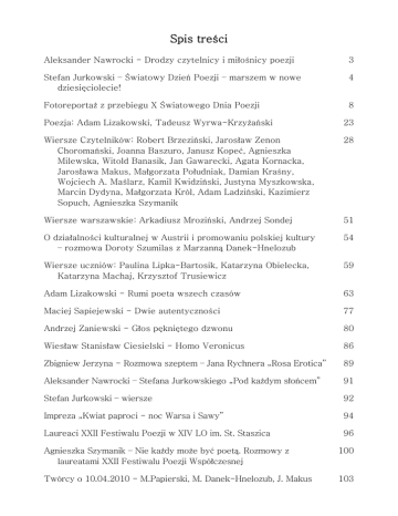 Spis treści Aleksander Nawrocki - Drodzy czytelnicy i miłośnicy poezji 3 Stefan Jurkowski – Światowy Dzień Poezji – marszem w nowe dziesięciolecie! 4 Fotoreportaż z przebiegu X Światowego Dnia Poezji 8 Poezja: Adam Lizakowski, Tadeusz Wyrwa-Krzyżański 23 Wiersze Czytelników: Robert Brzeziński, Jarosław Zenon Choromański, Joanna Baszuro, Janusz Kopeć, Agnieszka Milewska, Witold Banasik, Jan Gawarecki, Agata Kornacka, Jarosława Makus, Małgorzata Południak, Damian Kraśny, Wojciech A. Maślarz, Kamil Kwidziński, Justyna Myszkowska, Marcin Dydyna, Małgorzata Król, Adam Ladziński, Kazimierz Sopuch, Agnieszka Szymanik 28 Wiersze warszawskie: Arkadiusz Mroziński, Andrzej Sondej 51 O działalności kulturalnej w Austrii i promowaniu polskiej kultury – rozmowa Doroty Szumilas z Marzanną Danek-Hnelozub 54 Wiersze uczniów: Paulina Lipka-Bartosik, Katarzyna Obielecka, Katarzyna Machaj, Krzysztof Trusiewicz 59 Adam Lizakowski - Rumi poeta wszech czasów 63 Maciej Sapiejewski - Dwie autentyczności 77 Andrzej Zaniewski - Głos pękniętego dzwonu 80 Wiesław Stanisław Ciesielski - Homo Veronicus 86 Zbigniew Jerzyna - Rozmowa szeptem – Jana Rychnera „Rosa Erotica” 89 Aleksander Nawrocki – Stefana Jurkowskiego „Pod każdym słońcem” 91 Stefan Jurkowski – wiersze 92 Impreza „Kwiat paproci - noc Warsa i Sawy” 94 Laureaci XXII Festiwalu Poezji w XIV LO im. St. Staszica 96 Agnieszka Szymanik – Nie każdy może być poetą. Rozmowy z laureatami XXII Festiwalu Poezji Współczesnej 100 Twórcy o 10.04.2010 - M.Papierski, M. Danek-Hnelozub, J. Makus 103