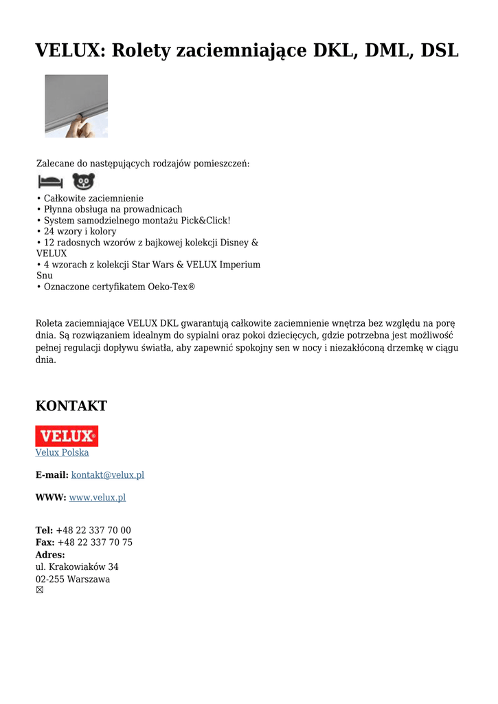 VELUX: Rolety zaciemniające DKL, DML, DSL Zalecane do następujących rodzajów pomieszczeń: • Całkowite zaciemnienie • Płynna obsługa na prowadnicach • System samodzielnego montażu Pick&Click! • 24 wzory i kolory • 12 radosnych wzorów z bajkowej kolekcji Disney & VELUX • 4 wzorach z kolekcji Star Wars & VELUX Imperium Snu • Oznaczone certyfikatem Oeko-Tex® Roleta zaciemniające VELUX DKL gwarantują całkowite zaciemnienie wnętrza bez względu na porę dnia. Są rozwiązaniem idealnym do sypialni oraz pokoi dziecięcych, gdzie potrzebna jest możliwość pełnej regulacji dopływu światła, aby zapewnić spokojny sen w nocy i niezakłóconą drzemkę w ciągu dnia. KONTAKT Velux Polska E-mail: [email protected] WWW: www.velux.pl Tel: +48 22 337 70 00 Fax: +48 22 337 70 75 Adres: ul. Krakowiaków 34 02-255 Warszawa