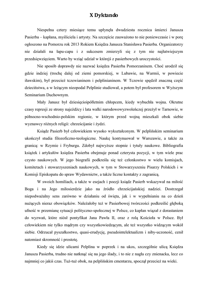 X Dyktando Niespełna cztery miesiące temu upłynęła dwudziesta rocznica śmierci Janusza Pasierba – kapłana, myśliciela i artysty. Na szczęście zauważono to nie poniewczasie i w porę ogłoszono na Pomorzu rok 2013 Rokiem Księdza Janusza Stanisława Pasierba. Organizatorzy nie działali na łapu-capu i z sukcesem zmierzyli się z tym nie najłatwiejszym przedsięwzięciem. Warto by wziąć udział w którejś z pasierbowych uroczystości. Nie sposób doprawdy nie nazwać księdza Pasierba Pomorzaninem. Choć urodził się gdzie indziej (trochę dalej od ziemi pomorskiej, w Lubawie, na Warmii, w powiecie iławskim), był przecież tczewianinem i pelplinianinem. W Tczewie spędził znaczną część dzieciństwa, a w leżącym nieopodal Pelplinie studiował, a potem był profesorem w Wyższym Seminarium Duchownym. Mały Janusz był dziesięcioipółletnim chłopcem, kiedy wybuchła wojna. Okrutne czasy represji ze strony najeźdźcy i lata walki narodowowyzwoleńczej przeżył w Tarnowie, w północno-wschodnio-polskim regionie, w którym przed wojną mieszkali obok siebie wyznawcy różnych religii: chrześcijanie i żydzi. Ksiądz Pasierb był człowiekiem wysoko wykształconym. W pelplińskim seminarium ukończył studia filozoficzno-teologiczne. Naukę kontynuował w Warszawie, a także za granicą: w Rzymie i Fryburgu. Zdobył najwyższe stopnie i tytuły naukowe. Bibliografia książek i artykułów księdza Pasierba obejmuje ponad czterysta pozycji, w tym wiele prac czysto naukowych. W jego biografii podkreśla się też członkostwo w wielu komisjach, komitetach i stowarzyszeniach naukowych, w tym w Stowarzyszeniu Pisarzy Polskich i w Komisji Episkopatu do spraw Wydawnictw, a także liczne kontakty z zagranicą. W swoich homiliach, a także w esejach i poezji ksiądz Pasierb wskazywał na miłość Boga i na Jego miłosierdzie jako na źródło chrześcijańskiej nadziei. Dostrzegał niepodważalny sens zarówno w działaniu od święta, jak i w wypełnianiu na co dzień nużących nieraz obowiązków. Należałoby też w Pasierbowej twórczości podkreślić głęboką ufność w przemianę sytuacji polityczno-społecznej w Polsce, co kapłan wiązał z dorastaniem do wyzwań, które niósł pontyfikat Jana Pawła II, oraz z rolą Kościoła w Polsce. Był człowiekiem nie tylko mądrym czy wszystkowiedzącym, ale też wszystko widzącym wokół siebie. Odrzucał pyszałkostwo, quasi-erudycję, pseudointelektualizm i niby-uczoność, cenił natomiast skromność i prostotę. Kiedy się idzie ulicami Pelplina w poprzek i na ukos, szczególnie ulicą Księdza Janusza Pasierba, trudno nie natknąć się na jego ślady, i to nie z nagła czy znienacka, lecz co najmniej co jakiś czas. Tuż-tuż obok, na pelplińskim cmentarzu, spoczął przecież na wieki.