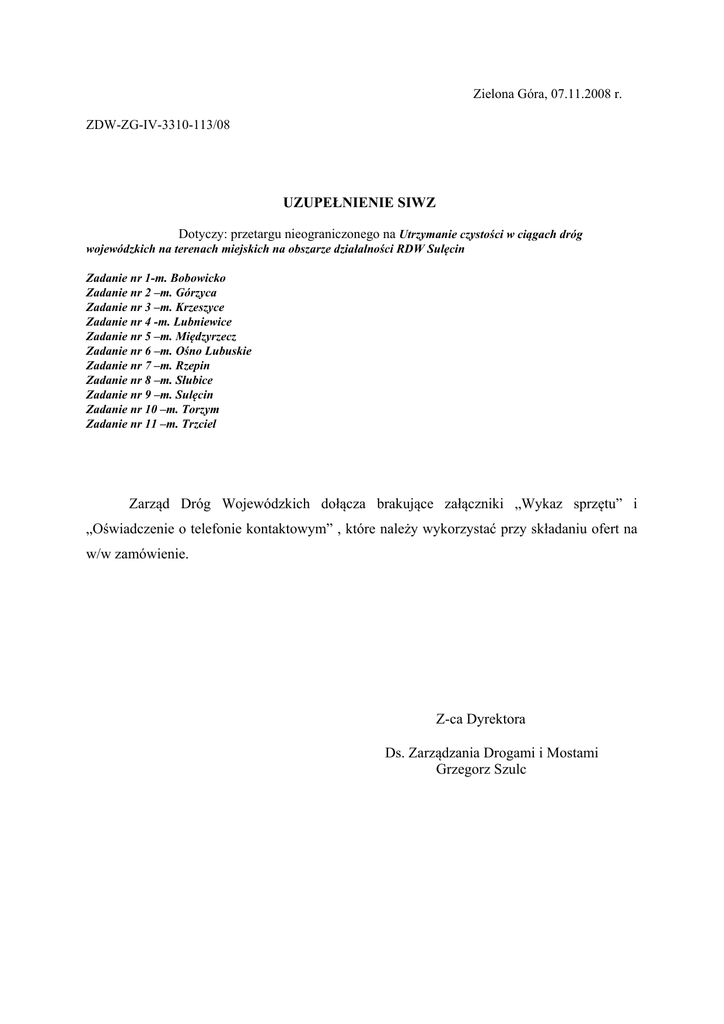 UZUPEŁNIENIE SIWZ Zarząd Dróg Wojewódzkich dołącza