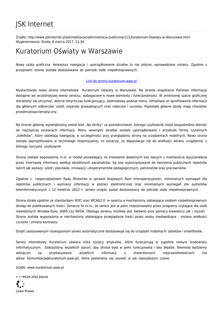 JSK Internet Źródło: http://www.jskinternet.pl/jsk/realizacje/administracja-publiczna/113,Kuratorium-Oswiaty-w-Warszawie.html Wygenerowano: Środa, 8 marca 2017, 11:34 Kuratorium Oświaty w Warszawie Nowa szata graficzna, łatwiejsza nawigacja i uporządkowanie działów to nie jedyne, wprowadzone zmiany. Zgodnie z przepisami strona została dostosowana do potrzeb osób niepełnosprawnych. Link do strony kuratorium.waw.pl Wystartowała nowa strona internetowa Kuratorium Oświaty w Warszawie. Na stronie znajdziecie Państwo informacje dostępne we wcześniejszej wersji serwisu, wzbogacone o nowe elementy i funkcjonalności. W zmienionej szacie graficznej staraliśmy się utrzymać, dobrze dotychczas funkcjonujący, podmiotowy podział menu. Umożliwia on sprofilowanie informacji dla głównych odbiorców: szkół, organów prowadzących oraz rodziców i uczniów. Pozostałe główne działy mają charakter przedmiotowo-tematyczny. Na stronie głównej wyodrębniony został blok „Na skróty” za pośrednictwem, którego użytkownik może bezpośrednio dotrzeć do najczęściej szukanych informacji. Menu wewnątrz działów zostało uporządkowane i przybrało formę czytelnych „kafelków”, które ułatwiają nawigację, w szczególności przy przeglądaniu strony na urządzeniach mobilnych. Nowa strona została zaprojektowana w technologii responsywnej, co oznacza, że dopasowuje się do wielkości ekranu urządzenia, z którego korzysta użytkownik. Strona została wyposażona m.in. w moduł pozwalający na kreowanie dowolnych baz danych z możliwością wyszukiwania przez internautę informacji według określonych parametrów. Są one wykorzystywane do tworzenia publicznych rejestrów takich jak wykazy: szkół i placówek, innowacji i eksperymentów pedagogicznych, patronatów oraz pracowników. Zgodnie z rozporządzeniem Rady Ministrów w sprawie Krajowych Ram Interoperacyjności, minimalnych wymagań dla rejestrów publicznych i wymiany informacji w postaci elektronicznej oraz minimalnych wymagań dla systemów teleinformatycznych z 12 kwietnia 2012 r. serwis urzędu został dostosowany do potrzeb osób niepełnosprawnych. Strona działa zgodnie ze standardami W3C oraz WCAG2.0 w oparciu o mechanizmy ułatwiające osobom niepełnosprawnym dostęp do publikowanych treści. Oznacza to m.in., że serwis jest w pełni rozpoznawalny przez programy czytające dla osób niewidomych Window-Eyes, JAWS czy NVDA. Obsługa serwisu możliwa jest zarówno przy pomocy klawiatury jak i myszki. Strona została wyposażona w mechanizmy ułatwiające przeglądanie treści przez osoby niedowidzące - zmiana wielkości czcionki i zmiana kontrastu. Dzięki zastosowanym rozwiązaniom serwis automatycznie dostosowuje się do urządzeń mobilnych: tabletów i smartfonów. Serwis internetowy Kuratorium zawiera kilka tysięcy artykułów, które funkcjonują w zupełnie nowym środowisku informatycznym. Dołożyliśmy wszelkich starań, aby strona była w pełni funkcjonalna i bez błędów. Niemniej będziemy wdzięczni za przekazywanie wszelkich informacji o stwierdzonych nieprawidłowościach adres: [email protected]), które postaramy się usuwać w jak najszybszym czasie. źródło: www.kuratorium.waw.pl « » resize play pauza Lewo Prawo (na ● ● ● ● ● ● ● ● ● ● Drukuj Generuj PDF Powiadom znajomego Wstecz Rozmiar czcionki: normalna większa duża