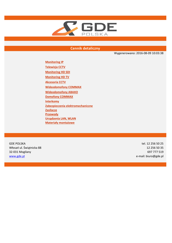Cennik detaliczny Wygenerowano: 2016-08-09 10:03:38 Monitoring IP Telewizja CCTV Monitoring HD SDI Monitoring HD TV Akcesoria CCTV Wideodomofony COMMAX Wideodomofony ABAXO Domofony COMMAX Interkomy Zabezpieczenia elektromechaniczne Zasilacze Przewody Urządzenia LAN, WLAN Materiały montażowe GDE POLSKA Włosań ul. Świątnicka 88 32-031 Mogilany www.gde.pl tel. 12 256 50 25 12 256 50 35 697 777 519 e-mail: [email protected] Marka Symbol Zdjęcie Nazwa Opis Cena detal netto Cena detal brutto Monitoring IP Monitoring IP-Rejestratory MAZi IMVR-04A Rejestrator IP 4 kanały 1HDD Rejestrator IMVR-04A 1HDD VGA HDMI 2Mpx 25/40 VGA HDMI 2Mpx 25/40 Mb/s Mb/s 4 kamery 499,00 zł 613,77 zł MAZi IMVR-04POE Rejestrator IP 4 kanały 4xPoE 1HDD VGA HDMI 2Mpx 25/40 Mb/s 789,00 zł 970,47 zł MAZi IMVR-04POE 1TB Rejestrator IP 4 kanały Rejestrator IMVR-04POE dysk 1TB 1HDD VGA HDMI 4xPoE dysk 1TB 1HDD VGA 2Mpx 25/40 Mb/s 4 kamery 4xPoE HDMI 2Mpx 25/40 Mb/s 999,00 zł 1 228,77 zł MAZi IMVR-06S Rejestrator IP 6 kanałów 1HDD VGA HDMI 2Mpx 40 Mb/s Rejestrator IMVR-06S 1HDD VGA HDMI 2Mpx 40 Mb/s 6 kamer 519,00 zł 638,37 zł MAZi IMVR-08A Rejestrator IP 8 kanałów 1HDD VGA HDMI 2Mpx 50/40 Mb/s Rejestrator IMVR-08A 1HDD VGA HDMI 2Mpx 50/40 Mb/s 8 kamer 569,00 zł 699,87 zł MAZi IMVR-08POE Rejestrator IP 8 kanałów 8xPoE 1HDD VGA HDMI 2Mpx 50/40 Mb/s Rejestrator IMVR-08POE 1HDD VGA HMI 2Mpx 50/40 Mb/s 8 kamer 8xPoE 919,00 zł 1 130,37 zł MAZi IMVR-09S Rejestrator IP 9 kanałów 1HDD VGA HDMI 2Mpx 40 Mb/s Rejestrator IMVR-09S 1HDD VGA HDMI 2Mpx 40 Mb/s 9 kamer 659,00 zł 810,57 zł MAZi INVR-04AL Rejestrator 1HDD VGA HDMI Rejestrator INVR-04AL 1HDD VGA, HDMI, 4 kamery 5Mpx 25/80 Mb/s 4 kamery maks. 5Mpx, maks strumień 25/80 Mb/s 589,00 zł 724,47 zł MAZi INVR-04ALPOE Rejestrator 1HDD VGA HDMI Rejestrator INVR-04ALPOE 1HDD VGA, HDMI, 4 5Mpx 25/80 Mb/s 4 kamery kamery maks. 5Mbs, maks strumień 25/50 Mb/s, 4xPoE switch 4 porty PoE 939,00 zł 1 154,97 zł MAZi INVR-08AL Rejestrator 1HDD VGA HDMI Rejestrator INVR-08AL 1HDD VGA, HDMI, 8 kamer 5Mpx 50/80 Mb/s 8 kamer maks. 5Mpx, maks strumień 50/80 Mb/s 659,00 zł 810,57 zł MAZi INVR-08AL2 Rejestrator 2HDD VGA HDMI Rejestrator INVR-08AL 2HDD VGA, HDMI, 8 kamer 5Mpx 50/80 Mb/s 8 kamer maks. 5Mpx, maks strumień 50/80 Mb/s 809,00 zł 995,07 zł MAZi INVR-08AL2POE Rejestrator 2HDD VGA HDMI Rejestrator INVR-08AL2POE 2HDD VGA, HDMI, 4 5Mpx 50/80 Mb/s 8 kamery kamery maks. 5Mpx, maks strumień 50/80 Mb/s, 8xPoE switch 8 portów PoE 1 399,00 zł 1 720,77 zł MAZi INVR-08S Rejestrator IP 8 kanałów Rejestrator IP 8 kanałów 2HDD VGA HDMI 5Mpx 150 2HDD VGA HDMI 5Mpx 150 Mb/s Mb/s 989,00 zł 1 216,47 zł Rejestrator IMVR-04POE 1HDD VGA, HDMI, 4 kamery maks. 2Mbs, maks strumień 25 Mb/s, switch 4 porty PoE Marka Symbol Zdjęcie Nazwa Opis MAZi INVR-16A Rejestrator IP 16 kanałów 4HDD eSATA BNC VGA HDMI 5Mpx 100/240 Mb/s Rejestrator INVR-16A 4HDD, eSATA BNC, VGA, HDMI, 16 kamer maks. 5Mpx, maks strumień 100/240 Mb/s MAZi INVR-16AL2 Rejestrator INVR-16AL2 2HDD VGA HDMI 5Mpx 100/80 Mb/s 16 kamer Rejestrator INVR-16AL2 2HDD, VGA, HDMI, 16 kamer maks. 5Mpx, maks strumień 100/80 Mb/s MAZi INVR-16AY Rejestrator hybrydowy 8we+8xIP 2HDD BNC VGA HDMI 5Mbs 40/240 Mb/s MAZi INVR-16POE Rejestrator IP 16 kanałów 4HDD eSATA BNC VGA HDMI 5Mpx 100/240 Mb/s 16xPoE MAZi INVR-16S MAZi MAZi Cena detal netto Cena detal brutto 1 999,00 zł 2 458,77 zł 929,00 zł 1 142,67 zł Rejestrator INVR-16AY 2HDD BNC VGA HDMI 5Mbs 40/240 Mb/s 8we+8xIP 1 399,00 zł 1 720,77 zł Towar na zamówienie, termin dostawy 3-5dni 2 999,00 zł 3 688,77 zł Rejestrator IP 16 kanałów Rejestrator IP 16 kanałów 2HDD VGA HDMI 5Mpx 2HDD VGA HDMI 5Mpx 150 150 Mb/s Mb/s 1 129,00 zł 1 388,67 zł INVR-24S Rejestrator IP 24 kanały Rejestrator 4HDD VGA, HDMI, 24 kamery maks. 4HDD VGA HDMI 5Mpx 200 5Mpx, maks strumień 200 Mb/s Mb/s 1 999,00 zł 2 458,77 zł INVR-32A Rejestrator IP 32 kanały 4HDD eSATA BNC VGA HDMI 5Mpx 200/160 Mb/s Rejestrator INVR-32A 4HDD eSATA BNC VGA HDMI 5Mpx 200/160 Mb/s 32 kamery 2 999,00 zł 3 688,77 zł MAZi INVR-32AY Rejestrator hybrydowy 16we+16xIP 2HDD BNC VGA HDMI 5Mbs 80/240 Mb/s Rejestrator INVR-32AY 2HDD BNC VGA HDMI 5Mbs 80/240 Mb/s 16we+16xIP 1 999,00 zł 2 458,77 zł ReviZOOM XNR-19602H Rejestrator IP 32 kanały 2HDD VGA HDMI 5MPx 196Mb/s Rejestrator XNR-19602H 2HDD VGA HDMI 5MPx 196Mb/s 32 kamery 899,00 zł 1 105,77 zł ReviZOOM XNR-19604H Rejestrator IP 32 kanały 4HDD eSATA VGA HDMI 5MPx 196Mb/s Rejestrator XNR-19604H 4HDD, eSATA VGA, HDMI, LAN, 5MPx, maks. 32 kamery, maks strumień 196Mb/s 1 559,00 zł 1 917,57 zł ReviZOOM XNR-2401M Rejestrator IP 16 kanałów 2HDD VGA HDMI 2Mpx 24Mb/s Rejestrator XNR-2401M 2HDD VGA, HDMI, 2 porty LAN, maks. 16 kamer, maks strumień 24Mb/s, obudowa mini 499,00 zł 613,77 zł ReviZOOM XNR-2401MPOE Rejestrator IP 4 kanały 4xPoE 2HDD VGA HDMI 2Mpx 18Mb/s Rejestrator XNR-2401MPOE 2HDD VGA HDMI 2Mpx 18Mb/s 4 kamery 4xPoE 799,00 zł 982,77 zł ReviZOOM XNR-3201G Rejestrator IP 8 kanałów Rejestrator XNR-3201G 1HDD VGA HDMI BNC 2Mpx 1HDD VGA HDMI BNC 2Mpx 32Mb/s 8 kamer 32Mb/s 299,00 zł 367,77 zł Marka Symbol Zdjęcie Nazwa Opis Cena detal netto Cena detal brutto ReviZOOM XNR-6401D-POE Rejestrator IP 16 kanałów 4xPoE 1HDD VGA HDMI BNC 2Mpx 64Mb/s Rejestrator XNR-6401D-POE 1HDD VGA HDMI BNC 2Mpx 64Mb/s 16 kamer 4 x PoE 589,00 zł 724,47 zł ReviZOOM XNR-6401F Rejestrator IP 16 kanałów 1HDD VGA HDMI 3MPx 64Mb/s Rejestrator XNR-6401F 1HDD VGA HDMI 3MPx 64Mb/s 16 kamer 599,00 zł 736,77 zł 699,00 zł 859,77 zł Monitoring IP-Kamery Monitoring IP-Kamery-Kamery kopułkowe CNB IDC4050VR obiektyw DC Iris f=3~10mm, F 1,2,2Mpx @ 30 kl/s, rozdzielczość 1100 VL, Dual Stream H.264 / MJPEG, Kamera kopułkowa IP 2Mpx dwukierunkowa komunikacja audio ADPCM), 3-10mm TDN PoE IR LED Ethernet 10/100 Base-T (PoE), 850nm / 45˚ IR LED 18EA MAZi IDH-11IR Kamera kopułkowa IP Kamera IP kopułkowa IDH-11IR wandaloodporna 1,3Mpx 2,8mm TDN PoE IR 1,3Mpx 2,8