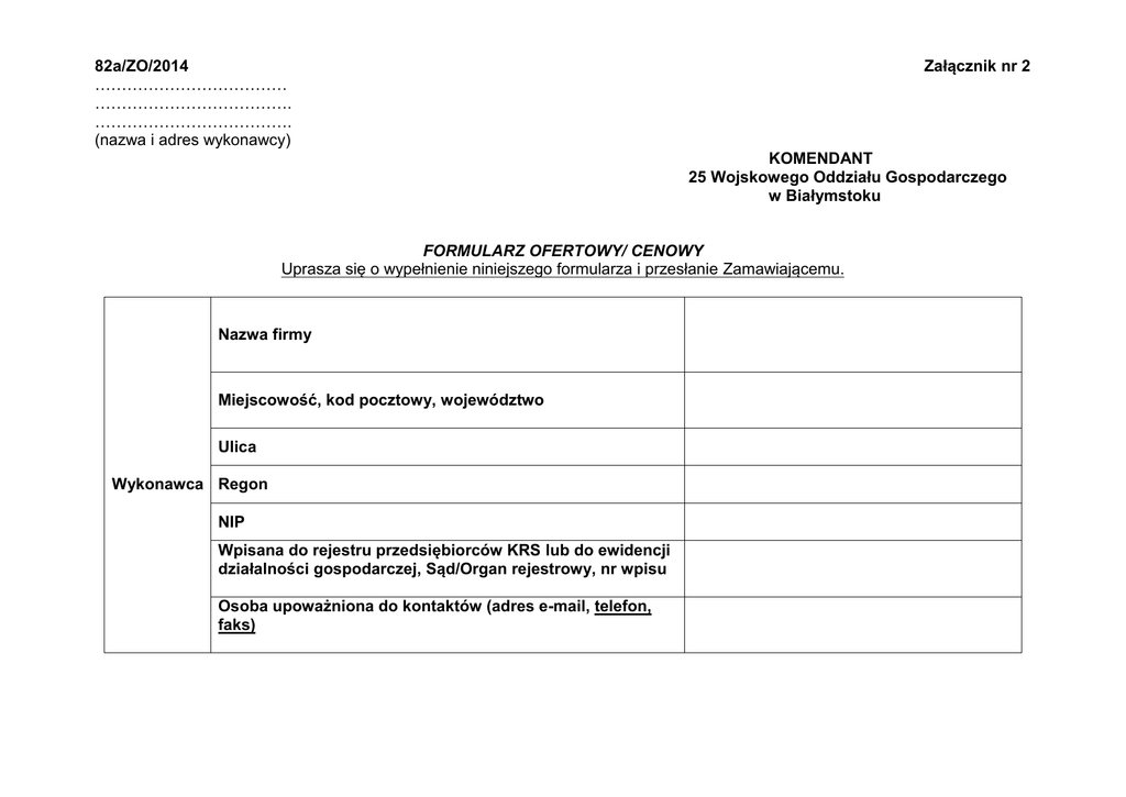 Załącznik nr 2 82a/ZO/2014 ……………………………… ………………………………. ………………………………. (nazwa i adres wykonawcy) KOMENDANT 25 Wojskowego Oddziału Gospodarczego w Białymstoku FORMULARZ OFERTOWY/ CENOWY Uprasza się o wypełnienie niniejszego formularza i przesłanie Zamawiającemu. Nazwa firmy Miejscowość, kod pocztowy, województwo Ulica Wykonawca Regon NIP Wpisana do rejestru przedsiębiorców KRS lub do ewidencji działalności gospodarczej, Sąd/Organ rejestrowy, nr wpisu Osoba upoważniona do kontaktów (adres e-mail, telefon, faks) Składając ofertę na dostawę materiałów informacyjnych i promocyjnych, oferujemy wykonanie zamówienia za łączną cenę ofertową: Netto : …………………………………………………….. zł VAT : ….....%…………................ zł Brutto : ……………………………………………….…… zł; słownie zł: …………………………………………………………………........... ustaloną na podstawie kalkulacji szczegółowej: L. p. Nazwa Przedmiotu Ilość 1 1 2 Długopis w kolorze ciemnozielonym z dużym, niebieskim wkładem, wyposażony w srebrny, metalowy klip oraz gumową nakładkę, ułatwiającą pisanie. Na korpusie po prawej stronie klipa nadrukowane logo Narodowych Sił Rezerwowych o wym. 15x5mm. (logo dostarczone przez zamawiającego) w kolorach białym i czerwonym oraz treść po lewej stronie klipa w kolorze białym o wym. ok. wys. 7mm, dł. 50mm : Wojewódzki Sztab 3 500 szt. Cena jednostkowa netto 4 Wartość netto 5 Stawka podatku VAT% 6 Kwota VAT Wartość brutto 7 8 Wojskowy w Białymstoku 2 3 Długopis w kolorze ciemnozielonym z dużym, niebieskim wkładem, wyposażony w srebrny, metalowy klip oraz gumową nakładkę, ułatwiającą pisanie. Na korpusie po prawej stronie klipa nadrukowane logo Narodowych Sił Rezerwowych o wym. 15x5mm (logo dostarczone przez zamawiającego) w kolorach białym i czerwonym oraz treść po lewej stronie klipa w kolorze białym o wym. ok. wys. 7mm, dł. 50mm: Wojskowa Komenda Uzupełnień w Białymstoku Długopis w kolorze ciemnozielonym z dużym, niebieskim wkładem, wyposażony w srebrny, metalowy klip oraz gumową nakładkę, ułatwiającą pisanie. Na korpusie po prawej stronie klipa nadrukowane logo Narodowych Sił Rezerwowych o wym. 15x5mm (logo dostarczone przez zamawiającego) w 500 szt. 500 szt. 4 5 kolorach białym i czerwonym oraz treść po lewej stronie klipa w kolorze białym o wym. ok. wys. 7mm, dł. 50mm: Wojskowa Komenda Uzupełnień w Bielsku Podlaskim Długopis w kolorze ciemnozielonym z dużym, niebieskim wkładem, wyposażony w srebrny, metalowy klip oraz gumową nakładkę, ułatwiającą pisanie. Na korpusie po prawej stronie klipa nadrukowane logo Narodowych Sił Rezerwowych o wym. 15x5mm (logo dostarczone przez zamawiającego) w kolorach białym i czerwonym oraz treść po lewej stronie klipa w kolorze białym o wym. ok. wys. 7mm, dł. 50mm: Wojskowa Komenda Uzupełnień w Łomży Długopis w kolorze ciemnozielonym z dużym, niebieskim wkładem, wyposażony w srebrny, metalowy klip oraz gumową nakładkę, ułatwiającą 500 szt. 500 szt. 6 7 pisanie. Na korpusie po prawej stronie klipa nadrukowane logo Narodowych Sił Rezerwowych o wym. 15x5mm (logo dostarczone przez zamawiającego) w kolorach białym i czerwonym oraz treść po lewej stronie klipa w kolorze białym o wym. ok. wys. 7mm, dł. 50mm: Wojskowa Komenda Uzupełnień w Suwałkach Smycz dwustronna w 1000 szt. kolorze khaki, szer. ok. 10mm, długość opaski około 90 cm, sublimacja, karabińczyk. Nadruk w odstępach ok. 2 cm. na całej długości: logo Narodowych Sił Rezerwowych (logo dostarczone przez zamawiającego) w kolorach białym i czerwonym o wymiarach ok.: szer. 20mm, wys. 8mm oraz treść w kolorze białym o wym. wys. 4mm, dł. 5 cm.: Wojewódzki Sztab Wojskowy w Białymstoku Smycz dwustronna w 1000 szt. kolorze khaki, szer. około 8 10mm, długość opaski około 90 cm, sublimacja, karabińczyk. Nadruk w odstępach ok. 2 cm. na całej długości: logo Narodowych Sił Rezerwowych (logo dostarczone przez zamawiającego) w kolorach białym i czerwonym o wymiarach: szer. 20mm, wys. 8mm oraz treść w kolorze białym o wym. wys. 4mm, dł. 5 cm.: Wojskowa Komenda Uzupełnień w Białymstoku Smycz dwustronna w kolorze khaki, szer. ok. 10mm, długość opaski około 90 cm, sublimacja, karabińczyk. Nadruk w odstępach ok. 2 cm. na całej długości: logo Narodowych Sił Rezerwowych (logo dostarczone przez zamawiającego) w kolorach białym i czerwonym o wymiarach: szer. 20mm, wys. 8mm oraz treść w kolorze białym o wym. wys. 4mm, dł. 5 cm.: Wojskowa Komenda Uzupełnień w Bielsku 1000 szt. Podlaskim 9 10 Smycz dwustronna w kolorze khaki, szer. ok. 10mm, długość opaski około 90 cm, sublimacja, karabińczyk. Nadruk w odstępach ok. 2 cm. na całej długości: logo Narodowych Sił Rezerwowych (logo dostarczone przez zamawiającego) w kolorach białym i czerwonym o wymiarach: szer. 20mm, wys. 8mm oraz treść w kolorze białym o wym. wys. 4 mm, dł. 5 cm.: Wojskowa Komenda Uzupełnień w Łomży Smycz dwustronna w kolorze khaki, szer. ok. 10mm, długość opaski około 90 cm, sublimacja, karabińczyk. Nadruk w odstępach ok. 2 cm. na całej długości: logo Narodowych Sił Rezerwowych (logo dostarczone przez zamawiającego) w kolorach białym i czerwonym o wymiarach: szer. 20mm, wys. 8mm oraz treść w kolorze białym o wym. wys. 1000 szt. 1000 szt. 11 12 4mm, dł. 5 cm.: Wojskowa Komenda Uzupełnień w Suwałkach Kubek z porcelany (300ml) o śred. Ok. 80mm, wysokość ok. 94 mm z uchem szerokości ok. 16 mm. w kolorze ciemnozielonym z umieszczonym po lewej stronie ucha logo Narodowych Sił Rezerwowych (logo dostarczone przez zamawiającego) w kolorach białym i czerwonym o wym. szer. 38mm, wys. 14 mm. Nadruki na kubku wykonane kalkomanią ceramiczną w pełnym kolorze. T-Shirt męski z M krótkim ręk