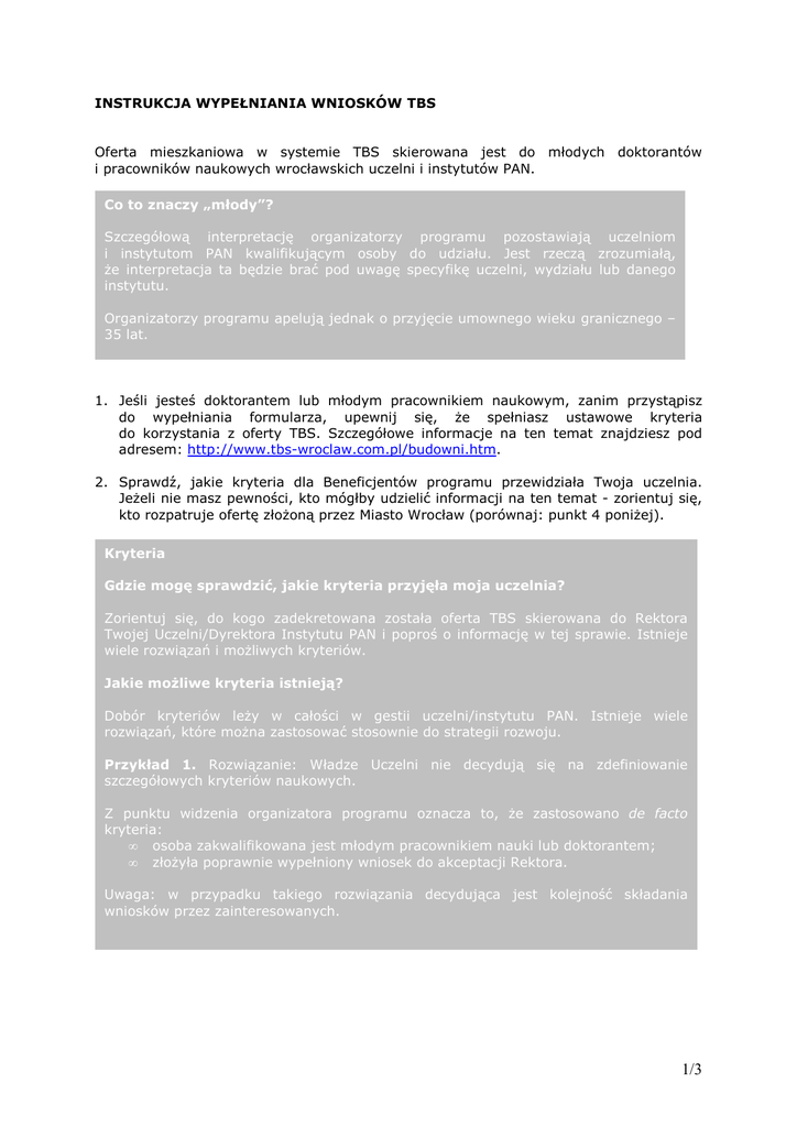 INSTRUKCJA WYPEŁNIANIA WNIOSKÓW TBS Oferta mieszkaniowa w systemie TBS skierowana jest do młodych doktorantów i pracowników naukowych wrocławskich uczelni i instytutów PAN. Co to znaczy „młody”? Szczegółową interpretację organizatorzy programu pozostawiają uczelniom i instytutom PAN kwalifikującym osoby do udziału. Jest rzeczą zrozumiałą, Ŝe interpretacja ta będzie brać pod uwagę specyfikę uczelni, wydziału lub danego instytutu. Organizatorzy programu apelują jednak o przyjęcie umownego wieku granicznego – 35 lat. 1. Jeśli jesteś doktorantem lub młodym pracownikiem naukowym, zanim przystąpisz do wypełniania formularza, upewnij się, Ŝe spełniasz ustawowe kryteria do korzystania z oferty TBS. Szczegółowe informacje na ten temat znajdziesz pod adresem: http://www.tbs-wroclaw.com.pl/budowni.htm. 2. Sprawdź, jakie kryteria dla Beneficjentów programu przewidziała Twoja uczelnia. JeŜeli nie masz pewności, kto mógłby udzielić informacji na ten temat - zorientuj się, kto rozpatruje ofertę złoŜoną przez Miasto Wrocław (porównaj: punkt 4 poniŜej). Kryteria Gdzie mogę sprawdzić, jakie kryteria przyjęła moja uczelnia? Zorientuj się, do kogo zadekretowana została oferta TBS skierowana do Rektora Twojej Uczelni/Dyrektora Instytutu PAN i poproś o informację w tej sprawie. Istnieje wiele rozwiązań i moŜliwych kryteriów. Jakie moŜliwe kryteria istnieją? Dobór kryteriów leŜy w całości w gestii uczelni/instytutu PAN. Istnieje wiele rozwiązań, które moŜna zastosować stosownie do strategii rozwoju. Przykład 1. Rozwiązanie: Władze Uczelni nie decydują się na zdefiniowanie szczegółowych kryteriów naukowych. Z punktu widzenia organizatora programu oznacza to, Ŝe zastosowano de facto kryteria: • osoba zakwalifikowana jest młodym pracownikiem nauki lub doktorantem; • złoŜyła poprawnie wypełniony wniosek do akceptacji Rektora. Uwaga: w przypadku takiego rozwiązania decydująca jest kolejność składania wniosków przez zainteresowanych. 1/3 Kryteria c.d. Przykład 2. Rozwiązanie: Władze Uczelni akceptują kandydatury młodych pracowników nauki i doktorantów pod warunkiem, Ŝe istnieją duŜe szanse na ich zatrudnienie w macierzystym zakładzie lub w innym miejscu na uczelni (potwierdzone przez kierownictwo zakładu). Z punktu widzenia organizatora programu zastosowano de facto kryteria: • osoba zakwalifikowana jest młodym pracownikiem nauki lub doktorantem; • uczelnia chce kontynuować z nią współpracę w przyszłości (porównaj: chce, choć nie wiadomo czy będzie to moŜliwe); • złoŜyła poprawnie wypełniony wniosek do akceptacji Rektora. Uwaga: w przypadku tego rozwiązania uczelnia korzysta wprost z programu w celu prowadzenia polityki kadrowej. Przykład 3. Rozwiązanie: Władze Uczelni akceptują kandydatury młodych pracowników nauki i doktorantów, którzy otrzymali specjalne nagrody naukowe. Z punktu widzenia organizatora programu zastosowano de facto kryteria: • osoba zakwalifikowana jest młodym pracownikiem nauki lub doktorantem; • wyróŜnia się tym, Ŝe jej dorobek naukowy został uznany np. poprzez przyznanie nagrody ministerialnej; • złoŜyła poprawnie wypełniony wniosek do akceptacji Rektora. 3. Upewnij się, Ŝe spełniasz kryteria przyjęte przez Twoją Uczelnię/Twój Instytut. 4. Szczegółowa oferta Miasta Wrocław przekazana została Rektorom uczelni/Dyrektorom instytutów. Dowiedz się, do kogo skierowane zostało pismo z ofertą (fakt taki jest zwykle odnotowywany przez kancelarię). Być moŜe sprawami kwalifikacji do udziału w programie za decyzją Rektora zajmuje się jedna osoba – w takim przypadku właśnie do niej warto zgłosić się z wypełnionym wnioskiem. 5. Samodzielnie moŜesz wypełnić część A i B wniosku. Pamiętaj, Ŝe w części B naleŜy podać adres stałego zameldowania. 6. W części C wniosku wymagane jest uzasadnienie wyboru osoby zakwalifikowanej z uwzględnieniem kryteriów wskazanych w ofercie TBS. Poproś o przygotowanie takiego uzasadnienia swojego opiekuna naukowego. 7. Uwaga: w części C wskazane jest odniesienie się do strategii rozwoju miasta „Wrocław w perspektywie 2020 plus” („W jakim sensie zakwalifikowany Beneficjent programu wnosi w rozwój społeczności lokalnej Wrocławia szczególną wartość dodaną?”). Dokument dostępny jest pod adresem: http://uchwaly.um.wroc.pl/uchwala.aspx?numer=LIV/3250/06 Uwaga: w części tej prosimy o odniesienie się do strategii rozwoju Wrocławia (a nie na przykład Województwa Dolnośląskiego). 2/3 Oto przykład uzasadnienia dla wyboru Beneficjenta: Pan XYZ podczas studiów wykazywał się wielkim zaangaŜowaniem w pracę naukową i badawczą, biorąc udział w pracach studenckiego koła naukowego. Był stypendystą ......... oraz laureatem nagrody............. Obecnie zatrudniony jest na stanowisku .......... i bierze udział w pracach zespołu projektowego przy Urzędzie Marszałkowskim we Wrocławiu. WyraŜam opinię, Ŝe pan XYZ jest osobą wnoszącą znaczący wkład w rozwój społeczności lokalnej Wrocławia. Jego praca ma szczególną wartość dla Ŝycia mieszkańców naszego miasta ze względu na nieprzeciętne umiejętności popularyzacji nauk przyrodniczych. Pan XYZ jest niezwykle uzdolnionym i obiecującym młodym pracownikiem nauki, dlatego jego zatrudnienie na ..................... stanowi znaczącą wartość dla miasta zgodnie z uchwałą Rady Miejskiej z dn. 6 lipca 2006 r. »Wrocław w perspektywie 2020 plus«. W świetle tej uchwały do priorytetów naleŜy zatrzymanie »exodusu młodych i aktywnych wrocławian poza granice miasta poprzez stworzenie im odpowiednich warunków mieszkaniowych na miarę ich moŜliwości finansowych«. 8. Wypełniając część C pamiętaj, Ŝe szczególnie waŜne dla rozwoju Wrocławia jest tworzenie miejsc pracy dla wysoko wykwalifikowanych pracowników. JeŜeli praca naukowa Beneficjenta ma potencjał komercjalizacyjny