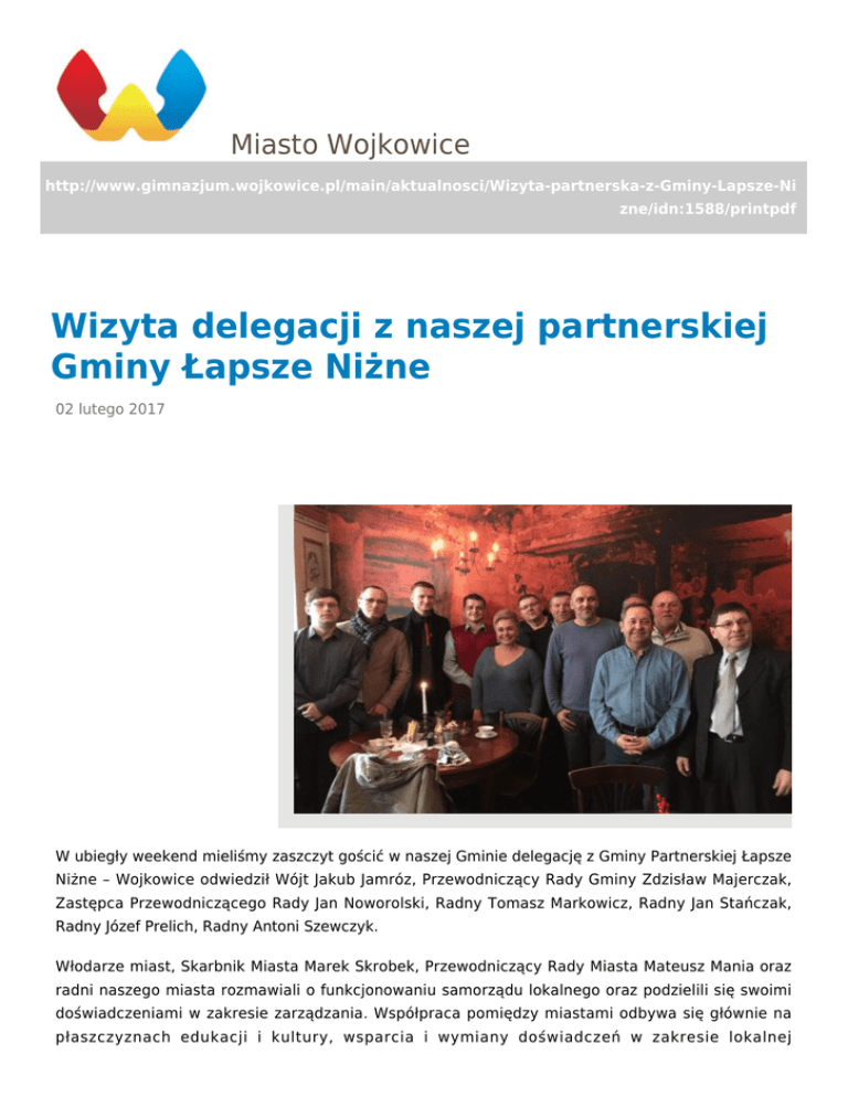Miasto Wojkowice http://www.gimnazjum.wojkowice.pl/main/aktualnosci/Wizyta-partnerska-z-Gminy-Lapsze-Ni zne/idn:1588/printpdf Wizyta delegacji z naszej partnerskiej Gminy Łapsze Niżne 02 lutego 2017 kategoria: Wojkowice W ubiegły weekend mieliśmy zaszczyt gościć w naszej Gminie delegację z Gminy Partnerskiej Łapsze Niżne – Wojkowice odwiedził Wójt Jakub Jamróz, Przewodniczący Rady Gminy Zdzisław Majerczak, Zastępca Przewodniczącego Rady Jan Noworolski, Radny Tomasz Markowicz, Radny Jan Stańczak, Radny Józef Prelich, Radny Antoni Szewczyk. Włodarze miast, Skarbnik Miasta Marek Skrobek, Przewodniczący Rady Miasta Mateusz Mania oraz radni naszego miasta rozmawiali o funkcjonowaniu samorządu lokalnego oraz podzielili się swoimi doświadczeniami w zakresie zarządzania. Współpraca pomiędzy miastami odbywa się głównie na płaszczyznach edukacji i kultury, wsparcia i wymiany doświadczeń w zakresie lokalnej przedsiębiorczości oraz ochrony środowiska. Omówione zostały również zasady wymiany senioralnej i młodzieżowej, które zostaną wkrótce wdrożone. Delegacja odwiedziła kilka kluczowych spółek, działających na terenie miasta: najnowocześniejszy zakład obróbki kamienia w Unii Europejskiej ZOK WKG, drugiego największego eksportera profili okiennych w Unii Europejskich – firmę Profil, a także spółki prowadzące obecnie działalność na terenie dawnej KWK Jowisz – firmę U&R Calor oraz firmę POL-Carbon. Przedstawiona została również działalność Zakładu Gospodarki Komunalnej oraz spółki Recykling. Delegacja miała także okazję zobaczyć trochę historii, dzielnicę Katowic – Nikiszowiec – znane jako magiczne miejsce oraz Cafe Jerozolima w Będzinie, wysłuchując ciekawej prelekcji Adama Szydłowskiego. Niewątpliwą atrakcją było także odwiedzenie największego w Unii Europejskiej escape roomu – Bunkier Wojkowice. Delegacja z Łapsze Niżne 1 luty 2017 Delegacja z Łapsze Niżne Delegacja z Łapsze Niżne Delegacja z Łapsze Niżne Delegacja z Łapsze Niżne Delegacja z Łapsze Niżne Delegacja z Łapsze Niżne Delegacja z Łapsze Niżne Delegacja z Łapsze Niżne Delegacja z Łapsze Niżne Delegacja z Łapsze Niżne Delegacja z Łapsze Niżne Delegacja z Łapsze Niżne Delegacja z Łapsze Niżne Delegacja z Łapsze Niżne Delegacja z Łapsze Niżne Delegacja z Łapsze Niżne Delegacja z Łapsze Niżne Delegacja z Łapsze Niżne Delegacja z Łapsze Niżne Delegacja z Łapsze Niżne Delegacja z Łapsze Niżne Delegacja z Łapsze Niżne Delegacja z Łapsze Niżne Delegacja z Łapsze Niżne Delegacja z Łapsze Niżne Delegacja z Łapsze Niżne Delegacja z Łapsze Niżne Delegacja z Łapsze Niżne Delegacja z Łapsze Niżne Delegacja z Łapsze Niżne Delegacja z Łapsze Niżne Delegacja z Łapsze Niżne Delegacja z Łapsze Niżne Delegacja z Łapsze Niżne Delegacja z Łapsze Niżne Delegacja z Łapsze Niżne Delegacja z Łapsze Niżne Delegacja z Łapsze Niżne Delegacja z Łapsze Niżne Delegacja z Łapsze Niżne Delegacja z Łapsze Niżne Delegacja z Łapsze Niżne Delegacja z Łapsze Niżne Delegacja z Łapsze Niżne