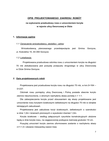 OPIS PROJEKTOWANEGO ZAKRESU ROBÓT na wykonanie przebudowy rowu z umocnieniem koryta w rejonie ulicy Dworcowej w Olzie 1. Informacje ogólne 1.1 Oznaczenie wnioskodawcy, siedziba i adres: Wnioskodawcą planowanego przedsięwzięcia jest Gmina Gorzyce, ul. Kościelna 15, 44-350 Gorzyce. 1.2 Lokalizacja: Projektowana przebudowa odcinka rowu z umocnieniem koryta na długości 70 mb zlokalizowana jest powyżej przepustu drogowego w ulicy Dworcowej w Olzie Gmina Gorzyce. 2. Opis projektowanych robót Projektowana jest przebudowa koryta rowu na długości 70 mb, w km.0+164 – 0+237. Odcinek rowu pomiędzy ulicą Dworcową i Polną posiada obecnie koryto ziemne nieumocnione, o stromym nachyleniu skarp poniżej n = 1:1. Dla zabezpieczenia koryta przed obsuwaniem się skarp projektowane jest umocnienie rowu korytami ściekowymi żelbetowymi na długości 70 mb w obrębie istniejących zabudowań. Projektowana jest zabudowa koryt ściekowych, żelbetowych o szerokości w dnie 1,0m i ścianach pionowych o wysokości również 1,0m. Koryta ściekowe – według załączonych rysunków konstrukcyjnych ułożone będą w dnie koryta rowu, na zagęszczonej podsypce żwirowej grubości 10 cm. Powyżej umocnień koryto ziemne uformowane zostanie o nachyleniu skarp n=1:1,5 i obsiane mieszanką nasion traw. 2 Odcinek koryta rowu powyżej przepustu drogowego w ciągu ulicy Dworcowej przy wlocie rowów przydrożnych, na długości 4,0m wykonany będzie o kształcie trapezowym, z umocnieniem dna i skarp ażurowymi, betonowymi płytami melioracyjnymi o wymiarach: 0,9*0,6*0,1m na podsypce żwirowej grubości 10 cm. Przebudowa z umocnieniem rowu wykonana będzie w całości w obrębie istniejącego koryta z zachowaniem istniejących głębokości i spadków, co nie będzie negatywnie oddziaływać na przyległe grunty ani na stan koryta rowu poniżej projektowanej przebudowy. Przedmiotowy rów w dolnym odcinku - od wlotu do rowu kolejowego do przepustu drogowego w ul.Dworcowej został uregulowany w roku 2010 z umocnieniem dna i skarp płytami betonowymi. Przepust w ulicy Dworcowej został również przebudowany na przepust ramowy o wymiarach 1,0*1,0m. Projektowana przebudowa odcinka rowu poniżej ulicy Dworcowej dostosowana została do wymiarów istniejącego przepustu ramowego w ciągu ulicy Dworcowej. 3. Stan prawny nieruchomości Projektowana przebudowa odcinka rowu z umocnieniem koryta wykonana będzie w całości na działce nr 221 obręb Olza k.m. 1 stanowiącej własność Gminy Gorzyce. 4. Obliczenia hydrologiczne i hydrauliczne: Według dokonanych obliczeń hydrologicznych i hydraulicznych dołączonych do operatu wodnoprawnego, wielkość wód o prawdopodobieństwie występowania raz na sto lat, na które regulowane są cieki wodne w obrębie zabudowań Q1% wynosi 1,0942 m3/s, natomiast przepustowość projektowanego koryta żelbetowego o wymiarach 1,0*1,0m i spadku I=6,85 ‰ wynosi Qobl= 3,27 m3/s. 3 Z powyższych obliczeń wynika, że całość wód Q1% pomieści się w projektowanym korycie żelbetowym. Szczegóły usytuowania i posadowienia koryt żelbetowych w istniejącym korycie rowu wykazane zostały w części graficznej. 5. Wpływ planowanej inwestycji na środowisko naturalne Planowane przedsięwzięcie nie będzie wywierało negatywnego wpływu na środowisko naturalne. Dla terenu, na którym projektowana jest przebudowa odcinka rowu wraz z umocnieniem koryta nie ustanowiono żadnych form ochrony przyrody, w rozumieniu art. 6 ustawy z dnia 16 kwietnia 2004 o ochronie przyrody ( Dz. U. z 2013 poz.627 ). 6. Istniejące uzbrojenie terenu Przez teren, na którym projektowana jest przebudowa odcinka rowu wraz z umocnieniem przebiega wodociąg ø 100mm, który usytuowany jest w korycie rowu na wysokości 0,52m powyżej istniejącego dna rowu. W miejscu istniejącego wodociągu, koryto rowu posiadać będzie kształt trapezowy z umocnieniem dna i skarp betonowymi płytami ażurowymi. Uzgodnienie projektu z Przedsiębiorstwem Wodociągów i Kanalizacji w Wodzisławiu Śląskim dołącza się do niniejszego projektu. Inne podziemne uzbrojenia terenu nie przebiegają przez teren projektowanej przebudowy koryta rowu. 7. Wytyczne realizacyjne W czasie realizacji robót należy stosować: • przepisy zawarte w Rozporządzeniu MBiPMB z dnia 28.03.1992r. (Dz.U. Nr 13) w sprawie warunków BHP przy wykonywaniu robót budowlano-montażowych, 4 • tylko te materiały, które na podstawie obowiązujących przepisów zostały dopuszczone do stosowania w budownictwie. 8. Informacje dla Wykonawcy robót Dla informacji podaje się, że koryta betonowe zbrojone o wym.1,0*1,0m do umocnienia rowu produkuje na indywidualne zamówienia m.in. „FABET” Żory Sp. z o.o., ul.Boczna 6. 5