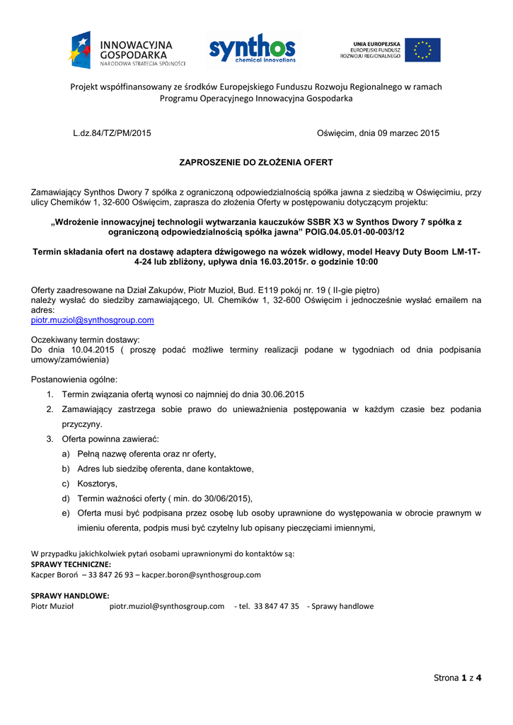 Projekt współfinansowany ze środków Europejskiego Funduszu Rozwoju Regionalnego w ramach Programu Operacyjnego Innowacyjna Gospodarka Oświęcim, dnia 09 marzec 2015 L.dz.84/TZ/PM/2015 ZAPROSZENIE DO ZŁOŻENIA OFERT Zamawiający Synthos Dwory 7 spółka z ograniczoną odpowiedzialnością spółka jawna z siedzibą w Oświęcimiu, przy ulicy Chemików 1, 32-600 Oświęcim, zaprasza do złożenia Oferty w postępowaniu dotyczącym projektu: „Wdrożenie innowacyjnej technologii wytwarzania kauczuków SSBR X3 w Synthos Dwory 7 spółka z ograniczoną odpowiedzialnością spółka jawna” POIG.04.05.01-00-003/12 Termin składania ofert na dostawę adaptera dźwigowego na wózek widłowy, model Heavy Duty Boom LM-1T4-24 lub zbliżony, upływa dnia 16.03.2015r. o godzinie 10:00 Oferty zaadresowane na Dział Zakupów, Piotr Muzioł, Bud. E119 pokój nr. 19 ( II-gie piętro) należy wysłać do siedziby zamawiającego, Ul. Chemików 1, 32-600 Oświęcim i jednocześnie wysłać emailem na adres: [email protected] Oczekiwany termin dostawy: Do dnia 10.04.2015 ( proszę podać możliwe terminy realizacji podane w tygodniach od dnia podpisania umowy/zamówienia) Postanowienia ogólne: 1. Termin związania ofertą wynosi co najmniej do dnia 30.06.2015 2. Zamawiający zastrzega sobie prawo do unieważnienia postępowania w każdym czasie bez podania przyczyny. 3. Oferta powinna zawierać: a) Pełną nazwę oferenta oraz nr oferty, b) Adres lub siedzibę oferenta, dane kontaktowe, c) Kosztorys, d) Termin ważności oferty ( min. do 30/06/2015), e) Oferta musi być podpisana przez osobę lub osoby uprawnione do występowania w obrocie prawnym w imieniu oferenta, podpis musi być czytelny lub opisany pieczęciami imiennymi, W przypadku jakichkolwiek pytań osobami uprawnionymi do kontaktów są: SPRAWY TECHNICZNE: Kacper Boroń – 33 847 26 93 – [email protected] SPRAWY HANDLOWE: Piotr Muzioł [email protected] - tel. 33 847 47 35 - Sprawy handlowe Strona 1 z 4 Projekt współfinansowany ze środków Europejskiego Funduszu Rozwoju Regionalnego w ramach Programu Operacyjnego Innowacyjna Gospodarka Kryteria Oceny Ofert: 80% Cena 20% Termin Realizacji Załączniki: 1. Specyfikacja techniczna 2. Warunki handlowe. Strona 2 z 4 Projekt współfinansowany ze środków Europejskiego Funduszu Rozwoju Regionalnego w ramach Programu Operacyjnego Innowacyjna Gospodarka Załącznik nr 1. Specyfikacja techniczna Urządzenie musi posiadać certyfikaty zgodności z polskimi normami, które ich dotyczą. Udźwig: 2 tony. Strona 3 z 4 Projekt współfinansowany ze środków Europejskiego Funduszu Rozwoju Regionalnego w ramach Programu Operacyjnego Innowacyjna Gospodarka Załącznik nr 2. Warunki handlowe. LP 1 Warunki handlowe SYNTHOS Dwory 7 3. Numer oferty (Wypełnić) Oferta ważna do dnia (Wypełnić) Cena 4. Waluta 5. 30 dni / rozliczenie po podpisaniu protokołu odbioru prac 7. Termin płatności faktur (liczony od dnia jej dostarczenia) Termin realizacji projektu ( proszę podać czas realizacji w tygodniach, liczonych od daty potwierdzenia zlecenia) Gwarancja (Wypełnić) 8. Kary umowne 10. Warunki dostawy 1,5% wartości kontraktu za każdy tydzień opóźnienia. Kara do wysokości 15% wartości kontraktu DAP Synthos Oświęcim 2. 6. Uwagi/zmiany wprowadzone przez Wykonawcę 30.06.2015 PLN Strona 4 z 4
