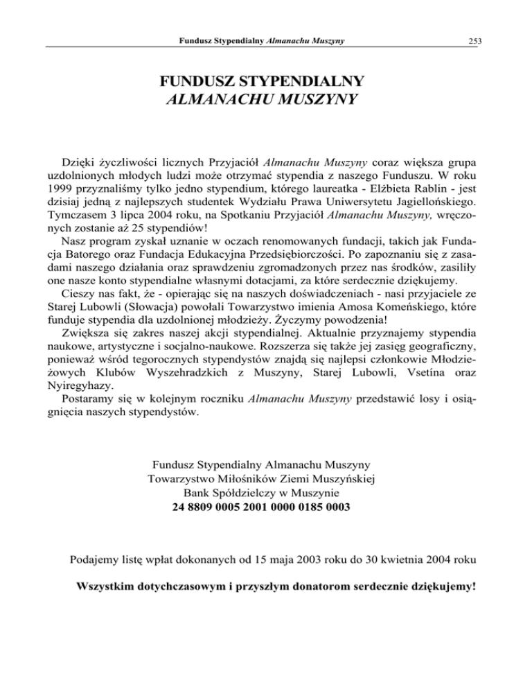 Fundusz Stypendialny Almanachu Muszyny 253 FUNDUSZ STYPENDIALNY ALMANACHU MUSZYNY Dzięki życzliwości licznych Przyjaciół Almanachu Muszyny coraz większa grupa uzdolnionych młodych ludzi może otrzymać stypendia z naszego Funduszu. W roku 1999 przyznaliśmy tylko jedno stypendium, którego laureatka - Elżbieta Rablin - jest dzisiaj jedną z najlepszych studentek Wydziału Prawa Uniwersytetu Jagiellońskiego. Tymczasem 3 lipca 2004 roku, na Spotkaniu Przyjaciół Almanachu Muszyny, wręczonych zostanie aż 25 stypendiów! Nasz program zyskał uznanie w oczach renomowanych fundacji, takich jak Fundacja Batorego oraz Fundacja Edukacyjna Przedsiębiorczości. Po zapoznaniu się z zasadami naszego działania oraz sprawdzeniu zgromadzonych przez nas środków, zasiliły one nasze konto stypendialne własnymi dotacjami, za które serdecznie dziękujemy. Cieszy nas fakt, że - opierając się na naszych doświadczeniach - nasi przyjaciele ze Starej Lubowli (Słowacja) powołali Towarzystwo imienia Amosa Komeńskiego, które funduje stypendia dla uzdolnionej młodzieży. Życzymy powodzenia! Zwiększa się zakres naszej akcji stypendialnej. Aktualnie przyznajemy stypendia naukowe, artystyczne i socjalno-naukowe. Rozszerza się także jej zasięg geograficzny, ponieważ wśród tegorocznych stypendystów znajdą się najlepsi członkowie Młodzieżowych Klubów Wyszehradzkich z Muszyny, Starej Lubowli, Vsetína oraz Nyiregyhazy. Postaramy się w kolejnym roczniku Almanachu Muszyny przedstawić losy i osiągnięcia naszych stypendystów. Fundusz Stypendialny Almanachu Muszyny Towarzystwo Miłośników Ziemi Muszyńskiej Bank Spółdzielczy w Muszynie 24 8809 0005 2001 0000 0185 0003 Podajemy listę wpłat dokonanych od 15 maja 2003 roku do 30 kwietnia 2004 roku Wszystkim dotychczasowym i przyszłym donatorom serdecznie dziękujemy! 254 Fundusz Stypendialny Almanachu Muszyny IMIĘ I NAZWISKO Waldemar Serwiński Stanisław Krysiński Maria Krysińska Henryka i Andrzej Moszczakowie Janet i Wiktor Borzemscy Barbara Nagięć Waldemar Serwiński Adelajda i Józef Bujarscy Barbara i Tadeusz Kuca Janina Piachy Krystyna i Tomasz Szubrytowie Krystyna i Marian Majewscy Stanisław Szumski Bogdan Dziedzina Danuta Kisielewska Teresa i Andrzej Tokarczykowie Barbara i Paweł Gumulak Urszula Sobkowiak Teresa i Bogdan Witowscy Bożenna Stachurska Danuta Jankowska Jerzy Dietl K. W. Marek Adam Wiśniewski Irena Mazurkiewicz Ewa i Zbigniew Bujarscy Krystyna Dulak-Kulej Anna i Ryszard Lorencowie Krzysztof Trela Czesław Siwy Alina Kowalska Renata i Andrzej Świderscy Monika i Marian Pulitowie Agnieszka i Grzegorz Nowrotek Barbara Barszcz Andrzej Rożek Staszowskie Tow. Kulturalne D. A. Szabela Michał Urbanowski Grażyna Hołownia Stanisław Zatorski Maria Krysińska Stanisław Krysiński Małgorzata i Andrzej Zawartkowie Mariusz Smela Maria Ruchałowska Janusz Śmiałek KWOTA 3300 25 30 100 375 50 660 100 200 50 150 100 300 50 50 50 50 150 50 500 50 150 100 20 100 200 200 300 100 200 50 200 100 100 100 100 150 140 40 100 100 30 25 100 20 50 100 DATA 28.05.2003 13.06.2003 13.06.2003 23.06.2003 23.06.2003 23.06.2003 27.06.2003 30.06.2003 30.06.2003 30.06.2003 01-07.2003 01-07.2003 01-07.2003 02.07.2003 02.07.2003 03.07.2003 03.07.2003 03.07.2003 04.07.2003 04.07.2003 04.07.2003 04.07.2003 05.07.2003 05.07.2003 05.07.2003 07.07.2003 07.07.2003 07.07.2003 07.07.2003 07.07.2003 08.07.2003 08.07.2003 08.07.2003 09.07.2003 09.07.2003 09.07.2003 10.07.2003 10.07.2003 10.07.2003 10.07.2003 10.07.2003 10.07.2003 10.07.2003 11.07.2003 11.07.2003 14.07.2003 15.07.2003 Miejscowość Muszyna Warszawa Warszawa Muszyna Milwaukee/USA Muszyna Muszyna Katowice Muszyna Muszyna Muszyna Muszyna Warszawa Muszyna Muszyna Muszyna Muszyna Bydgoszcz Muszyna Warszawa Warszawa Łódź Nowy Sącz Zielonka Warszawa Kraków Piwniczna Warszawa Muszyna Krynica Kraków Warszawa Muszyna Alteglan/Niemcy Muszyna Muszyna Staszów Łódź Warszawa Białystok Bochnia Warszawa Warszawa Kraków Krynica Muszyna Krynica Fundusz Stypendialny Almanachu Muszyny Marek Miczulski Anna i Janusz Drwotowie Jerzy Krzyś Almanach Muszyny/Wanda Miriam Akavia Jadwiga Warszynska Instytut Zdrowia Człowieka Marian Adamczyk Almanach Muszyny/Biblioteka Antonina Budaj Maria i Zbigniew Keklakowie Julita Urbanowska Maria i Piotr Osóbkowie Halina i Janusz Pląderowie Almanach Muszyny/Wanda Ewa i Tadeusz Plechtowie Jan Rzońca Janina Pirogowicz Mariusz Smela Waldemar Serwiński Zofia Sapijaszka Janina Kędzierzawska Barbara Cichy Małgorzata Klisowska Aleksander Chrostowski Krystyna Jastrzębska Joanna Gajewska Almanach Muszyny Maria Weideman-Adam Ewa Nagawiecka Almanach Muszyny/Biblioteka Jan Serafin Michał Zachwieja Anna Marzec Jarosław Hans Genowefa Stojek Danuta Kramkowska Stanisław Krysiński Joanna Domańska Waldemar Serwiński Jacek Olszowski Henryka i Andrzej Moszczakowie Agata i Tomasz Szymańscy Robert Buliszak Tomasz Zachariasz Maria Krysińska Tadeusz Swinecki Stanisław Krysiński Bartłomiej Miczulski Urszula Mierzejewska 100 100 25 220 100 50 600 50 300 20 90 100 100 150 200 50 60 50 20 660 200 50 30 100 150 200 200 150 25 25 300 50 100 300 100 50 100 25 70 660 100 50 30 200 10 20 50 25 100 30 15.07.2003 15.07.2003 16.07.2003 16.07.2003 16.07.2003 16.07.2003 17.07.2003 18.07.2003 21.07.2003 21.07.2003 21.07.2003 21.07.2003 22.07.2003 22.07.2003 22.07.2003 23.07.2003 24.07.2003 25.07.2003 25.07.2003 28.07.2003 29.07.2003 30.07.2003 04.08.2003 04.08.2003 05.08.2003 05.08.2003 05.08.2003 05.08.2003 05.08.2003 05.08.2003 06.08.2003 06.08.2003 06.08.2003 06.08.2003 11.08.2003 13.08.2003 16.08.2003 19.08.2003 25.08.2003 27.08.2003 28.08.2003 30.08.2003 02.09.2003 02.09.2003 10.09.2003 11.09.2003 11.09.2003 11.09.2003 13.09.2003 15.09.2003 255 Muszyna Kraków Grudziądz Muszyna Tel Aviv/lzrael Kraków Muszyna Muszyna Muszyna Muszyna Muszyna Warszawa Warszawa Kielce Muszyna Warszawa Kudowa Zdrój Muszyna Krynica Muszyna Łódź Warszawa Krynica Rzeszów Warszawa War