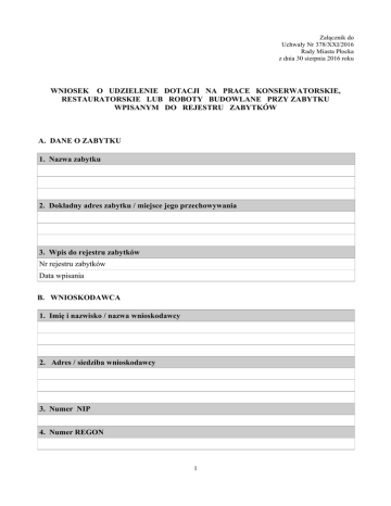 Załącznik do Uchwały Nr 378/XXI/2016 Rady Miasta Płocka z dnia 30 sierpnia 2016 roku WNIOSEK O UDZIELENIE DOTACJI NA PRACE KONSERWATORSKIE, RESTAURATORSKIE LUB ROBOTY BUDOWLANE PRZY ZABYTKU WPISANYM DO REJESTRU ZABYTKÓW A. DANE O ZABYTKU 1. Nazwa zabytku 2. Dokładny adres zabytku / miejsce jego przechowywania 3. Wpis do rejestru zabytków Nr rejestru zabytków Data wpisania B. WNIOSKODAWCA 1. Imię i nazwisko / nazwa wnioskodawcy 2. Adres / siedziba wnioskodawcy 3. Numer NIP 4. Numer REGON 1 5. Forma prawna 6. Nazwa, nr rejestru / ewidencji, data wpisu 7. Osoby upoważnione do reprezentowania wnioskodawcy, składania oświadczeń woli i zaciągania w jego imieniu zobowiązań finansowych (imię, nazwisko, stanowisko, nr telefonu) 8. Osoba odpowiedzialna za przygotowanie wniosku i kontakty z Urzędem Miasta Płocka (imię, nazwisko, nr telefonu) 9. Tytuł do władania zabytkiem 10. Nazwa banku i numer konta wnioskodawcy C. SZCZEGÓŁOWE INFORMACJE O PRACACH LUB ROBOTACH PRZY ZABYTKU 1. Opis prac lub robót budowlanych, które mają być objęte wnioskiem 2 2. Uzasadnienie celowości prac lub robót budowlanych przy zabytku (ranga zabytkowo artystyczna zabytku, stan zachowania zabytku, itp.) 3. Planowany termin wykonania prac lub robót budowlanych objętych wnioskiem 4. Uzyskane pozwolenie konserwatorskie na przeprowadzenie prac lub robót budowlanych objętych wnioskiem Nr z dnia 5. Uzyskane pozwolenie na budowę Nr z dnia 6. Ogółem koszty realizacji prac lub robót budowlanych objętych wnioskiem 7. Wnioskowana kwota dotacji z Budżetu Miasta Płocka w PLN 8. Wysokość dotacji, o jaką ubiega się wnioskodawca, wyrażona w % stosunku do ogólnych kosztów prac 9. Wnioskodawca ma możliwość odliczenia poniesionego kosztu podatku VAT Tak / nie1 3 D. WYKAZ ZAŁĄCZNIKÓW SKŁADANYCH DO WNIOSKU Lp. Tak / nie2 Nazwa załącznika 1. dokument potwierdzający posiadanie przez wnioskodawcę tytułu prawnego do zabytku 2. dokument potwierdzający formę prawną wnioskodawcy 3. dokument upoważniający osobę/osoby do reprezentowania wnioskodawcy 4. kosztorys na wnioskowany zakres prac3 5. zalecenia konserwatorskie 6. decyzja właściwego organu ochrony zabytków zezwalająca na przeprowadzenie prac lub robót budowlanych objętych wnioskiem 7. pozwolenie na budowę 8. projekt budowlany zawierający opis prac lub robót budowlanych objętych wnioskiem 9. program prac objętych wnioskiem 10. informacja o pomocy publicznej otrzymanej przed dniem złożenia wniosku sporządzona w zakresie i na zasadach określonych w art. 37 ustawy z dnia 30.04.2004 r. o postępowaniu w sprawach dotyczących pomocy publicznej (tekst jednolity Dz.U. z 2007 r. Nr 59 poz. 404 z późniejszymi zmianami) E. PODPISY Podpis wnioskodawcy / osób upoważnionych do reprezentowania wnioskodawcy ………………………………… …………………………………………. (miejscowość, data) (podpis/y, pieczęć wnioskodawcy) 1 Zaznaczyć właściwe Jeżeli wnioskodawca dołącza do wniosku dany załącznik należy wpisać wyraz „tak”, w przeciwnym przypadku wyraz „nie” 3 Kosztorys dotyczący robót budowlanych powinien zawierać następujące elementy: stronę tytułową, szczegółowy przedmiar robót, tabelę wartości elementów scalonych sporządzoną w postaci sumarycznego zestawienia wartości robót określonych przedmiarem robót, łącznie z narzutami kosztów pośrednich, kosztów zakupu i zysku, odniesionych do elementów obiektu, kalkulacje szczegółowe cen jednostkowych oraz uwzględniać wartość netto i brutto. Kosztorys winien być sporządzony w oparciu o ceny III kwartału roku złożenia wniosku według publikacji Sekocenbud 2 4