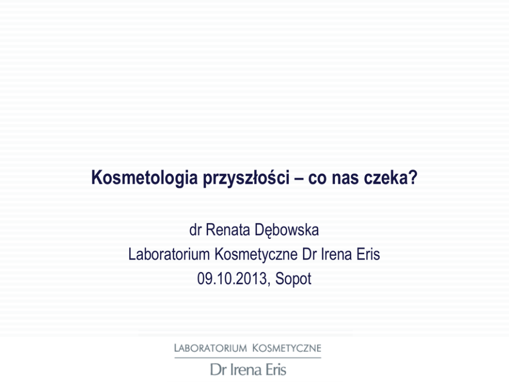 Kosmetologia przyszłości – co nas czeka? dr Renata Dębowska Laboratorium Kosmetyczne Dr Irena Eris 09.10.2013, Sopot Agenda 1. 2. 3. 4. 5. Czym jest kosmetologia? Trendy Teorie starzenia się organizmu Nowe rozwiązania I co dalej? Kosmetologia • jedna z nauk biologicznych • połączenie kosmetyki pielęgnacyjnej z aspektami fizjologii skóry jako narządu integrującego człowieka z otaczającym go światem bodźców zewnętrznych • nauka interdyscyplinarna: współczesną kosmetologią zajmują się specjaliści wielu dziedzin naukowych: lekarze, farmaceuci, biofizycy, chemicy i biochemicy, farmakolodzy, biolodzy molekularni, a także genetycy i wielu innych Kosmetologia • wiedza o kosmetykach i sposobach ich stosowania • interakcja nauk medycznych i chemicznych w celu uzyskania kosmetyków • stosowanie kosmetyków w celu pielęgnacji i upiększania skóry twarzy i ciała • stosowanie kosmetyków w celu osiągnięcia stanu dobrego samopoczucia Trendy Kreatorzy: • my sami, jako konsumenci • naukowcy (zarówno ci związani z branżą, którzy tworzą rozwiązania na potrzeby kosmetologii, jak i ci, którzy tworzą naukę – a my czerpiemy z ich osiągnięć, wynajdujemy nowinki i próbujemy zastosować je w kosmetykach) • firmy poszukujące nowych cząsteczek/ nowych roślin/ dokonujące selekcji związków pod kątem specyficznego działania • marketing, który poszukuje nisz konsumenckich i próbuje „trafić” w rynek Trendy Trendy są wynikiem przeplatania się i współdziałania bardzo wielu czynników: • Konsumenci (jacy są obecnie - oszczędni, rozważniejsi, lepiej poinformowani, ostrożni i pragmatyczni) Zróżnicowanie i specjalizacja kosmetyków: kilka lat temu: jeden krem o działaniu ogólnym Nowe potrzeby: szybki rozwój asortymentu kosmetyków: peelingi, koncentraty, serum Wzrost wymagań konsumentów: kosmetyk powinien działać szybko, być skutecznym, bezpiecznym i innowacyjnym • Wzory konsumpcji (obecnie - mniej kupuje i mniej marnuje) Trendy • Tworzenie coraz to nowszych teorii starzenia się organizmu, w tym także i skóry • Odkrywanie nowych mechanizmów i reakcji skóry oraz kreowanie substancji wpływających na te mechanizmy, nowe koncepcje działania substancji czynnych • Poszukiwanie nowych cząsteczek lub szukanie nowych funkcji już istniejących substancji www.forbes.pl Trend: Ekologia • Najbardziej „medialny trend”. • Będzie się utrzymywał nadal, przybierając różną siłę w zależności od kraju i dojrzałości społeczeństwa. • Kosmetyki naturalne często wymiennie stosowany termin z kosmetykami ekologicznymi nie mają niestety określonej prawnie definicji. • Mówiąc o kosmetykach naturalnych czy ekologicznych nie zawężamy się już w tej chwili tylko do masy kosmetyku. To już jest pojęcie bardziej całościowe. Dotyczy także opakowania w jakie zapakowany jest kosmetyk. www.samouzdrawianie.pl Trend: BB, CC, DD, EE … BB – blemish beauty, beauty balm CC – cream control, control colour cream DD – daily defense EE – early elimination FF – fantastic foundation GG – gene generation HH – …. ? wizaz.pl Trend: Zaawansowane technologie Długie lata badań, liczne patenty, skomplikowane nazwy i mechanizmy działania to warunki konieczne, które określają kosmetyki tego trendu. Peptydy Mitochondria Telomery Chromosomy Proteasomy Genomics Proteomics Glycomics Trend: Roślinne komórki macierzyste Ekstrakty roślinne, bogate w komórki macierzyste: • Stymulują żywotność komórek macierzystych skóry • Stymulują regenerację • Działanie dodatkowe np. ochrona przed UV, stymulacja białek opiekuńczych Trend: Z upływem lat … Teoria genowa (zanik pamięci komórkowej, mutacje, zahamowanie możliwości naprawczych, wyciszenie genów) Teoria telomerowa Teoria zaburzeń białkowych Teoria błonowa Teoria mitochondrialna Trend: Z upływem lat … Teoria hormonalna Teoria glikacji Teoria białek głodu Miostarzenie Teoria ograniczonej liczby podziałów (teoria Hayflicka) Inflamm-ageing www.adwentysci.waw.pl Telomerowa teoria starzenia Telomerowa teoria starzenia Palenie tytoniu powoduje skracanie się telomerów o 5 par zasad ale… Otyłość już o 240 par zasad A Stres – o kolejne 550… Co dodaje nam od 9 do 17 lat więcej… Telomerowa teoria starzenia Mechanizm działania substancji aktywnych • Wpływ na ekspresję genu telomerazy? • Stabilizacja końcówek chromosomów • Wydłużenie czasu życia komórek skóry Teoria glikacji • Proces nieenzymatycznego przyłączania się reszt cukrowych glukozy i fruktozy do białek np. kolagenu, elastyny • Tworzenie AGE (advanced glycation end-products) • Zmienia całkowicie strukturę białek • Nasila się w stanach hiperglikemii Teoria białek głodu: Sirtiuny • Należą do rodziny enzymów określanych jako NAD+-zależne deacetylazy histonowe • W organizmach ssaków zidentyfikowano siedem homologów należących do rodziny białek Sir2 (SIRT 1-7) • Białka głodu i długowieczności • Zwiększają odporność na stres i chronią komórkę • Zmniejszają stany zapalne, neurodegradację oraz hamują programowaną śmierć komórki www.resweratrol.pl Mitochondrialna teoria starzenia Mechanizm działania substancji aktywnych • • • • • Stymulacja syntezy katalazy i SOD Stymulacja syntezy ATP Stymulacja aktywności oksydazy cytochromu C Ochrona mtDNA – zwiększenie syntezy akonitazy Aktywacja sirtuin (enzymów długowieczności) medcurious.blox.pl Teoria genowa Enzymy naprawiające DNA Mają zdolność do naprawy uszkodzonego przez UV DNA komórek. • • fotoliaza katalizuje proces fotoreaktywacji endonukleaza zaś usuwa powstałe uszkodzenia poprzez mechanizm wycinania Sinice Anacystis nidulans – fotoliaza Bakterie Micrococcus luteus – endonukleaza Teoria genowa Fotoliaza • Redukuje apoptozę, produkcję IL-6 • Zapewnia właściwe działanie ICAM-1 Chroni system immunologiczny skóry, 
