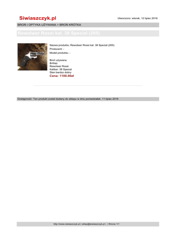 Siwiaszczyk.pl Utworzono: wtorek, 12 lipiec 2016 BROŃ I OPTYKA UŻYWANA > BROŃ KRÓTKA Rewolwer Rossi kal. 38 Special (205) Nazwa produktu: Rewolwer Rossi kal. 38 Special (205) Producent: Model produktu: Broń używana. Rewolwer Rossi Kaliber: 38 Special Stan bardzo dobry Cena: 1100.00zł Dostępność: Ten produkt został dodany do sklepu w dniu poniedziałek, 11 lipiec 2016 http://www.siwiaszczyk.pl | [email protected] | | Strona 1/1