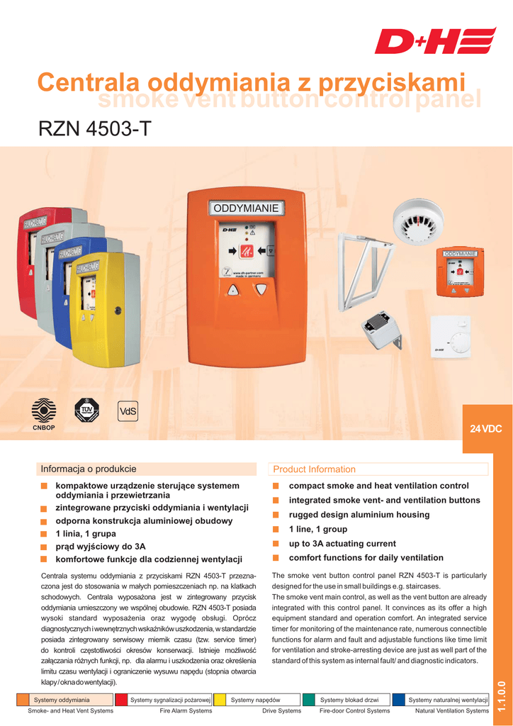Centrala oddymiania z przyciskami smoke vent button control panel RZN 4503-T ODDYMIANIE 24VDC CNBOP Informacja o produkcie Product Information kompaktowe urządzenie sterujące systemem oddymiania i przewietrzania zintegrowane przyciski oddymiania i wentylacji odporna konstrukcja aluminiowej obudowy 1 linia, 1 grupa prąd wyjściowy do 3A komfortowe funkcje dla codziennej wentylacji Systemy oddymiania Smoke- and Heat Vent Systems Systemy sygnalizacji pożarowej Fire Alarm Systems integrated smoke vent- and ventilation buttons rugged design aluminium housing 1 line, 1 group up to 3A actuating current comfort functions for daily ventilation The smoke vent button control panel RZN 4503-T is particularly designed for the use in small buildings e.g. staircases. The smoke vent main control, as well as the vent button are already integrated with this control panel. It convinces as its offer a high equipment standard and operation comfort. An integrated service timer for monitoring of the maintenance rate, numerous connectible functions for alarm and fault and adjustable functions like time limit for ventilation and stroke-arresting device are just as well part of the standard of this system as internal fault/ and diagnostic indicators. Systemy napędów Drive Systems Systemy blokad drzwi Fire-door Control Systems Systemy naturalnej wentylacji Natural Ventilation Systems 1.1.0.0 Centrala systemu oddymiania z przyciskami RZN 4503-T przeznaczona jest do stosowania w małych pomieszczeniach np. na klatkach schodowych. Centrala wyposażona jest w zintegrowany przycisk oddymiania umieszczony we wspólnej obudowie. RZN 4503-T posiada wysoki standard wyposażenia oraz wygodę obsługi. Oprócz diagnostycznych i wewnętrznych wskaźników uszkodzenia, w standardzie posiada zintegrowany serwisowy miernik czasu (tzw. service timer) do kontroli częstotliwości okresów konserwacji. Istnieje możliwość załączania różnych funkcji, np. dla alarmu i uszkodzenia oraz określenia limitu czasu wentylacji i ograniczenie wysuwu napędu (stopnia otwarcia klapy/oknadowentylacji). compact smoke and heat ventilation control RZN 4503-T Parametry - - - Features posiada dopuszczenia zgodne z EN 12101-9 i 10 kompaktowa budowa, dla całkowitego prądu napędów do 3A stabilizowane napięcie wyjściowe zintegrowany przycisk oddymiania zintegrowany przycisk przewietrzania, może być wyłączony możliwość podłączenia do 8 przycisków oddymiania i 14 czujek pożarowych dozwolone stosowanie jedynie czujek dopuszczonych przez D+H możliwość przełączania funkcji bezpieczeństwa systemu oddymiania: uszkodzenie = alarm, resetowanie systemu oddymiania oraz zdalne resetowanie czujek dymowych 2 programowalne bezpotencjałowe styki NO/NC możliwość podłączenia czujek pogodowych bez stosowania dodatkowych modułów zamykana aluminiowa osłona do montażu natynkowego możliwość podłączenia optycznych i akustycznych urządzeń sygnalizacji zadziałania 72 godziny awaryjnego zasilania w przypadku przerwy w dostawach zasilania sieciowego ochrona przed nadmiernym rozładowaniem akumulatora i kontrola jego stanu dzięki specjalnej elektronice potrzebny tylko jeden akumulator 12 V (typ 3A) w ofercie D+H jako akcesoria dostępne są przyciski oddymiania i przewietrzania, napędy elektryczne, automatyczne czujki pożarowe oraz urządzenia sterujące automatyką pogodową i regulujące temperaturę w pomieszczeniu system monitorowania przewodów pod kątem występowania zwarcia i przerwania. Przykład zastosowania - - approval according to pr EN 12101-9 and DIN EN 12101-10, as well as VdS 2581 and VdS 2593 requested compact style, for 3A actuating current stabilized output voltage integrated smoke vent main control integrated vent button, can be switched off connection of max. 8 smoke vent buttons and 14 fire detectors only D+H approved detectors permissible switchable smoke vent safety functions: fault = alarm, smoke vent resetting and smoke detector remote reset 2 programmable, potential free contacts possibility of connecting rain detectors or wind/ rain detectors without supplementary module lockable aluminium housing for surface mounting simple assembly by separation from mounting plate and housing upper part connection possibility for visual and acoustical alarm devices 72 hours emergency supply in case of power failure accumulator deep discharge protection and status check by special electronics only one 12V Accu (type 8) necessarily smoke vent and vent buttons, window drives, automatic fire detectors including wind, rain and room temperature controls available as accessories in D+H-program line monitoring for short circuit and interruption Example for Application Czujka deszczowa rain detector Napęd okienny window drive Czujka pożarowa fire detector Adapter koryta kablowego Cable conduit-adapter KK 4503 max. 65 x 40 mm Grupa / group Linia / line E NI IA M DY OD NIE IA M DY OD OK Przycisk oddymiania smoke vent button Centrala systemu oddymiania, Typ RZN 4503-T smoke vent control panel, type RZN 4503-T Dane techniczne Technical Data zasilanie / power supply ~230 V/50Hz, 90VA wyjście / output =24VDC (21,6 ... 26,4V), maks. 3A Typ Type Nr art. Ord.-No. Waga Weight Uwagi Comment RZN 4503-T 30.107.30 1,40kg RZN 4503-T/G 30.107.40 1,40kg RZN 4503-T/B 30.107.50 1,40kg · monitorowanie / monitoring · alarm/wentylacja/alarm/ventilation Praca ciągła / continuous duty Praca krótkotrwała / short-time duty (20% ED) stopień ochrony / protective system IP 30 RZN 4503-T/Y 30.107.60 1,40kg zakres temp. / range of temp. od -5°C do +55°C RZN 4503-T/R 30.107.70 1,40kg Kolor pokrywy: pomarańczowy (~ RAL 2011) cover colour: orange (~ RAL 2011) Kolor pokrywy: szary (~ RAL 7035) cover colour: grey (~ RAL 7035) Kolor pokrywy: niebieski (~ RAL 5009) cover colour: blue (~ RAL 5009) Kolor pokrywy: żółty (~ RAL 1004) cover colour: yellow (~ RAL 1004) Kolor pokrywy: czerowy (~ RAL 3000) cover colour: red (~ RAL 3000) wymiary / dim