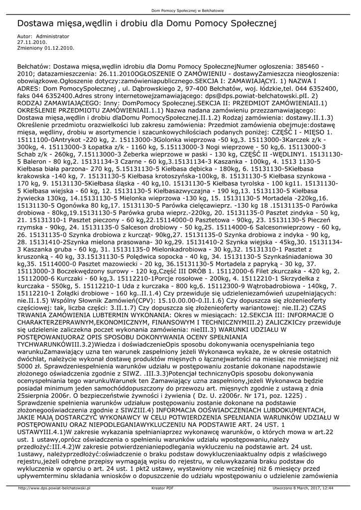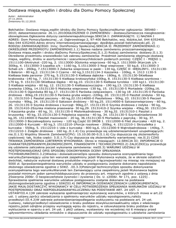 Dom Pomocy Społecznej w Bełchatowie Dostawa mięsa,wędlin i drobiu dla Domu Pomocy Społecznej Autor: Administrator 27.11.2010. Zmieniony 01.12.2010. Bełchatów: Dostawa mięsa,wędlin idrobiu dla Domu Pomocy SpołecznejNumer ogłoszenia: 385460 2010; datazamieszczenia: 26.11.2010OGŁOSZENIE O ZAMÓWIENIU - dostawyZamieszcza nieogłoszenia: obowiązkowe.Ogłoszenie dotyczy:zamówieniapublicznego.SEKCJA I: ZAMAWIAJĄCYI. 1) NAZWA I ADRES: Dom PomocySpołecznej , ul. Dąbrowskiego 2, 97-400 Bełchatów, woj. łódzkie,tel. 044 6352400, faks 044 6352400.Adres strony internetowejzamawiającego: [email protected]. 2) RODZAJ ZAMAWIAJĄCEGO: Inny: DomPomocy Społecznej.SEKCJA II: PRZEDMIOT ZAMÓWIENIAII.1) OKREŚLENIE PRZEDMIOTU ZAMÓWIENIAII.1.1) Nazwa nadana zamówieniu przezzamawiającego: Dostawa mięsa,wędlin i drobiu dlaDomu PomocySpołecznej.II.1.2) Rodzaj zamówienia: dostawy.II.1.3) Określenie przedmiotu orazwielkości lub zakresu zamówienia: Przedmiot zamówienia obejmuje:dostawę mięsa, wędliny, drobiu w asortymencie i szacunkowychilościach podanych poniżej: CZĘŚĆ I - MIĘSO 1. 15111100-0Antrykot -220 kg, 2. 15113000-3Golonka wieprzowa -50 kg,3. 15113000-3Karczek z/k 300kg, 4. 15113000-3 Łopatka z/k - 1160 kg, 5.15113000-3 Nogi wieprzowe - 50 kg,6. 15113000-3 Schab z/k - 260kg, 7.15113000-3 Żeberka wieprzowe w paski - 130 kg, CZĘŚĆ II -WĘDLINY1. 151311305 Baleron - 80 kg,2. 15131134-3 Czarne - 60 kg,3.15131134-3 Kaszanka - 100kg, 4. 1513 1130-5 Kiełbasa biała parzona- 270 kg, 5.15131130-5 Kiełbasa dębicka - 180kg, 6. 15131130-5Kiełbasa krakowska -140 kg, 7. 15131130-5 Kiełbasa krotoszyńska-100kg, 8. 15131130-5 Kiełbasa szynkowa 170 kg, 9. 15131130-5Kiełbasa śląska - 40 kg,10. 15131130-5 Kiełbasa tyrolska - 100 kg11. 151311305 Kiełbasa wiejska - 60 kg, 12. 15131130-5 Kiełbasazwyczajna - 190 kg,13. 15131130-5 Kiełbasa żywiecka 130kg, 14.15131130-5 Mielonka wieprzowa -130 kg, 15. 15131130-5 Mortadela -220kg,16. 15131130-5 Ogonówka 80 kg,17. 15131130-5 Parówka cielęcawieprz. -130 kg 18 .15131135-0 Parówka drobiowa - 80kg,19.15131130-5 Parówka gruba wieprz.-220kg, 20. 15131135-0 Pasztet zindyka - 50 kg, 21. 15131310-1 Pasztet pieczony - 60 kg,22.15114000-0 Pasztetowa - 90kg, 23. 15131130-5 Pieczeń rzymska - 90kg, 24. 15131135-0 Salceson drobiowy - 50 kg,25. 15114000-6 Salcesonwieprzowy - 60 kg, 26. 15131135-0 Szynka drobiowa z kurcząt- 90kg,27. 15131135-0 Szynka drobiowa z indyka - 90 kg, 28. 15131410-2Szynka mielona prasowana- 30 kg,29. 15131410-2 Szynka wiejska - 45kg,30. 151311343 Kaszanka gruba - 60 kg, 31. 15131135-0 Mielonkadrobiowa - 30 kg,32. 15131310-1 Pasztet z kruszonką - 40 kg, 33.15131130-5 Polędwica sopocka - 40 kg, 34. 15131130-5 Szynkaśniadaniowa 30 kg,35. 15114000-0 Pasztet mazowiecki - 20 kg, 36.15131130-5 Mortadela z papryką - 30 kg, 37. 15113000-3 Boczekwędzony surowy - 120 kg,Część III DRÓB 1. 15112000-6 Filet zkurczaka - 420 kg, 2. 15112000-6 Kurczaki - 60 kg,3. 15112210-1Porcje rosołowe - 200kg, 4. 15112210-1 Skrzydełka z kurczaka - 550kg, 5. 15112210-1 Uda z kurczaka - 800 kg,6. 15112300-9 Wątrobadrobiowa - 140kg, 7. 15112210-1 Żołądki drobiowe - 160 kg..II.1.4) Czy przewiduje się udzieleniezamówień uzupełniających: nie.II.1.5) Wspólny Słownik Zamówień(CPV): 15.10.00.00-0.II.1.6) Czy dopuszcza się złożenieoferty częściowej: tak, liczba części: 3.II.1.7) Czy dopuszcza się złożenieoferty wariantowej: nie.II.2) CZAS TRWANIA ZAMÓWIENIA LUBTERMIN WYKONANIA: Okres w miesiącach: 12.SEKCJA III: INFORMACJE O CHARAKTERZEPRAWNYM,EKONOMICZNYM, FINANSOWYM I TECHNICZNYMIII.2) ZALICZKICzy przewiduje się udzielenie zaliczekna poczet wykonania zamówienia: nieIII.3) WARUNKI UDZIAŁU W POSTĘPOWANIUORAZ OPIS SPOSOBU DOKONYWANIA OCENY SPEŁNIANIA TYCHWARUNKÓWIII.3.2)Wiedza i doświadczenieOpis sposobu dokonywania ocenyspełniania tego warunkuZamawiający uzna ten warunek zaspełniony jeżeli Wykonawca wykaże, że w okresie ostatnich dwóchlat, należycie wykonał dostawę produktów mięsnych o łącznejwartości na miesiąc nie mniejszej niż 5000 zł. Sprawdzeniespełnienia warunków udziału w postępowaniu zostanie dokonane napodstawie złożonego oświadczenia zgodnie z SIWZ. .III.3.3)Potencjał technicznyOpis sposobu dokonywania ocenyspełniania tego warunkuWarunek ten Zamawiający uzna zaspełniony,jeżeli Wykonawca będzie posiadał minimum jeden samochóddopuszczony do przewozu art. mięsnych zgodnie z ustawą z dnia 25sierpnia 2006r. O bezpieczeństwie żywności i żywienia ( Dz. U. z2006r. Nr 171, poz. 1225) . Sprawdzenie spełnienia warunków udziałuw postępowaniu zostanie dokonane na podstawie złożonegooświadczenia zgodnie z SIWZIII.4) INFORMACJA OOŚWIADCZENIACH LUBDOKUMENTACH, JAKIE MAJĄ DOSTARCZYĆ WYKONAWCY W CELU POTWIERDZENIA SPEŁNIANIA WARUNKÓW UDZIAŁU W POSTĘPOWANIU ORAZ NIEPODLEGANIAWYKLUCZENIU NA PODSTAWIE ART. 24 UST. 1 USTAWYIII.4.1)W zakresie wykazania spełnianiaprzez wykonawcę warunków, o których mowa w art.22 ust. 1 ustawy,oprócz oświadczenia o spełnieniu warunków udziału wpostępowaniu,należy przedłożyć:III.4.2)W zakresie potwierdzenianiepodlegania wykluczeniu na podstawie art. 24 ust. 1ustawy, należyprzedłożyć:oświadczenie o braku podstaw dowykluczeniaaktualny odpis z właściwego rejestru,jeżeli odrębne przepisy wymagają wpisu do rejestru, w celuwykazania braku podstaw do wykluczenia w oparciu o art. 24 ust. 1 pkt2 ustawy, wystawiony nie wcześniej niż 6 miesięcy przed upływemterminu składania wniosków o dopuszczenie do udziału wpostępowaniu o udzielenie zamówienia http://www.dps.powiat-belchatowski.pl Kreator PDF Utworzono 8 March, 2017, 12:44 Dom Pomocy Społecznej w Bełchatowie albo składania ofert, a wstosunku do osób fizycznych oświadczenie w zakresie art. 24 ust. 1pkt 2 ustawyIII.7) Czy ogranicza się możliwośćubiegania się o zamówienie publiczne tylko dla wykonawców, uktórych ponad 50 % pracowników stanowią osoby 