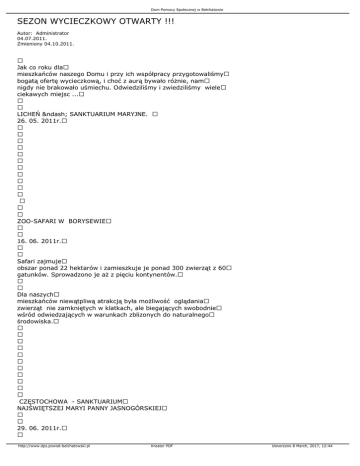 Dom Pomocy Społecznej w Bełchatowie SEZON WYCIECZKOWY OTWARTY !!! Autor: Administrator 04.07.2011. Zmieniony 04.10.2011. Jak co roku dla mieszkańców naszego Domu i przy ich współpracy przygotowaliśmy bogatą ofertę wycieczkową, i choć z aurą bywało różnie, nam nigdy nie brakowało uśmiechu. Odwiedziliśmy i zwiedziliśmy wiele ciekawych miejsc ... LICHEŃ – SANKTUARIUM MARYJNE. 26. 05. 2011r. ZOO-SAFARI W BORYSEWIE 16. 06. 2011r. Safari zajmuje obszar ponad 22 hektarów i zamieszkuje je ponad 300 zwierząt z 60 gatunków. Sprowadzono je aż z pięciu kontynentów. Dla naszych mieszkańców niewątpliwą atrakcją była możliwość oglądania zwierząt nie zamkniętych w klatkach, ale biegających swobodnie wśród odwiedzających w warunkach zblizonych do naturalnego środowiska. CZĘSTOCHOWA - SANKTUARIUM NAJŚWIĘTSZEJ MARYI PANNY JASNOGÓRSKIEJ 29. 06. 2011r. http://www.dps.powiat-belchatowski.pl Kreator PDF Utworzono 8 March, 2017, 12:44 Dom Pomocy Społecznej w Bełchatowie Każdego roku jeżeli tylko pogoda dopisuje nasi mieszkańcy wyruszają w podróż do Częstochowy, aby w Sanktuarium Najswiętszej Maryi Panny Jasnogórskiej, przed Cudownym Obrazem złożyć swoje prośby i dziękczynienia. Przy okazji zwiedzili wały i budynki sanktuarium. http://www.dps.powiat-belchatowski.pl Kreator PDF Utworzono 8 March, 2017, 12:44