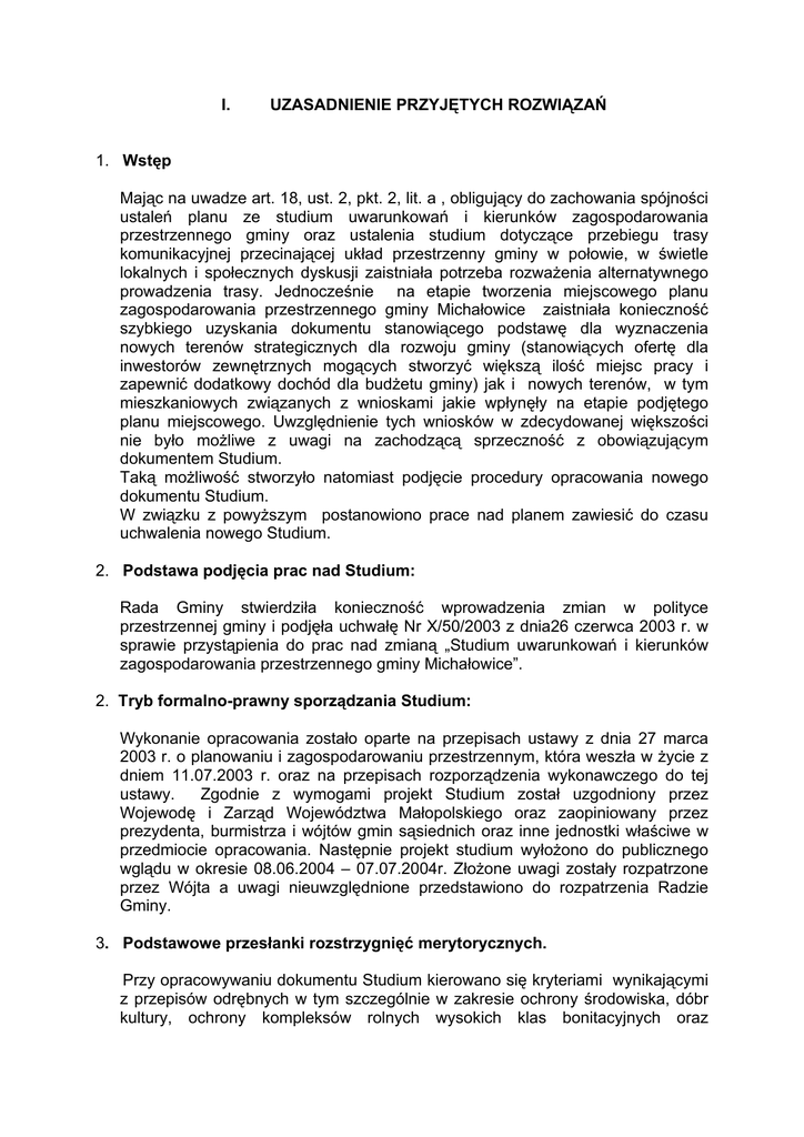 I. UZASADNIENIE PRZYJĘTYCH ROZWIĄZAŃ 1. Wstęp Mając na uwadze art. 18, ust. 2, pkt. 2, lit. a , obligujący do zachowania spójności ustaleń planu ze studium uwarunkowań i kierunków zagospodarowania przestrzennego gminy oraz ustalenia studium dotyczące przebiegu trasy komunikacyjnej przecinającej układ przestrzenny gminy w połowie, w świetle lokalnych i społecznych dyskusji zaistniała potrzeba rozważenia alternatywnego prowadzenia trasy. Jednocześnie na etapie tworzenia miejscowego planu zagospodarowania przestrzennego gminy Michałowice zaistniała konieczność szybkiego uzyskania dokumentu stanowiącego podstawę dla wyznaczenia nowych terenów strategicznych dla rozwoju gminy (stanowiących ofertę dla inwestorów zewnętrznych mogących stworzyć większą ilość miejsc pracy i zapewnić dodatkowy dochód dla budżetu gminy) jak i nowych terenów, w tym mieszkaniowych związanych z wnioskami jakie wpłynęły na etapie podjętego planu miejscowego. Uwzględnienie tych wniosków w zdecydowanej większości nie było możliwe z uwagi na zachodzącą sprzeczność z obowiązującym dokumentem Studium. Taką możliwość stworzyło natomiast podjęcie procedury opracowania nowego dokumentu Studium. W związku z powyższym postanowiono prace nad planem zawiesić do czasu uchwalenia nowego Studium. 2. Podstawa podjęcia prac nad Studium: Rada Gminy stwierdziła konieczność wprowadzenia zmian w polityce przestrzennej gminy i podjęła uchwałę Nr X/50/2003 z dnia26 czerwca 2003 r. w sprawie przystąpienia do prac nad zmianą „Studium uwarunkowań i kierunków zagospodarowania przestrzennego gminy Michałowice”. 2. Tryb formalno-prawny sporządzania Studium: Wykonanie opracowania zostało oparte na przepisach ustawy z dnia 27 marca 2003 r. o planowaniu i zagospodarowaniu przestrzennym, która weszła w życie z dniem 11.07.2003 r. oraz na przepisach rozporządzenia wykonawczego do tej ustawy. Zgodnie z wymogami projekt Studium został uzgodniony przez Wojewodę i Zarząd Województwa Małopolskiego oraz zaopiniowany przez prezydenta, burmistrza i wójtów gmin sąsiednich oraz inne jednostki właściwe w przedmiocie opracowania. Następnie projekt studium wyłożono do publicznego wglądu w okresie 08.06.2004 – 07.07.2004r. Złożone uwagi zostały rozpatrzone przez Wójta a uwagi nieuwzględnione przedstawiono do rozpatrzenia Radzie Gminy. 3. Podstawowe przesłanki rozstrzygnięć merytorycznych. Przy opracowywaniu dokumentu Studium kierowano się kryteriami wynikającymi z przepisów odrębnych w tym szczególnie w zakresie ochrony środowiska, dóbr kultury, ochrony kompleksów rolnych wysokich klas bonitacyjnych oraz zapewnienia warunków bezpieczeństwa. Jednocześnie mając na uwadze potrzebę rozwoju społeczno-gospodarczego gminy, uwzględniając wyżej wymienione uwarunkowania stworzono warunki dla: - zwiększenia efektywności wykorzystania rolniczej przestrzeni produkcyjnej poprzez restrukturyzację rolnictwa; - rozwoju w sektorze pozarolniczym w tym szczególnie zakładów produkcji i przetwórstwa rolnego, drobnej wytwórczości i rzemiosła (jednocześnie zabezpieczono tereny dla pozyskania inwestorów zewnętrznych dających nowe miejsca pracy); - poprawy jakości i dalszego rozwoju usług w sektorze publicznym i komercyjnym; - poprawy i osiągnięcia wysokiego standardu warunków życia mieszkańców w tym szczególnie dla realizacji programu mieszkaniowego w celu zaspokojenia lokalnych potrzeb; - rozwoju infrastruktury technicznej, poprawę funkcjonowania komunikacji. Rozstrzygnięcia planistyczne nastąpiły przede wszystkim przy uwzględnieniu wymogów ładu przestrzennego i zapewnienia zrównoważonego rozwoju, natomiast powiększanie terenów budowlanych przy określonym wyżej zachowaniu wartości środowiska przyrodniczego, kulturowego i walorów krajobrazowych. Tereny przeznaczone pod zainwestowanie wyznaczono jako poszerzenie i porządkowanie istniejących terenów budowlanych. Przy sporządzaniu aktualizacji Studium uwzględniono generalnie politykę przestrzenną wynikającą z dotychczasowych opracowań planistycznych, dokonując niezbędnych korekt w zakresie wyżej opisanym, uwzględniając równocześnie ustalenia uchwalonego planu zagospodarowania przestrzennego województwa małopolskiego. W sytuacji kontrowersyjnego przebiegu drogi ekspresowej S7 przebiegającej przez centralną część gminy i powodującej jej podział na dwie części zaproponowano nowy przebieg trasy S7 poprzez jej przesunięcie z centralnej części gminy w okolice wschodniej granicy administracyjnej. Dla przedmiotowego przedsięwzięcia alternatywnego przebiegu trasy prowadzone są prace techniczne uwzględniające funkcjonalne i ekonomiczne aspekty oraz analizy porównawcze wariantów. Ostateczny wybór wariantu powinien nastąpić na etapie planu miejscowego gminy. II. SYNTEZA USTALEŃ STUDIUM 1. Zgodnie z uchwaloną strategią rozwoju gminy Michałowice jako główny cel rozwoju gminy przyjęto osiągnięcie takiego poziomu rozwoju w sąsiedztwie Wielkiego Krakowa, który będzie satysfakcjonował mieszkańców gminy, a przede wszystkim zapewniał ciągłą poprawę ich warunków życia przy wykorzystaniu i zachowaniu walorów przestrzennych (w tym szczególnie przyrodniczych) oraz dziedzictwa kulturowego. Przyjęto następujące cele strategiczne wynikające z celu głównego: 1) poprawę walorów ochrony środowiska; 2) ochronę istniejących wartości kulturowych; 3) zabezpieczenie realizacji zadań publicznych związanych z wysoką jakością obsługi ponadlokalnej; 4) zwiększenie efektywności wykorzystania rolniczej przestrzeni produkcyjnej oraz tworzenie warunków dla rozwoju gospodarczego w sektorze pozarolniczym; 5) efektywność wykorzystania mienia gminnego; 6) zapewnienie powszechnej dostępności do dóbr, usług i informacji związane z poprawą i osiągnięciem wysokiego standardu warunków życia mieszkańców. 2. W studium przyjęto nas