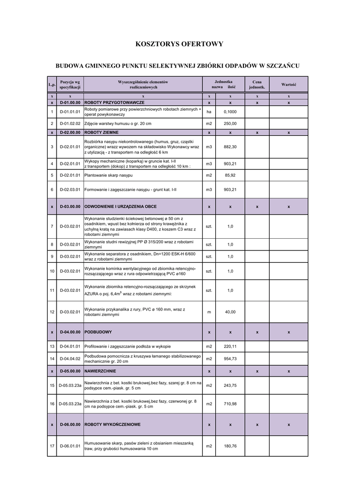 KOSZTORYS OFERTOWY BUDOWA GMINNEGO PUNKTU SELEKTYWNEJ ZBIÓRKI ODPADÓW W SZCZAŃCU L,p. x Pozycja wg specyfikacji Wyszczególnienie elementów rozliczeniowych x Jednostka nazwa ilość Cena jednostk. Wartość x x x x x x D-01.00.00 ROBOTY PRZYGOTOWAWCZE x x x x 1 D-01.01.01 ha 0,1000 2 D-01.02.02 Zdjęcie warstwy humusu o gr. 20 cm m2 250,00 x D-02.00.00 ROBOTY ZIEMNE x x x x 3 Rozbiórka nasypu niekontrolowanego (humus, gruz, cząstki D-02.01.01 organiczne) wrazz wywozem na składowisko Wykonawcy wraz z utylizacją - z transportem na odległość 6 km m3 882,30 4 D-02.01.01 m3 903,21 5 D-02.01.01 Plantowanie skarp nasypu m2 85,92 6 D-02.03.01 Formowanie i zagęszczanie nasypu - grunt kat. I-II m3 903,21 x D-03.00.00 ODWODNIENIE I URZĄDZENIA OBCE x x x x 7 Wykonanie studzienki ściekowej betonowej ø 50 cm z osadnikiem, wpust bez kołnierza od strony krawężnika z D-03.02.01 uchylną kratą na zawiasach klasy D400, z koszem C3 wraz z robotami ziemnymi szt. 1,0 8 D-03.02.01 Wykonanie studni rewizyjnej PP Ø 315/200 wraz z robotami ziemnymi szt. 1,0 9 D-03.02.01 Wykonanie separatora z osadnikiem, Dn=1200 ESK-H 6/600 wraz z robotami ziemnymi szt. 1,0 10 D-03.02.01 Wykonanie kominka wentylacyjnego od zbiornika retencyjnorozsączającego wraz z rura odpowietrzającą PVC ø160 szt. 1,0 11 D-03.02.01 szt. 1,0 12 D-03.02.01 m 40,00 x D-04.00.00 PODBUDOWY x x x x 13 D-04.01.01 Profilowanie i zagęszczanie podłoża w wykopie m2 220,11 14 D-04.04.02 Podbudowa pomocnicza z kruszywa łamanego stabilizowanego mechanicznie gr. 20 cm m2 954,73 x D-05.00.00 NAWIERZCHNIE x x x x x x Roboty pomiarowe przy powierzchniowych robotach ziemnych + operat powykonawczy Wykopy mechaniczne (koparką) w gruncie kat. I-II z transportem (dokop) z transportem na odległość 10 km : Wykonanie zbiornika retencyjno-rozsączającego ze skrzynek AZURA o poj. 6,4m3 wraz z robotami ziemnymi: Wykonanie przykanalika z rury, PVC ø 160 mm, wraz z robotami ziemnymi 15 D-05.03.23a Nawierzchnia z bet. kostki brukowej,bez fazy, szarej gr. 8 cm na podsypce cem.-piask. gr. 5 cm m2 243,75 16 D-05.03.23a Nawierzchnia z bet. kostki brukowej,bez fazy, czerwonej gr. 8 cm na podsypce cem.-piask. gr. 5 cm m2 710,98 x x m2 180,76 x D-06.00.00 ROBOTY WYKOŃCZENIOWE 17 D-06.01.01 Humusowanie skarp, pasów zieleni z obsianiem mieszanką traw, przy grubości humusowania 10 cm 18 D-06.01.01 x Rozplantowanie nadmiaru humusu na przyległych terenach zielonych – gr. rozplantowania 20 cm m2 69,24 D-08.00.00 ELEMENTY PLACU x x 19 Ułożenie krawężnika betonowego 15x30 cm, na podsypce cem.D-08.01.01 piask. gr. 5 cm i ławie z betonu C8/10 (B10) - 0,08m2 m 152,58 20 Ułożenie krawężnika betonowego 15x22 cm, na podsypce cem.D-08.01.01 piask. gr. 5 cm i ławie z betonu C8/10 (B10) - 0,06m2 m 111,58 x D-10.00.00 INNE ROBOTY x x 21 Wykonanie ogrodzeń systemowych panelowych (wys. 1,7m, szer. 2,5m) z betonową podmurówką min. 250/20/6cm wraz z D-10.01.01 osadzeniem metalowych słupków z profili 60/40/2 mm i wykonaniem stóp fundamentowych betonowych pod słupkami beton C12/15 (B15) - min. 40/40/80cm - kolor zielony m 212,00 22 D-10.01.01 Montaż furtki panelowej systemowej o szer. 1,2 m i wys. 1,7 m kolor zielony szt. 1,0 23 D-10.01.01 Montaż bramy dwuprzęsłowej rozwiernej panelowej systemowej o szer. 5,0 m i wys. 1,7 m - kolor zielony szt. 1,0 24 D-10.01.01 Montaż lamp hybrydowych z oprawami LED 40W z aluminium i hartowanego szkła, wys. 8m., słup ze stali ocynkowanej na fundamencie prefabrykowanym, moc panela min. 2x190W, akumulator 180Ah/12V, turbina wiatrowa 300W kpl. 2,0 OGÓŁEM WARTOŚĆ ROBÓT (netto) x x x x