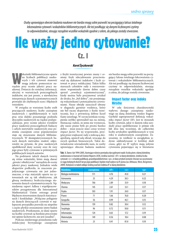 sedno sprawy Osoby uprawiające obecnie badania naukowe nie bardzo mogą sobie pozwolić na pociągający luksus totalnego lekceważenia cytowań i wskaźników bibliometrycznych. Ale też posiłkując się danymi liczbowymi czyńmy to odpowiedzialnie, stosując rozsądnie wszelkie wskaźniki zgodnie z celem, do jakiego zostały stworzone. 3.&4#56&7.-,(&$6%(4#,+.8 9*:& Karol Życzkowski W skaźniki bibliometryczne oparte na liczbach publikacji naukowych i ich cytowań stanowić mogą jedynie pomocnicze narzędzie przy ocenie jakości pracy naukowej. Dotarcie do rzetelnej informacji, ukrytej w wartościach poszczególnych indeksów, nie jest proste, a niewłaściwa interpretacja danych scjentometrycznych prowadzi do chybionych ocen i błędnych wniosków. W związku ze wzrostem liczby osób pracujących naukowo, liczby czasopism naukowych i opublikowanych w nich prac oraz daleko posuniętego podziału dyscyplin naukowych na wąskie podspecjalizacje, przy ocenie jakości wyników pracy naukowej poszczególnych badaczy i całych instytutów naukowych oraz poziomu czasopism coraz popularniejsze staje się stosowanie danych bibliometrycznych. W skomputeryzowanych bazach danych nietrudno znaleźć odpowiedzi na pytanie, ile prac naukowych opublikował dany uczony oraz ile razy jego prace były cytowane w późniejszych publikacjach innych autorów. Na podstawie takich danych tworzy się różne wskaźniki, które mają dawać „proste i obiektywne” narzędzia do oceny jakości pracy naukowej. Jednakże wielu ekspertów podkreśla, że znaczenie pojedynczego cytowania nie jest jednoznaczne, a więc statystyki oparte na cytowaniach nie są tak obiektywne, jak głoszą zwolennicy bezkrytycznego stosowania danych scjentometrycznych. Np. niedawny raport Adlera i współpracowników przygotowany dla International Mathematical Union ostrzega przed błędnym stosowaniem danych statystycznych i konkluduje: „Wyłączne poleganie na danych dotyczących cytowań w najlepszym przypadku pozwala na niepełne i często płytkie zrozumienie istoty badań naukowych. Przekonanie, że dane oparte na liczbie cytowań są bardziej precyzyjne niż opinie fachowców, nie jest zasadne”. Podczas niedawnego posiedzenia rady redakcyjnej brytyjskiego czasopisma Forum Akademickie 10/2011 z fizyki teoretycznej pewien znany i ceniony fizyk zdecydowanie przeciwstawiał się dyktatowi indeksów i liczb cytowań w pracy redakcyjnej. Także kilku starszych członków rady z rozrzewnieniem wspominało dawne dobre czasy sprzed „rewolucji scjentometrycznej”, kiedy można było przyjmować artykuł do druku, bo „był dobry”, nie przejmując się wskaźnikami i potencjalnymi cytowaniami. Nasze obrady zaszczycił ubrany w elegancki garnitur wydawca, który nie był raczej ekspertem z fizyki teoretycznej, lecz z pewnością dobrze liczył funty szterlingi. W swym krótkim wystąpieniu szybko sprowadził nas na ziemię, tłumacząc radzie, że jemu nie wystarcza, aby nasze pismo było po prostu bardzo dobre – musi jeszcze mieć coraz wyższy impact factor. Po tej wypowiedzi, przyjętej przez większość rady z milczącą dezaprobatą, opuścił salę obrad, wracając do swych spotkań biznesowych. Takie doświadczenie uświadomiło nam, że osoby uprawiające obecnie badania naukowe nie bardzo mogą sobie pozwolić na pociągający luksus totalnego lekceważenia cytowań i wskaźników bibliometrycznych. Ale też posiłkując się danymi liczbowymi czyńmy to odpowiedzialnie, stosując rozsądnie wszelkie wskaźniki zgodnie z celem, do jakiego zostały stworzone. !"#$%&'#$%()&()#*&+,-./0& 1+)0$2# W celu ilościowej charakterystyki wpływu danego czasopisma naukowego na daną dziedzinę wiedzy Eugene Garfield zaproponował definicję wskaźnika impact factor (IF). Jest to stosunek liczby cytowań, jakie w danym roku uzyskały prace opublikowane w piśmie rok lub dwa lata wcześniej, do całkowitej liczby artykułów opublikowanych w tym roku w analizowanym czasopiśmie. Zauważmy, że wielkość ta uwzględnia jedynie oddziaływanie w krótkiej skali czasu, gdyż na IF wpływ mają jedynie cytowania pojawiające się w literaturze 5BCDane z lat 1994-2005, ilustrujące różnice pomiędzy dyscyplinami nauki: liczba pism z danej dziedziny analizowana w Journal od Citation Reports (JCR), średnia wartość <IF> w danej dziedzinie, średnia liczba cytowań <c> w każdej publikacji, prawdopodobieństwo <p>, iż dany artykuł zostanie chociaż raz zacytowany w ciągu kolejnych dwóch lat po jego publikacji i będzie miał wpływ na IF pisma (za: Althouse, West, Bergstrom, 2009). Kolejność w tabeli oddaje średnią wartość indeksu IF w danej dziedzinie. Dziedzina czasopisma <IF> <c> <p> Biologia molekularna 511 4.76 45.8 0.21 Astronomia 25 4.29 38.3 0.22 Medycyna 766 2.89 33.9 0.18 Chemia 145 2.61 33.1 0.17 Fizyka 503 1.91 24.0 0.17 Prawo 71 1.66 76.8 0.20 Geografia 56 0.99 46.1 0.15 Ekonomia 159 0.82 30.4 0.12 Socjologia 96 0.72 50.8 0.11 Informatyka 124 0.63 17.2 0.19 Matematyka 149 0.56 18.4 0.08 Historia 23 0.41 81.8 0.10 25 sedno sprawy prac, często tych opublikowanych ostatnio i jest średnio częściej cytowana niż praca z fizyki. Dlatego też średni IF czasopism dotyczących biologii molekularnej (obecnie ponad 4.5) jest istotnie wyższy niż średni IF wynoszący 1.9 dla pism z fizyki. Z kolei proces przygotowania artykułu matematycznego trwa długo, a że w takim artykule zwyczajowo nie ma wielu odnośników, prace matematyczne cytowane są rzadziej, a średni IF czasopism w tej dziedzinie wynosi około 0.5. Szczegółowe dane dotyczące parametrów opisujących statystyki cytowań w różnych dziedzinach wiedzy przedstawiono w tabeli 1 i zilustrowano grafem cytowań przedstawionym na rys. 1. Zwróćmy uwagę, że w swych pracach historycy cytują dużo literatury (średnio ponad 80 pozycji!), matematycy mało, ale w obu przypadkach prawdopodobieństwo, że dany artykuł zostanie zacytowany chociaż raz w ci